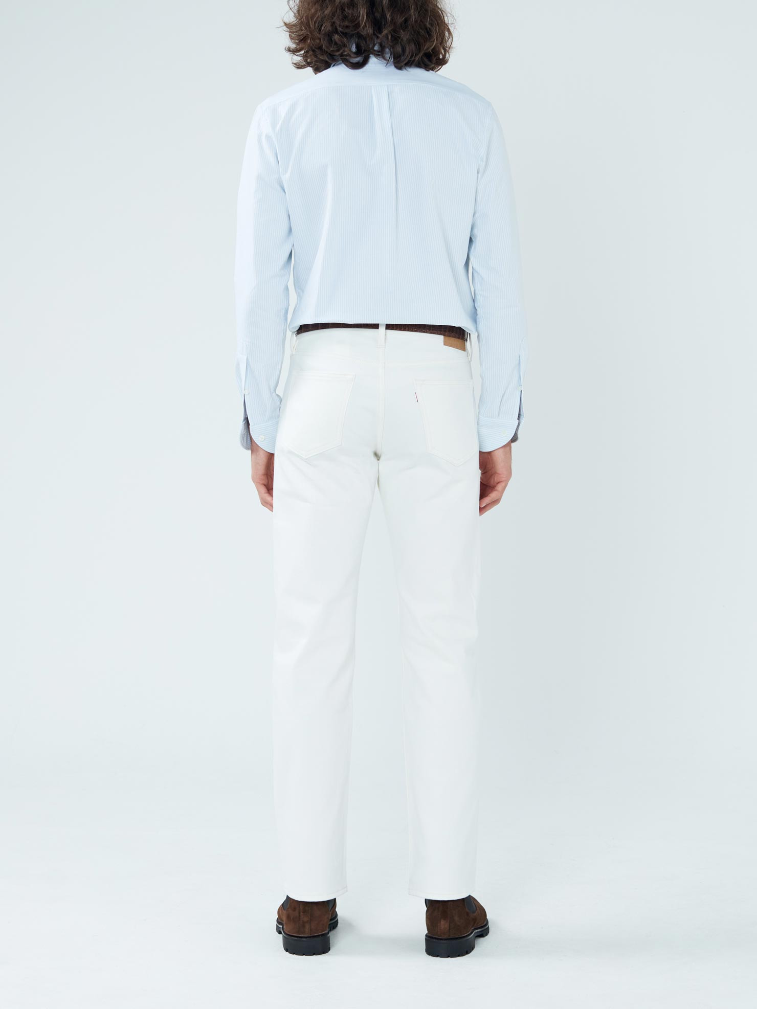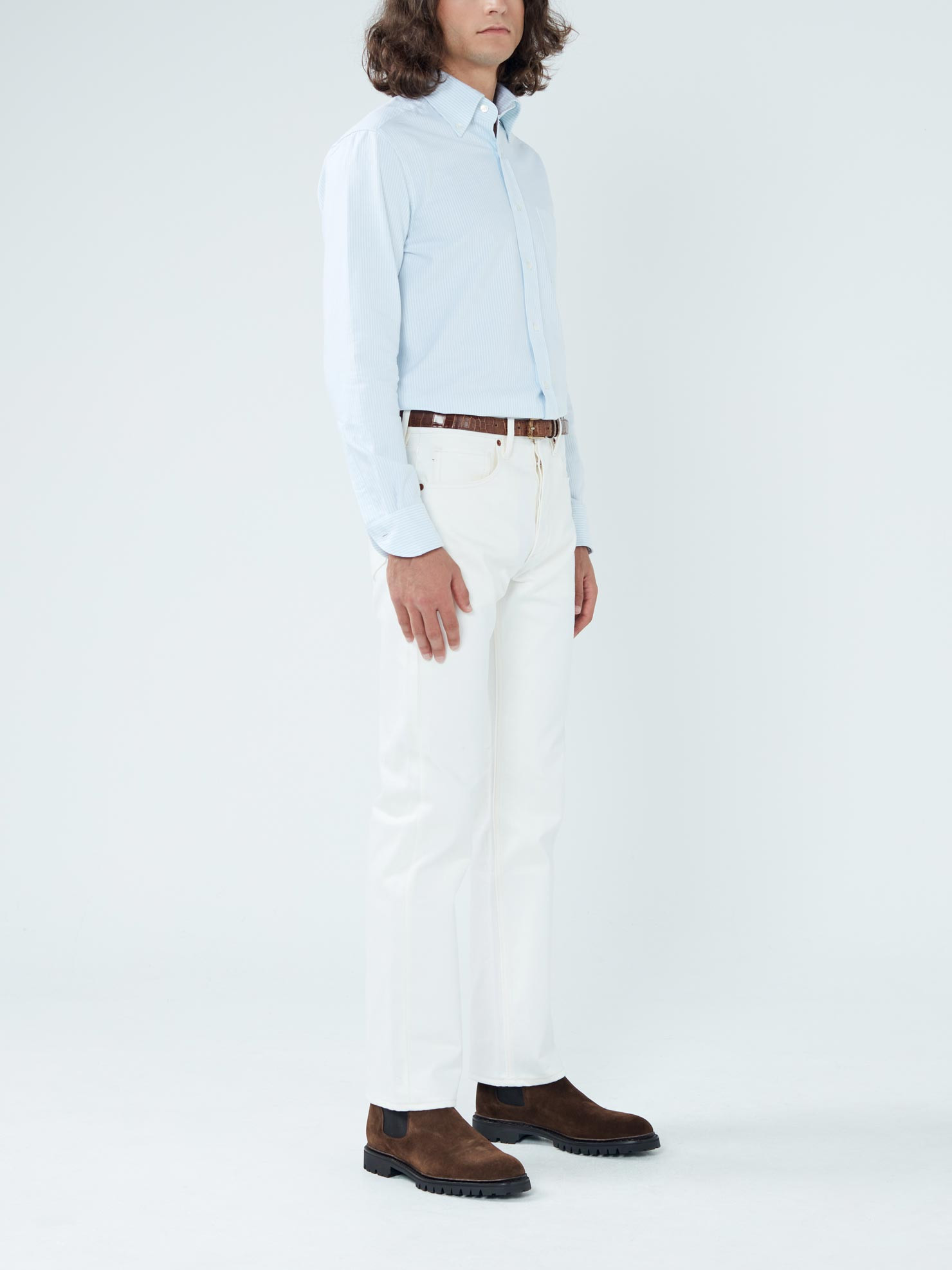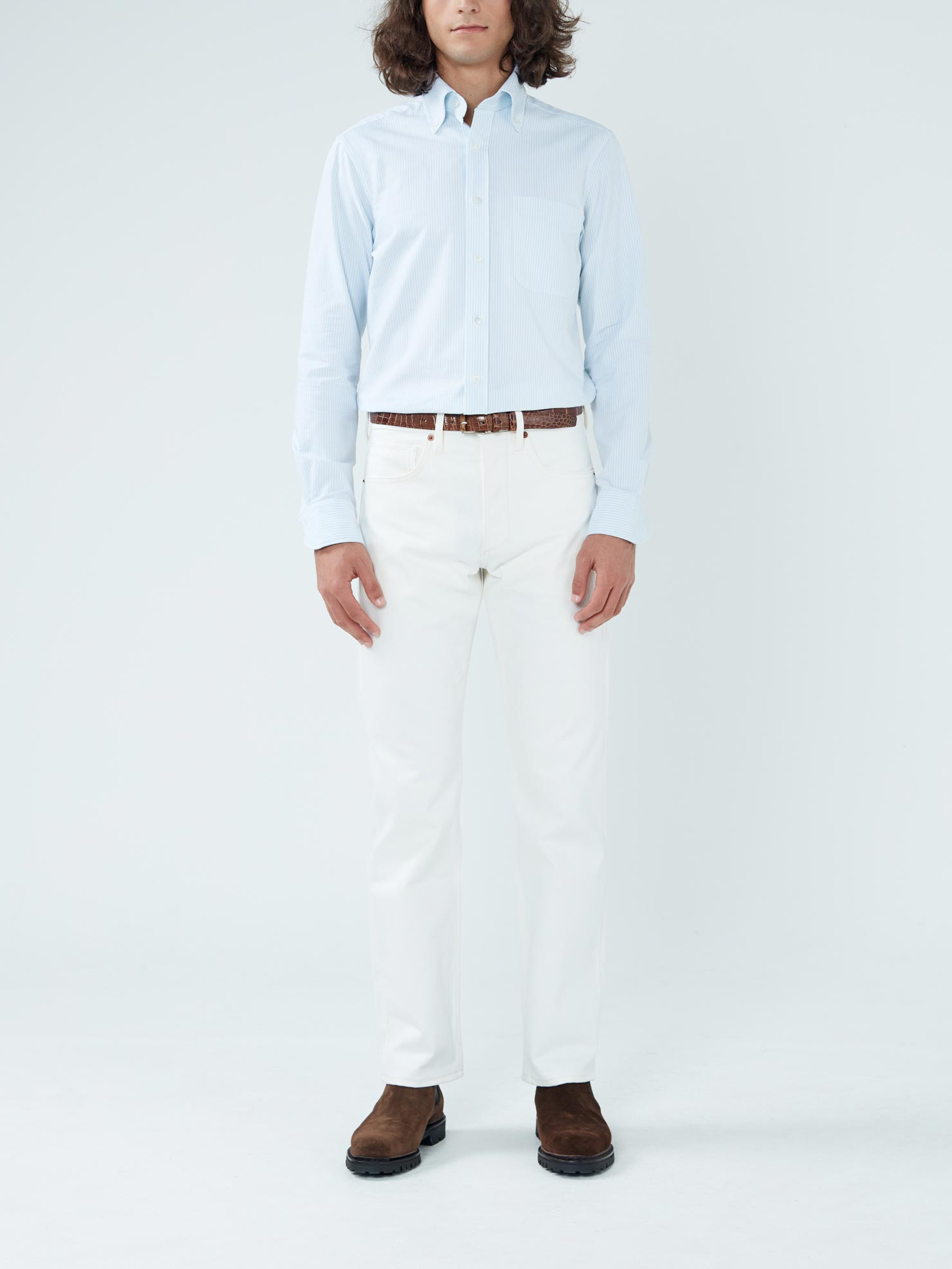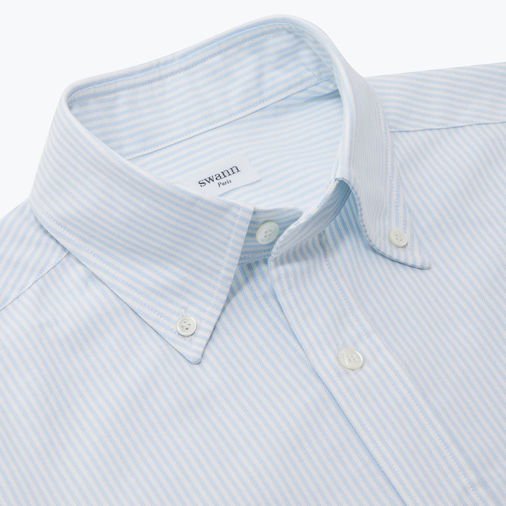 Oxford rayé bleu Albini. Un grand classique, une construction solide à porter hiver comme été qui va se patiner et gagner en confort avec le temps. Probablement notre meilleure qualité d'oxford épais.