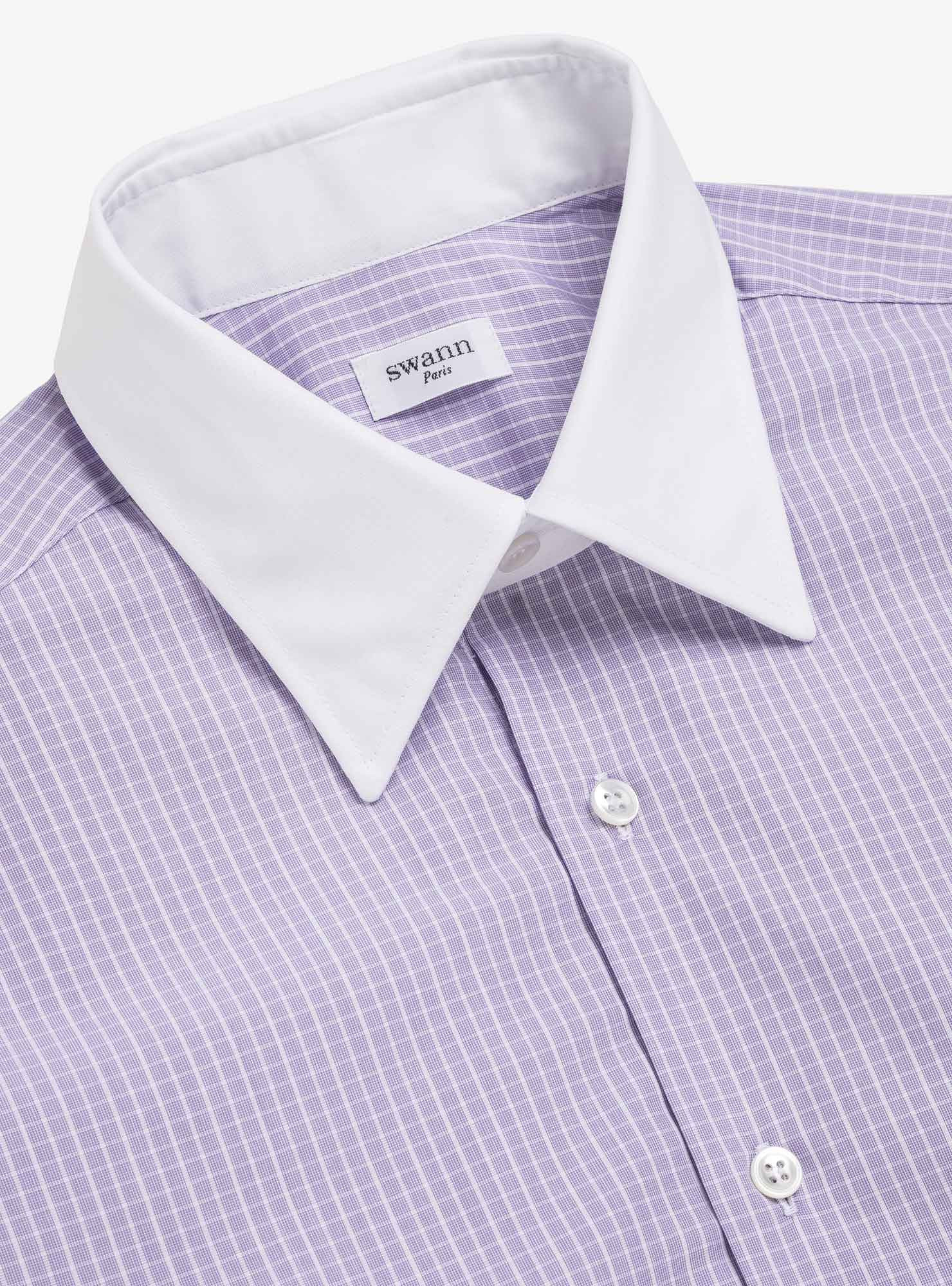 Popeline 140/2 Thomas Mason parme à carreaux blancs. Tissée avec l'une des meilleures qualité de coton égyptien, le giza 45, c'est un tissu extrêmement léger et confortable.
