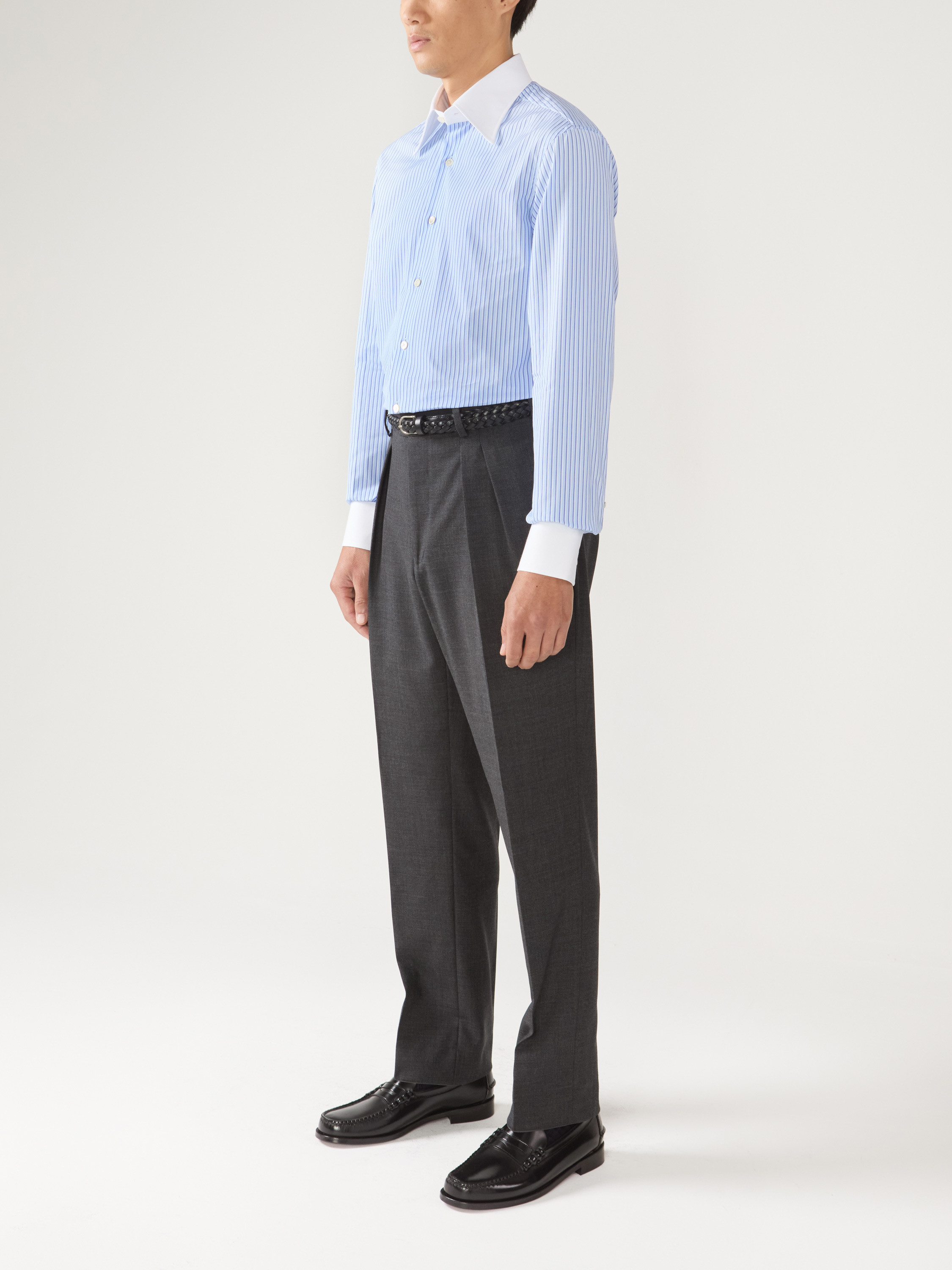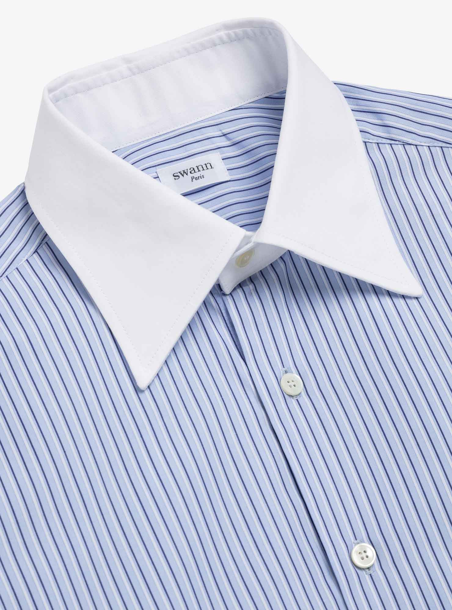 Popeline 120/2 Thomas Mason double rayures bleu et blanche. Tissé en Italie, le tissu est ensuite lavé pour lui donner un rendu mat, doux et souple.