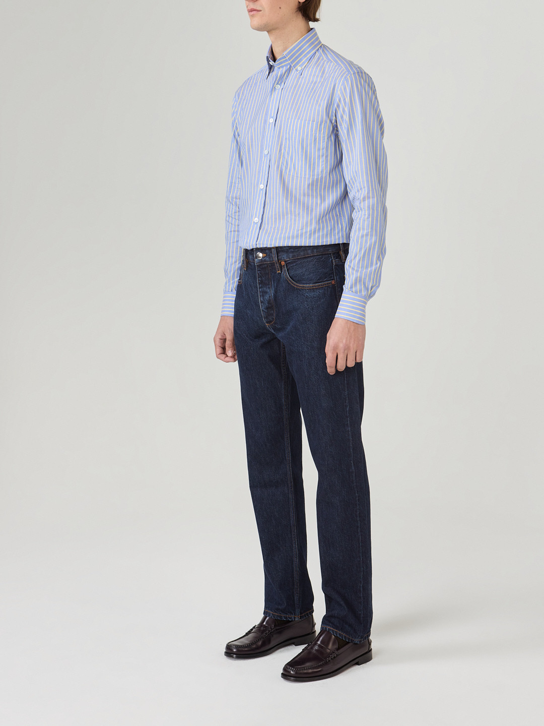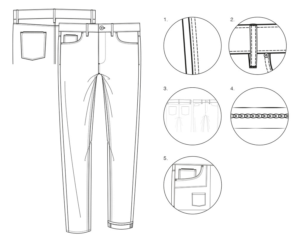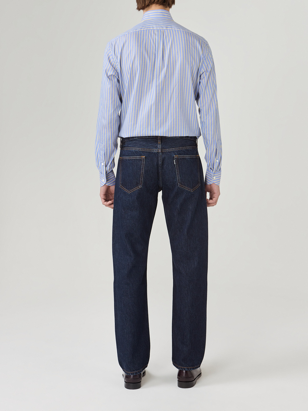 Jeans 5 poches, en denim grey cast rinse brut, fabriqué en Italie. Ce jean est coupé dans une forme inspirée du classique américain avec une coupe flatteuse : taille légèrement plus haute et jambe resserrée en bas. Nous utilisons une très belle qualité de denim japonais tissé sur une machine artisanale à navette. C’est la toile la plus épaisse et la plus traditionnelle de notre gamme, le jeans va se "faire" sur vous.