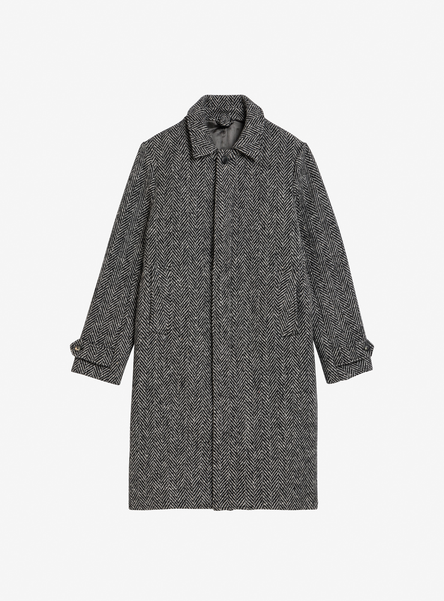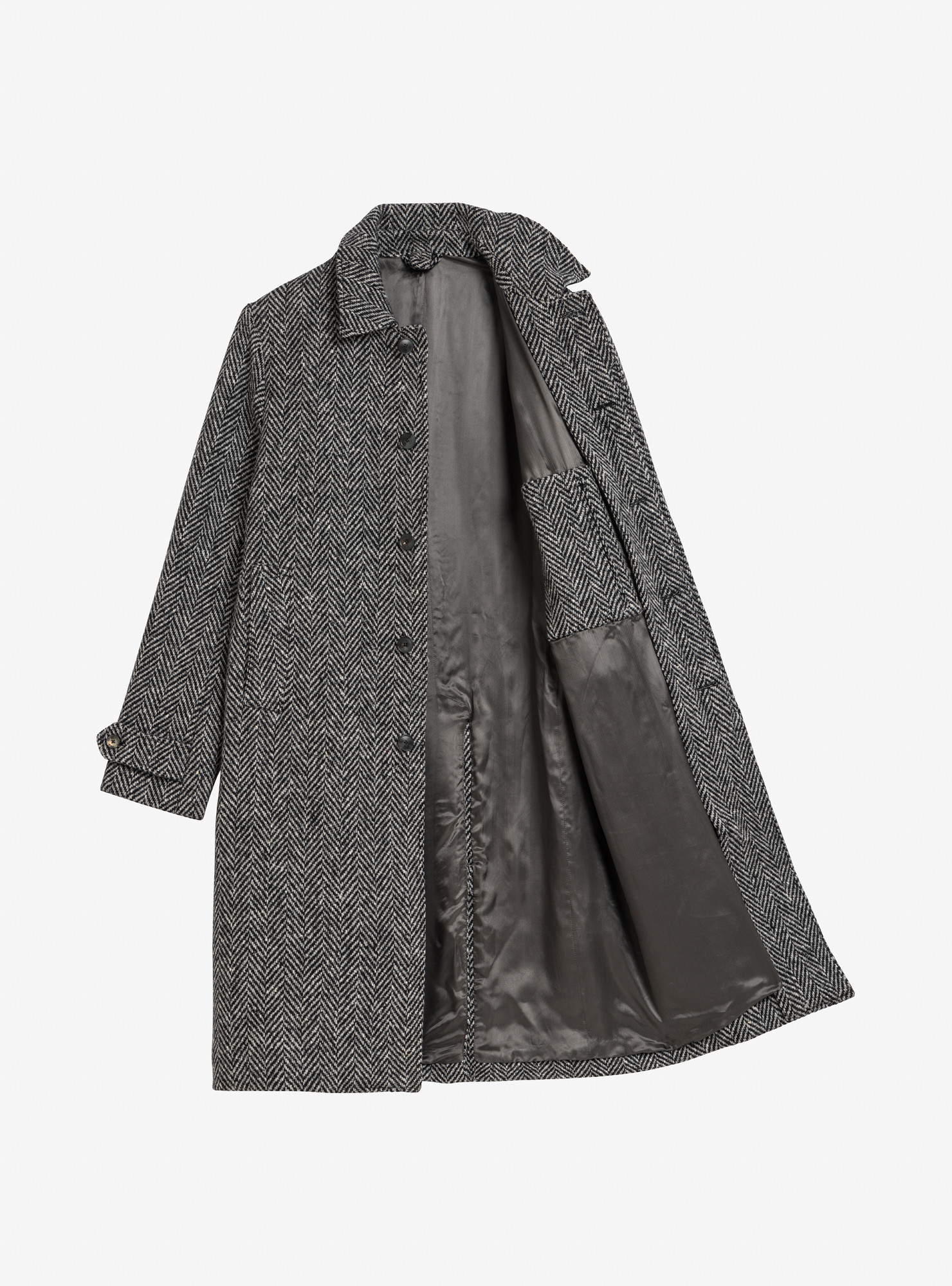 Manteau type Car Coat en Tweed à Chevrons Gris, boutonnage doit à 5 boutons cachés, montage traditionnelle, épaules sans épaulettes, deux poches latérales obliques, une fente dos, doublure intérieure complète et pattes de manches boutonnées.