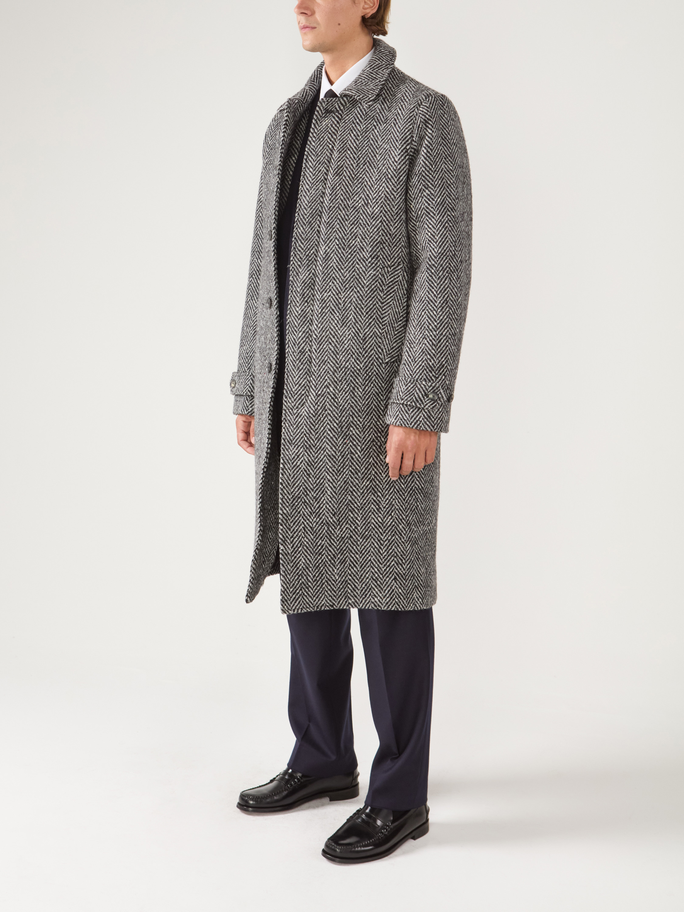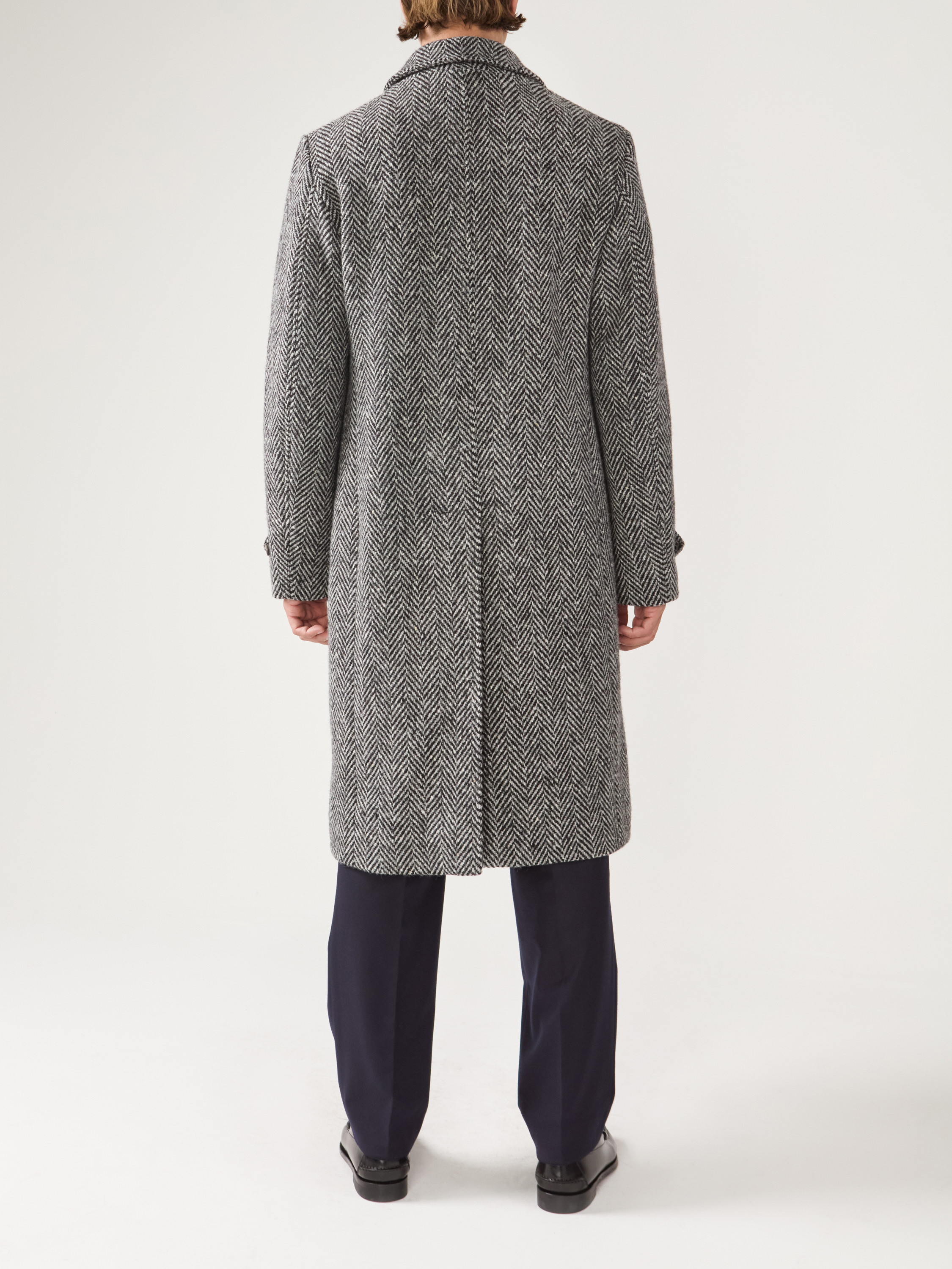 Le tissu Donegal, à la fois élégant et rustique, permet d’associer aisément ce manteau à un costume de laine marine, un jean brut ou même un chino beige pour une allure plus décontractée.