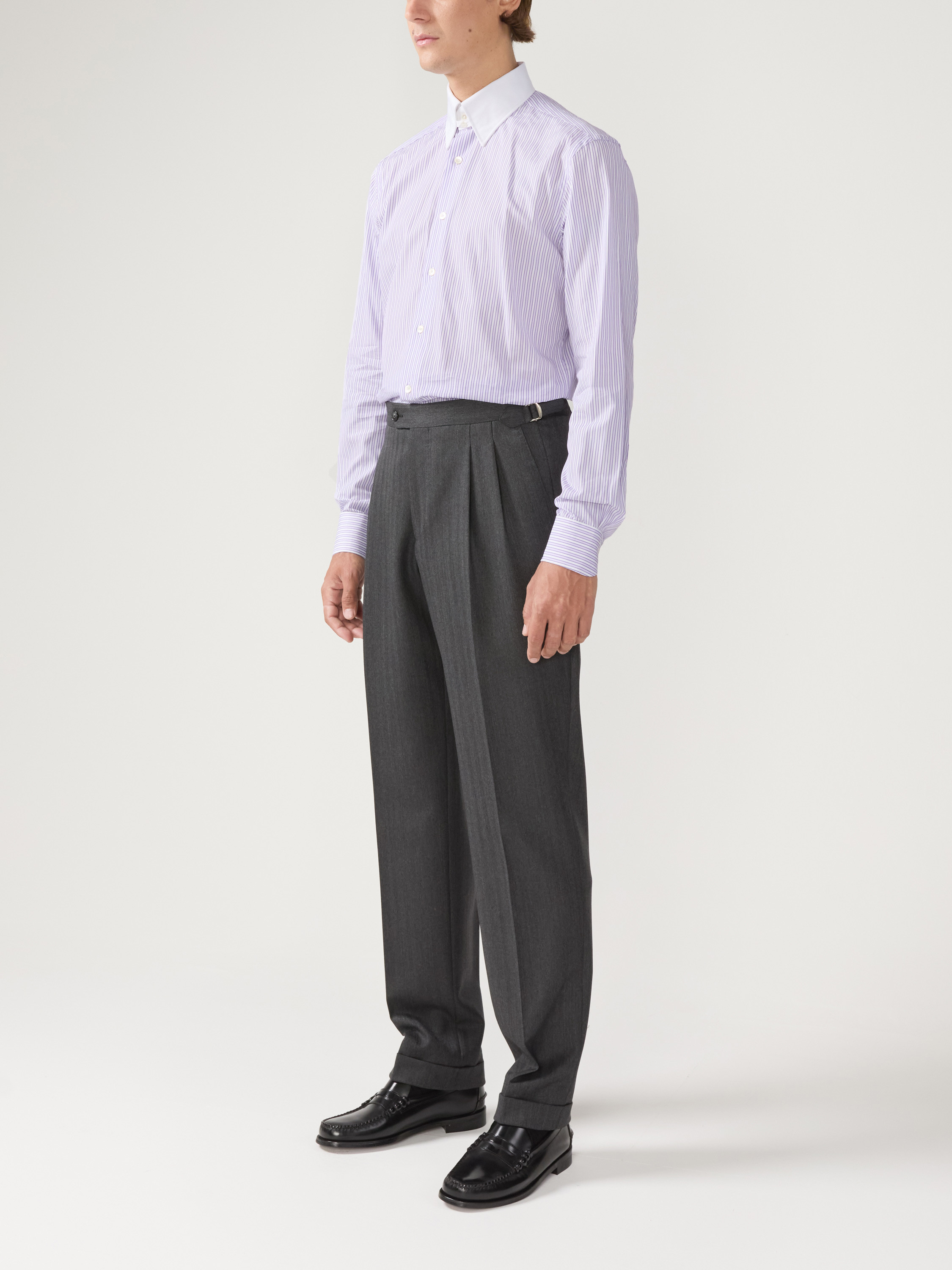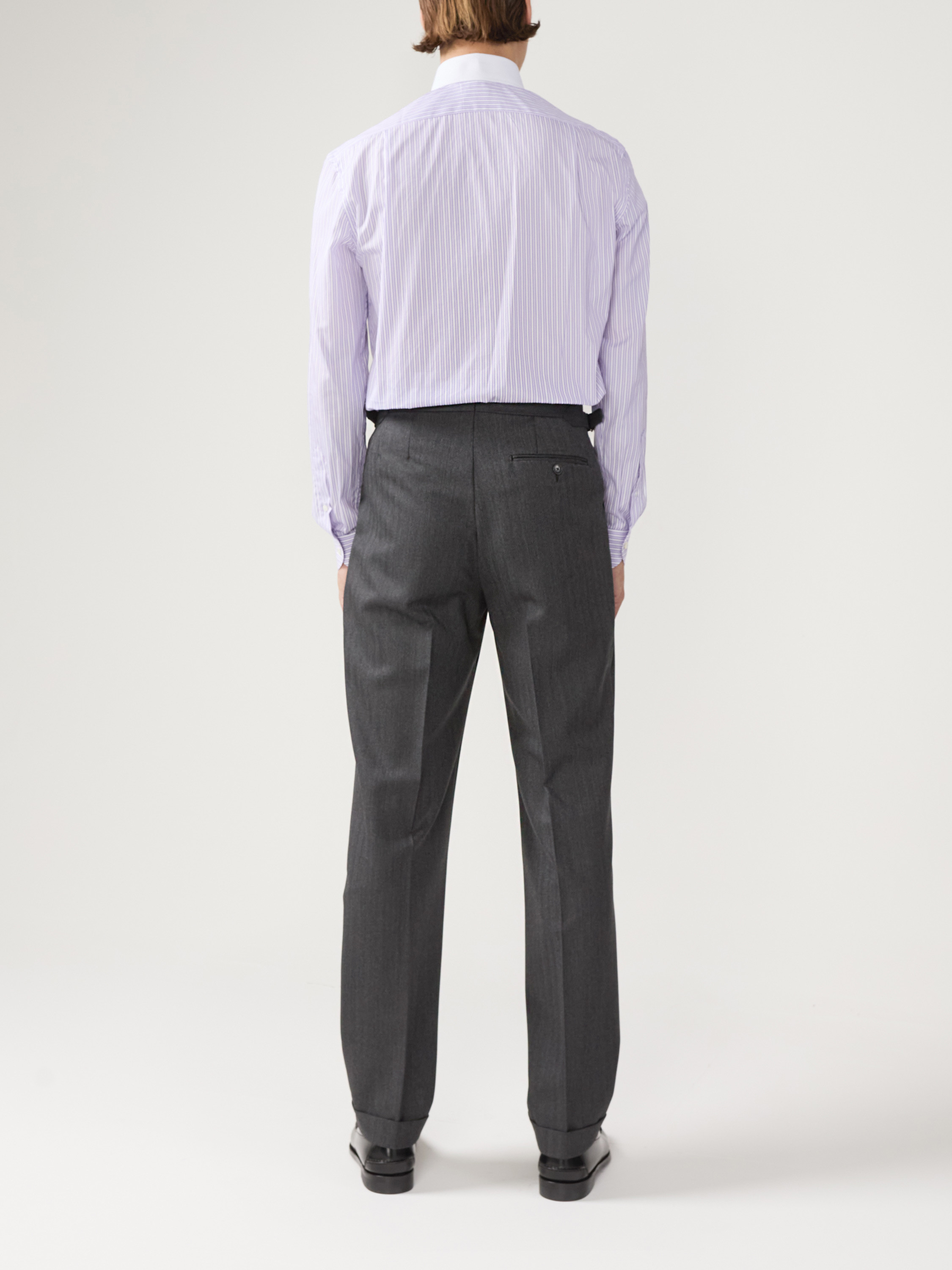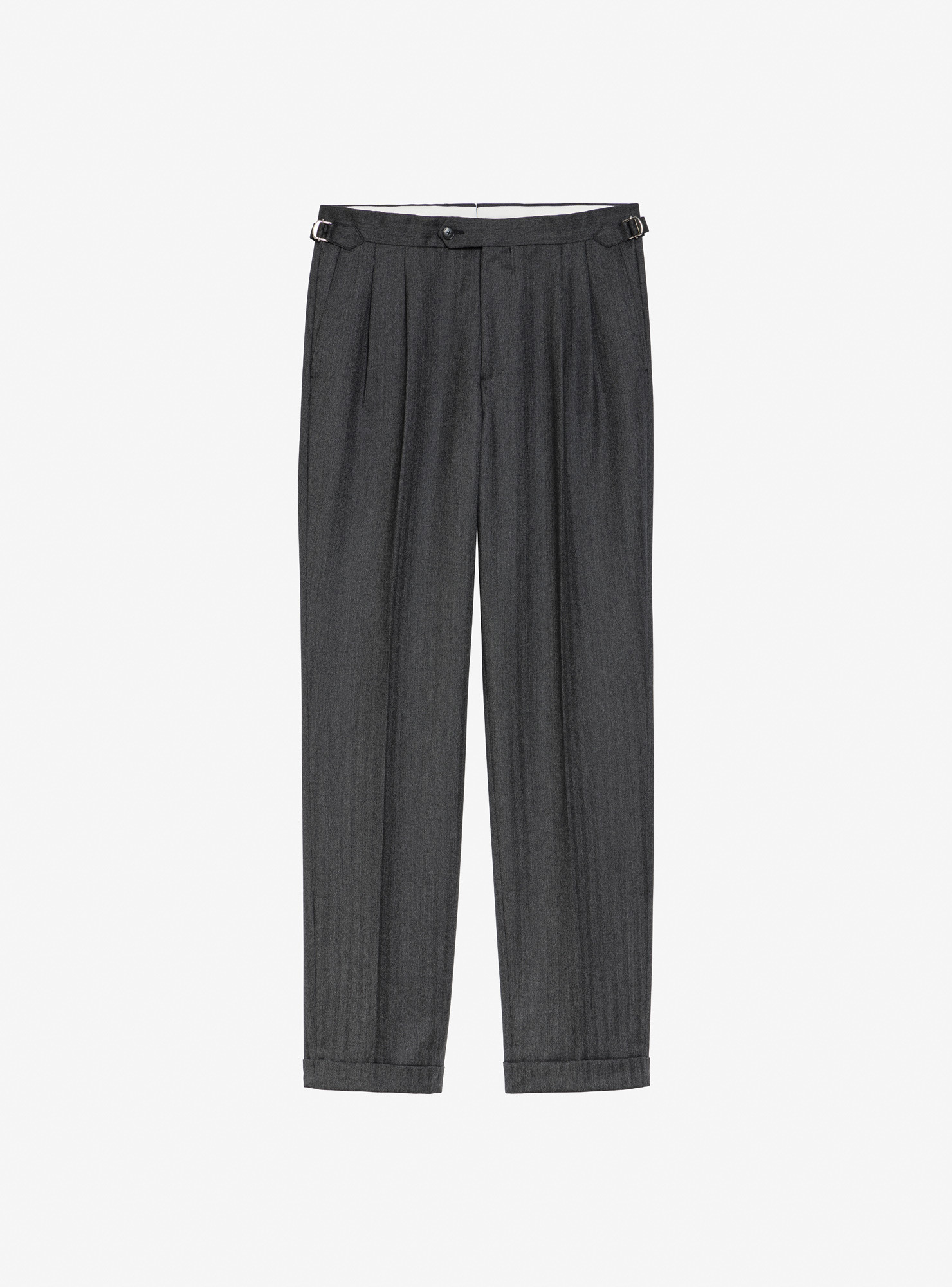 Pantalon Made in Italy en Laine Lourde à motif Chevron gris, ceinture avec pattes de serrages, deux pinces intérieures, bas revers de 4cm.