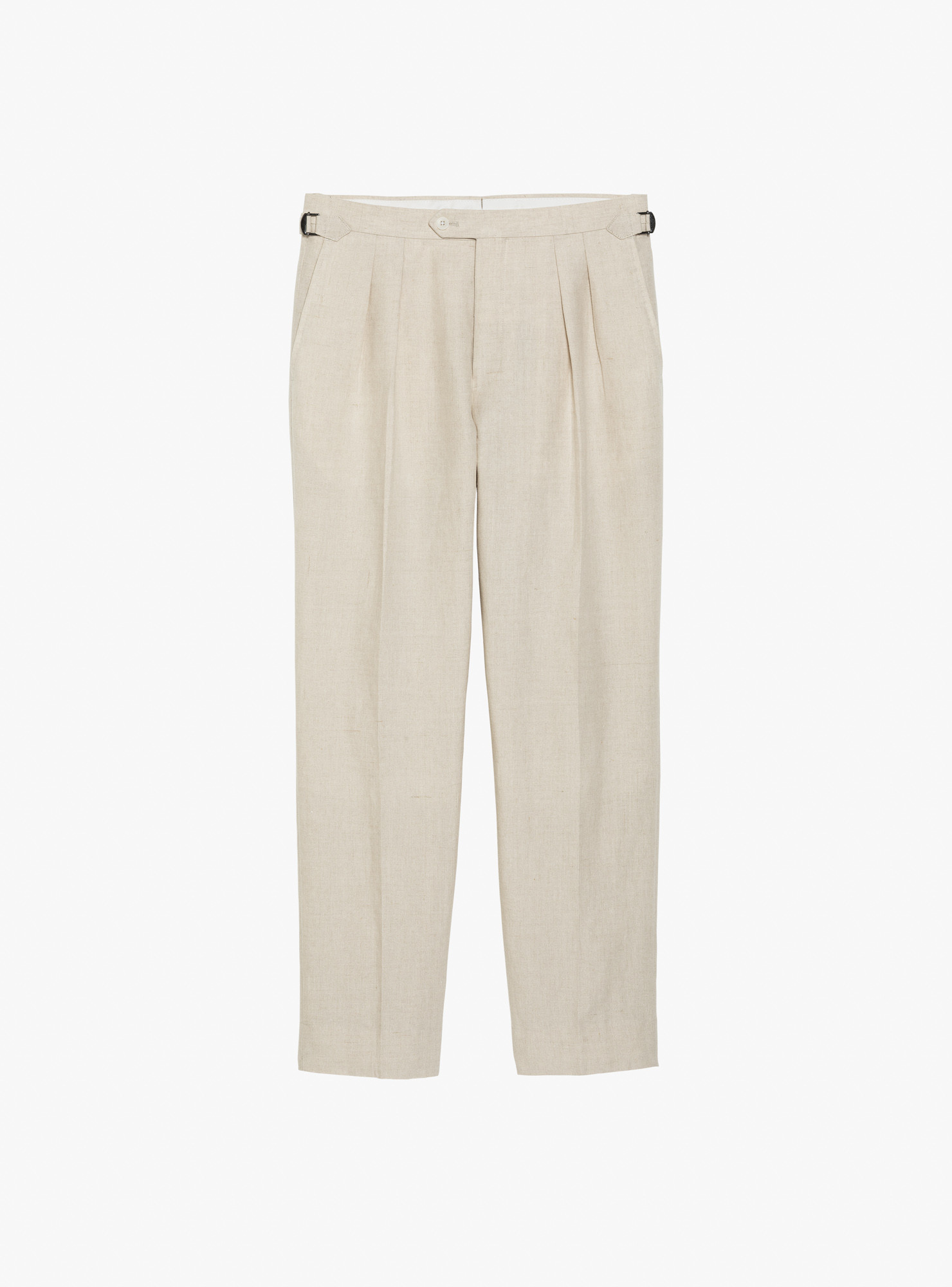 Pantalon en Lin beige, pattes de serrages, 2 pinces intérieures, une poche à droite à l'arrière, bas sans revers