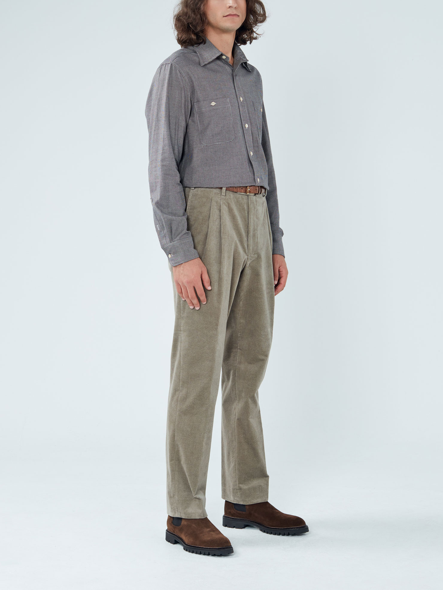 Pantalon velours beige, pli marqué à la jambe, deux pinces extérieures, fermeture à patte décalée, passant ceinture, sans revers. Tissu italien à grosses côtes avec une très bonne tenue. Le velours permet d'être à la fois chic et décontracté. Il se porte avec une veste sport, une chemise ou un col roulé.