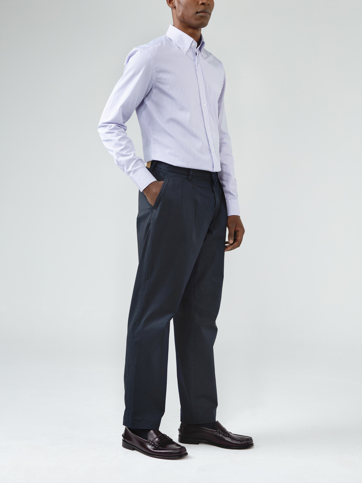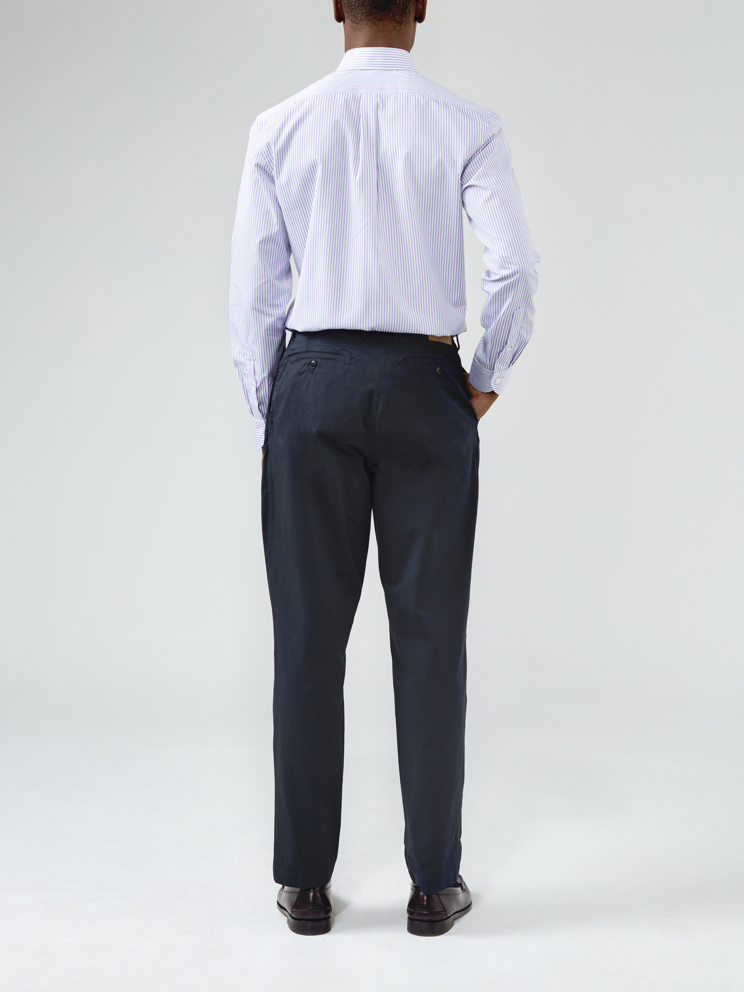 Chino classique, toile d'été, doubles pinces intérieures, poches latérales obliques, poche arrière à passepoils et boutonnées, boutons en corozo, ourlet simple.
