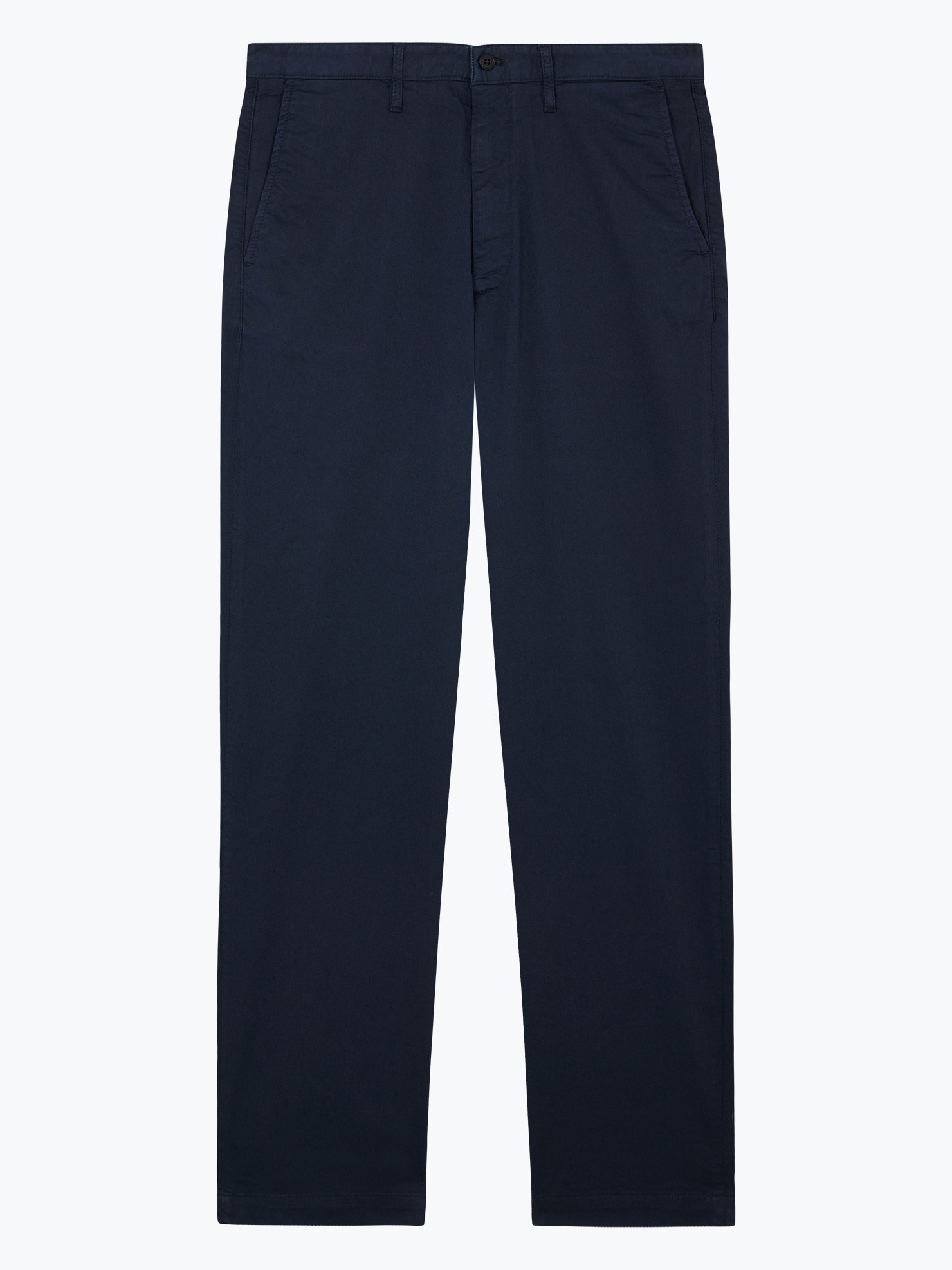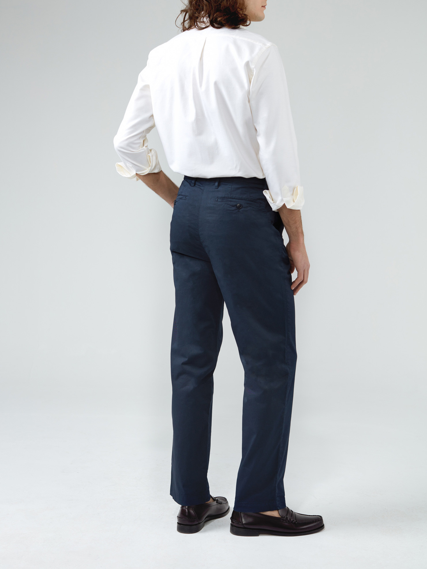 Chino classique toile d'été, sans pinces, poches latérales obliques, poche arrière à passepoils et boutonnées, boutons en corozo, ourlet simple.