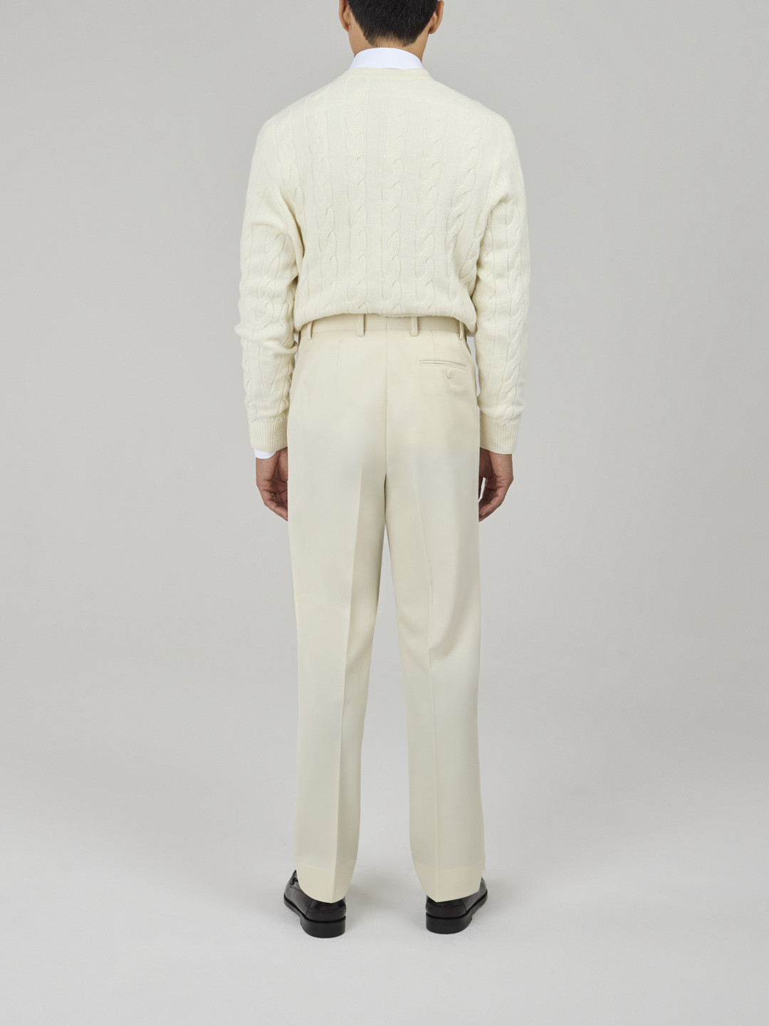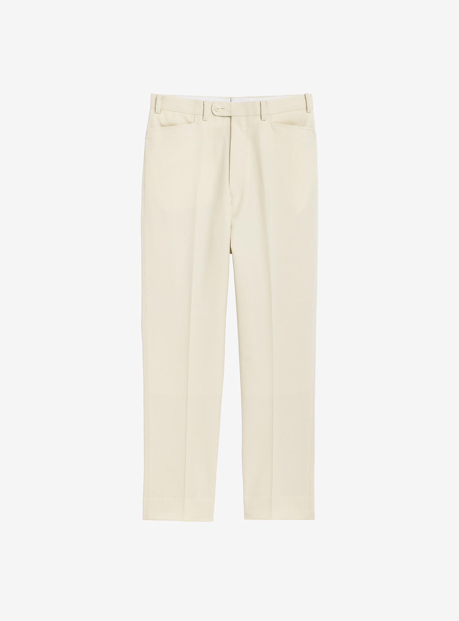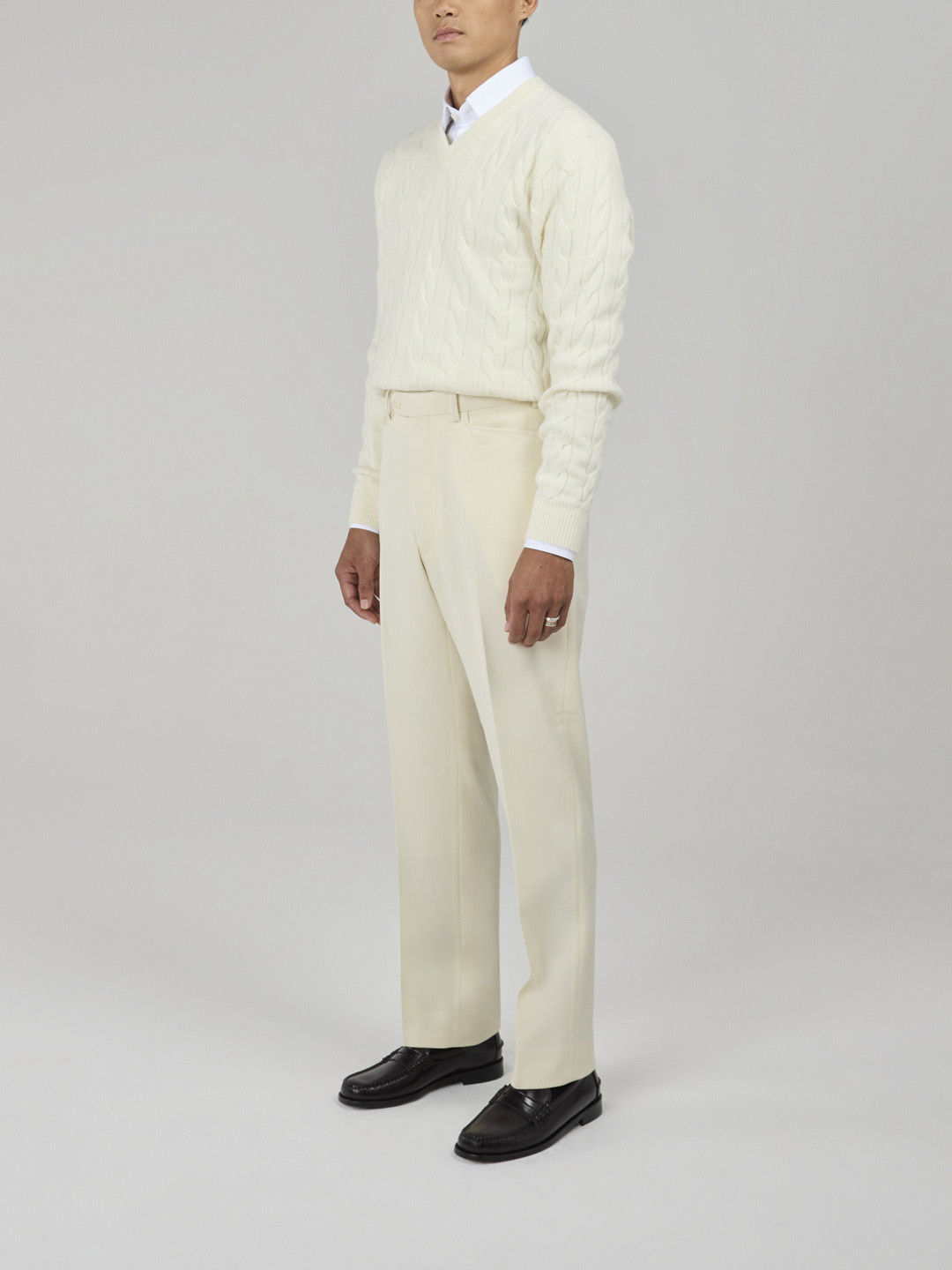 Pantalon en Cavalry Twill Ecru avec passants de ceintures de serrages, deux poches cavalières, sans pinces, bas simple sans revers.