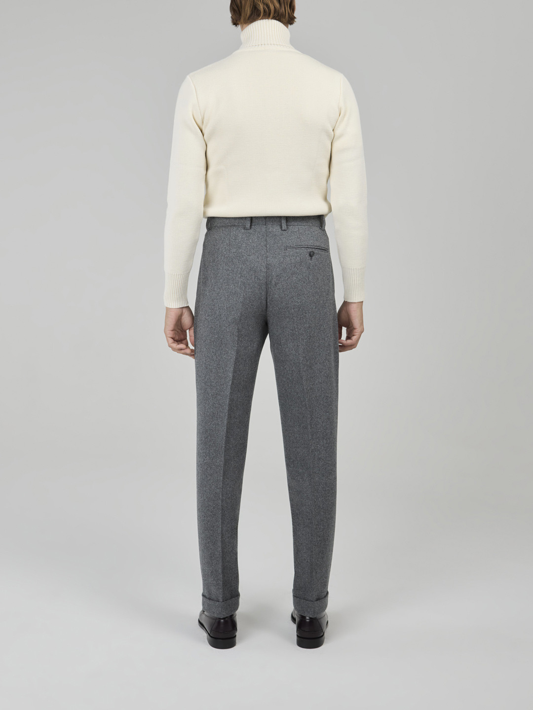 Pantalon en Flanelle Gris moyen, avec passants de ceinture, une pince intérieure, bas revers de 4cm.