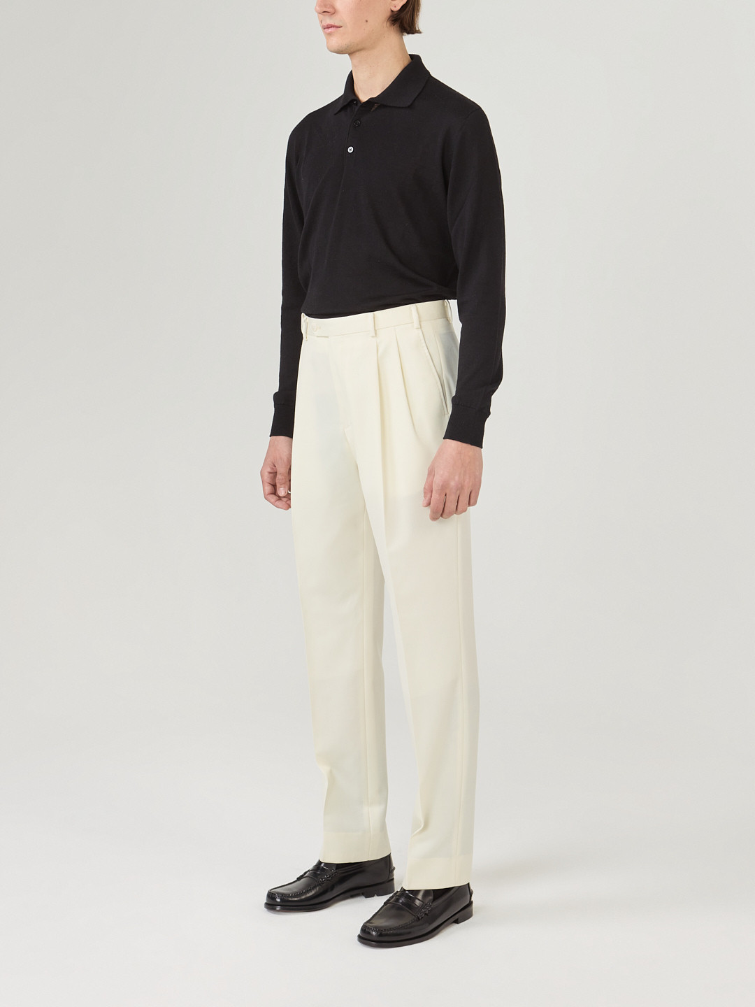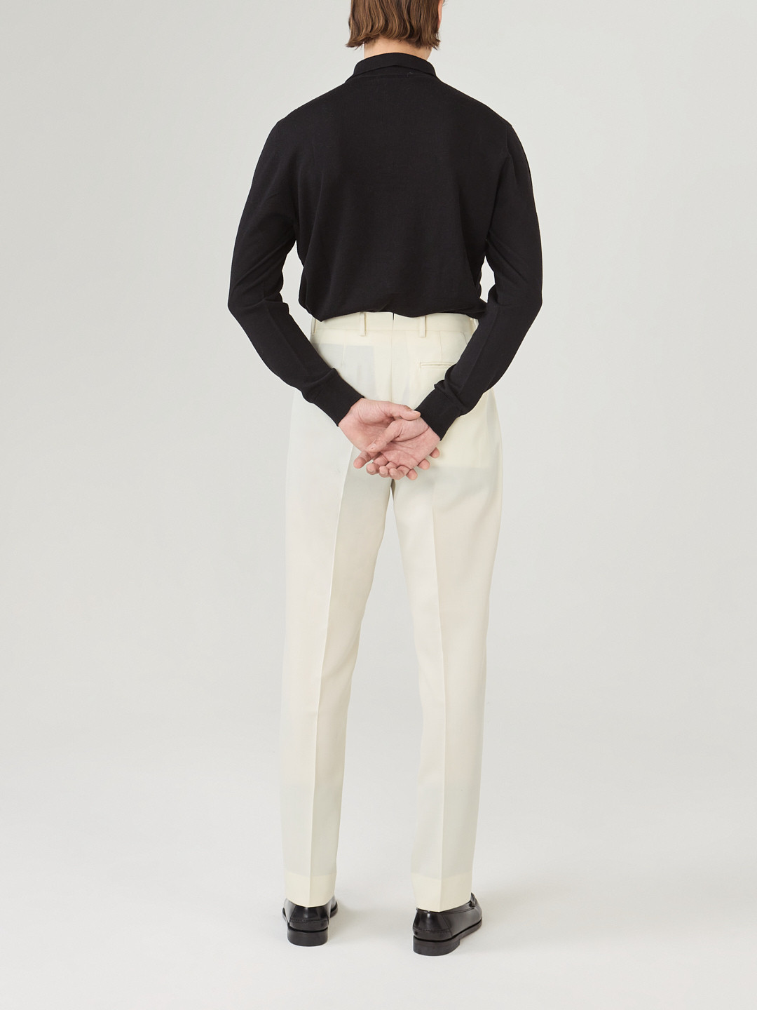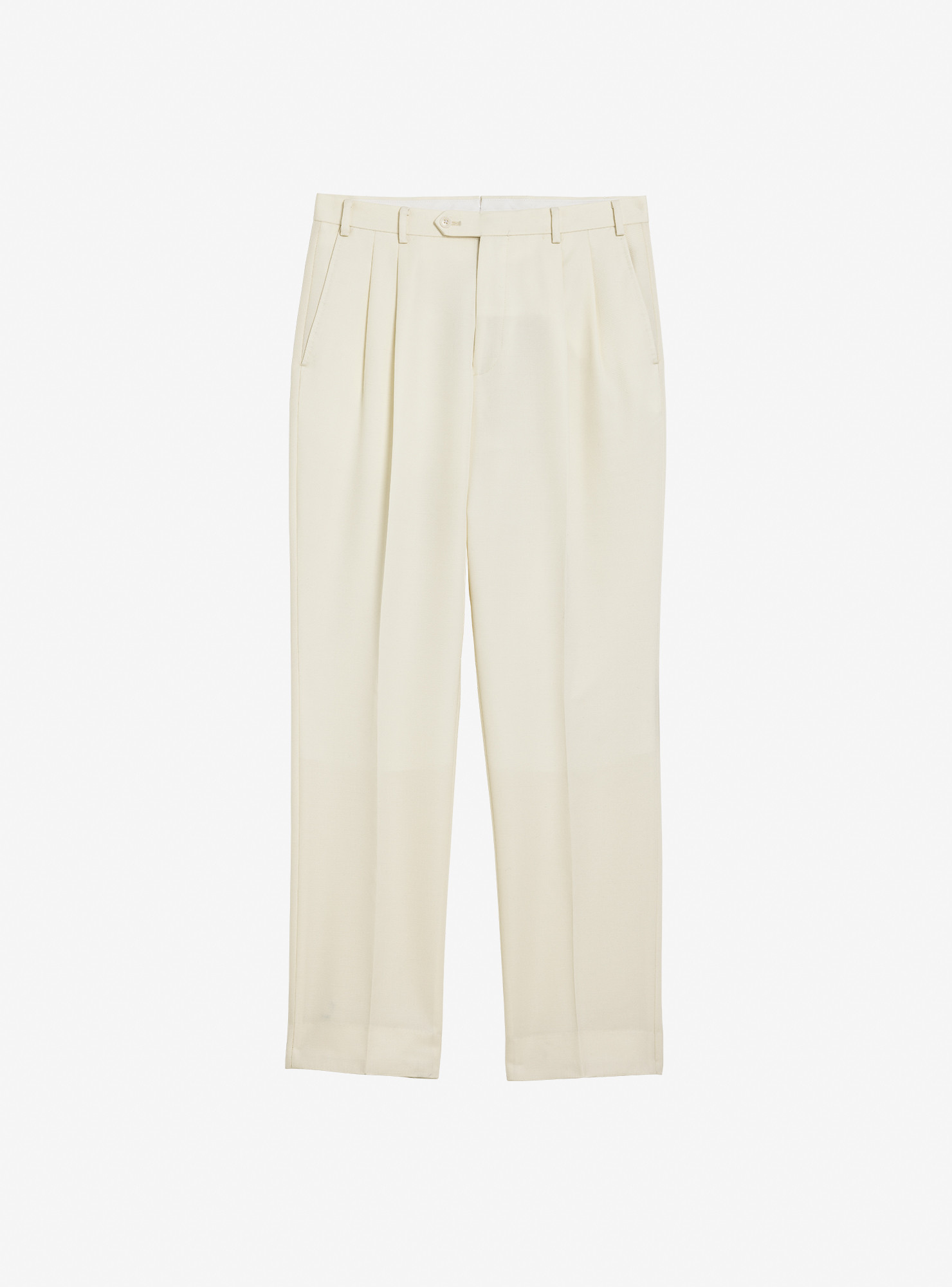 Pantalon en laine crème avec passants de ceintures, 2 pinces extérieures, 1 poche arrière passepoillée, bas sans revers.