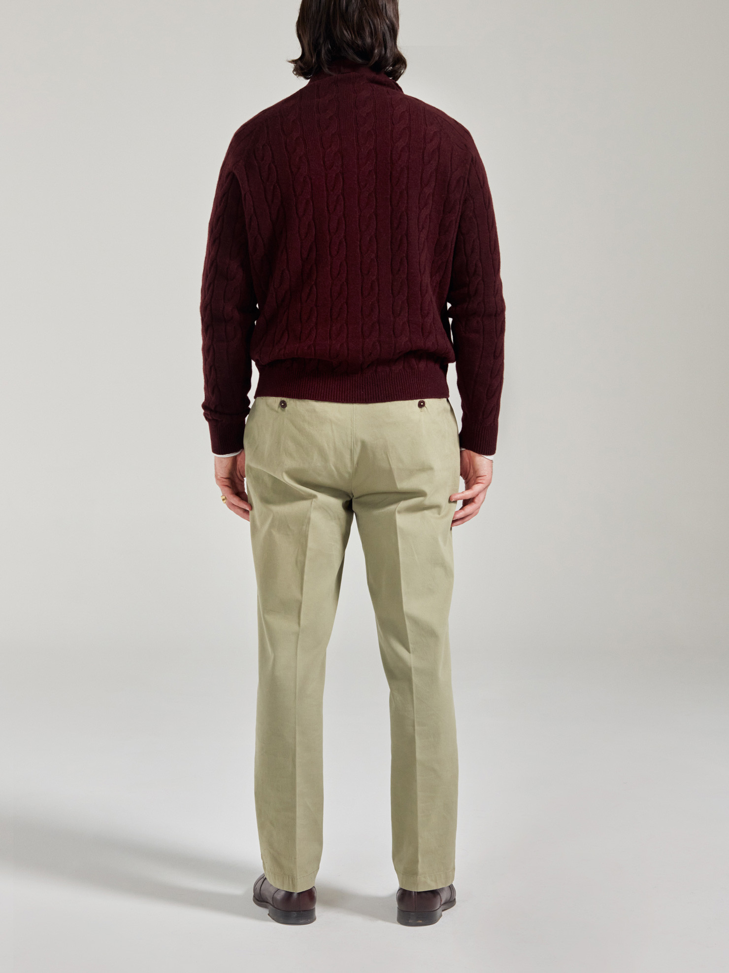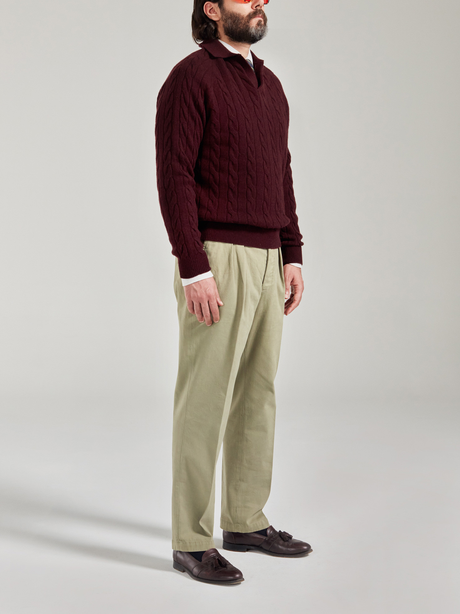 Pull col polo non boutonné en laine et cachemire bordeaux, motifs cable knit (torsades), manches longues.