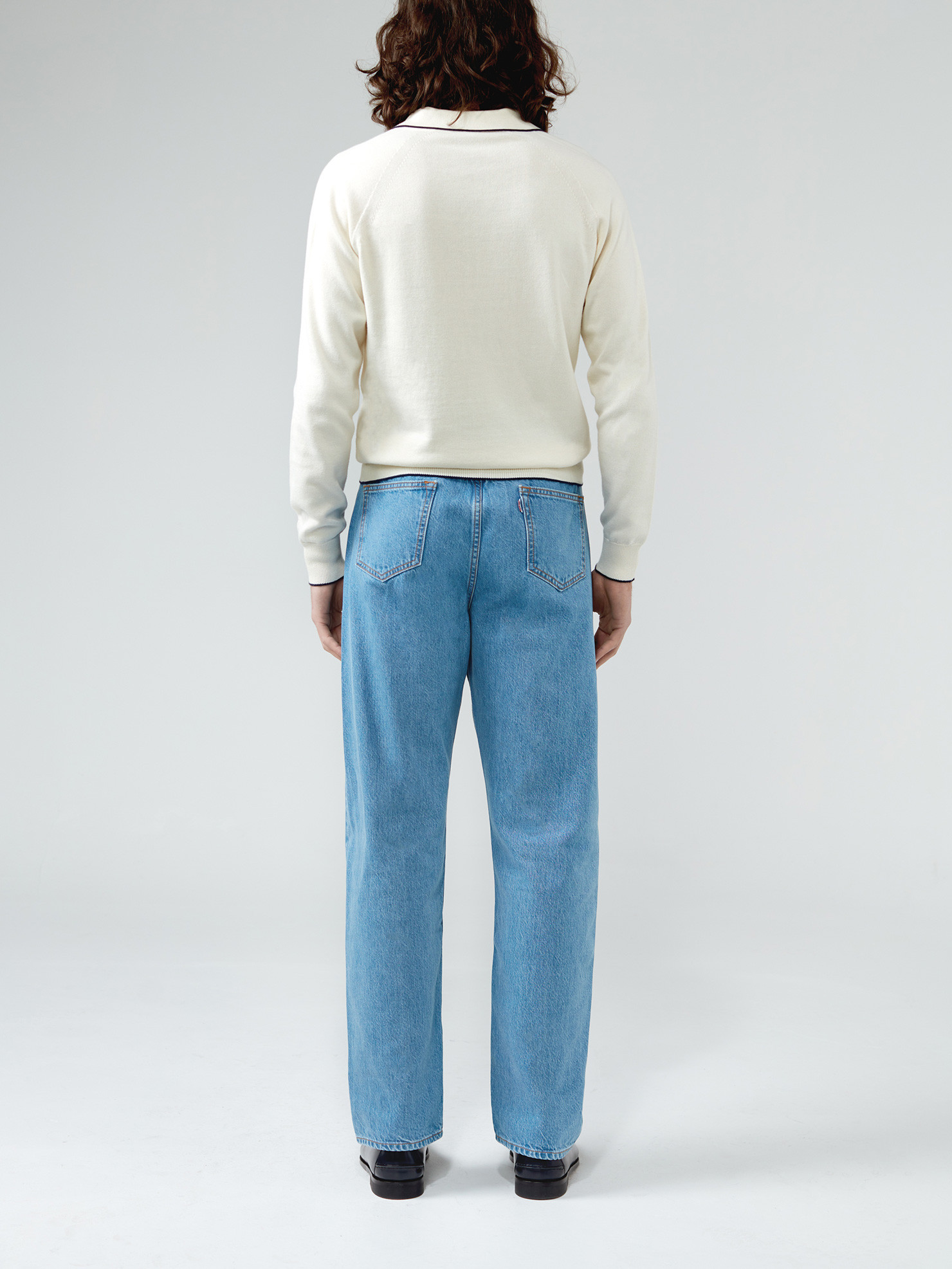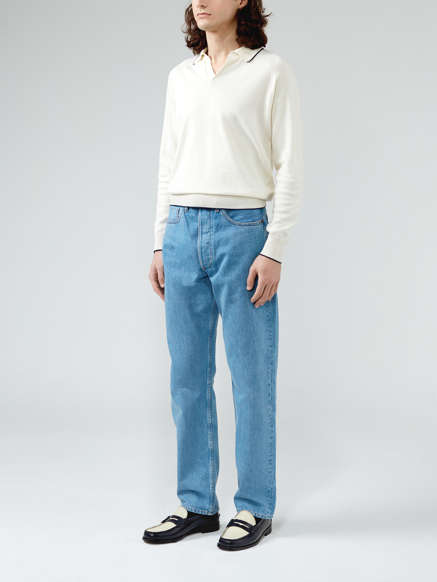 Polo en coton cachemire ecru, liseret col, poignets et bas marine, col sans bouton, manches longue, tissé en italie.