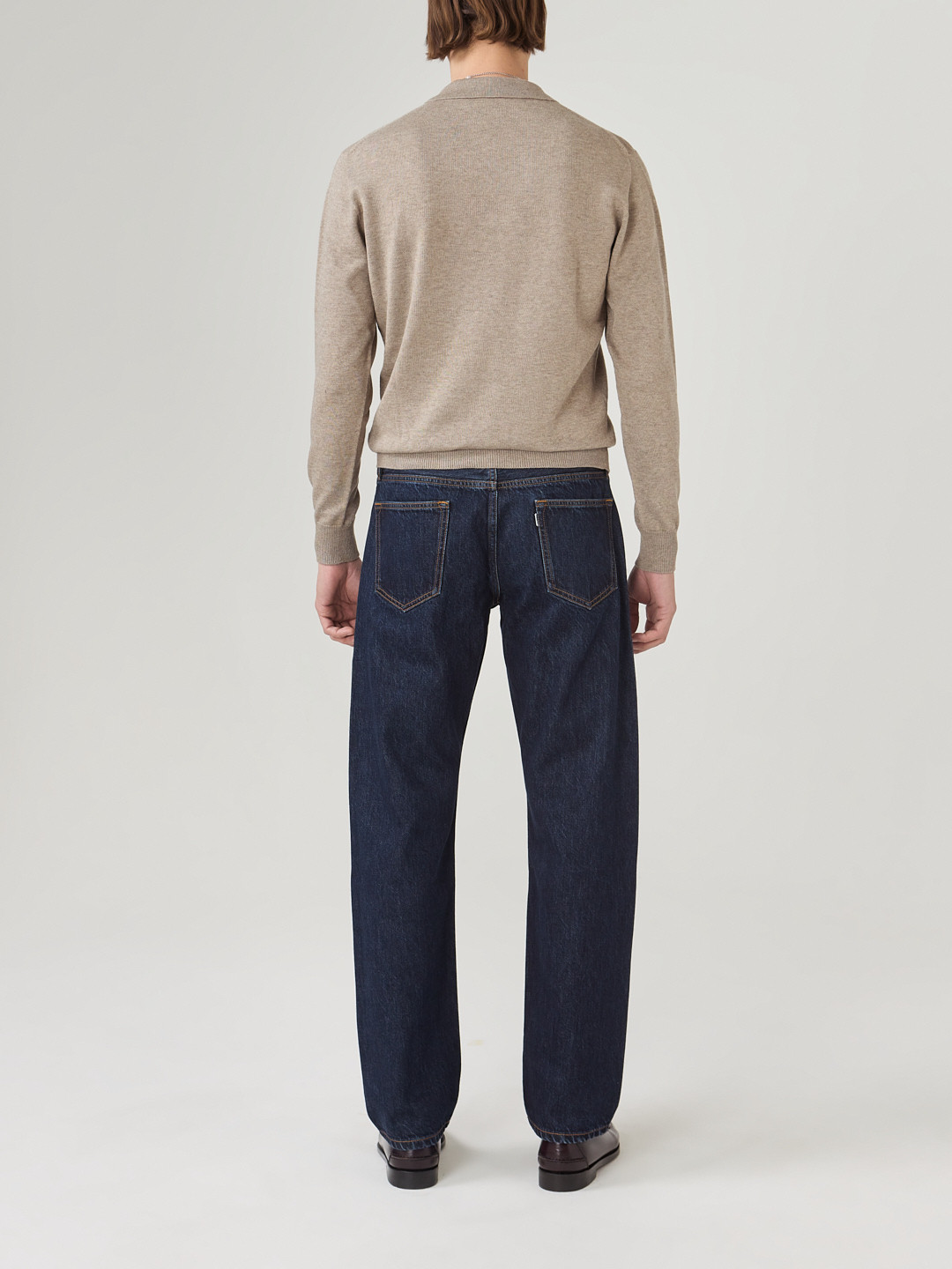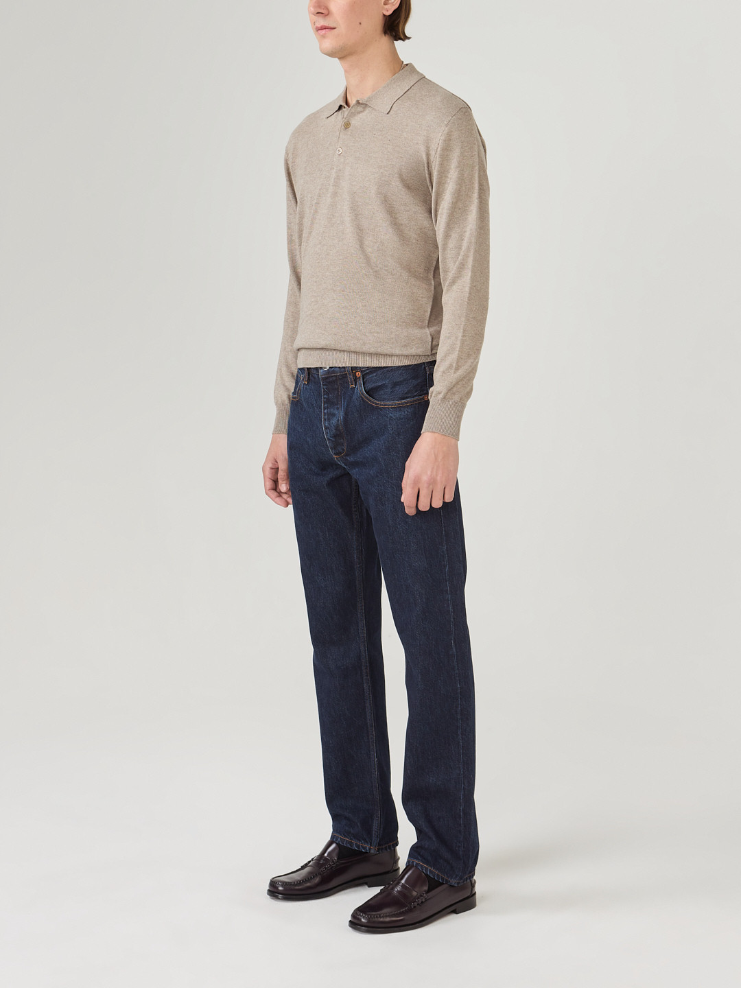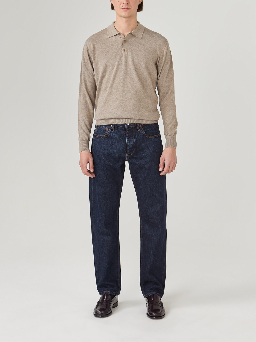 Polo en coton cachemire taupe, col 3 boutons, manches longue, tissé en italie.