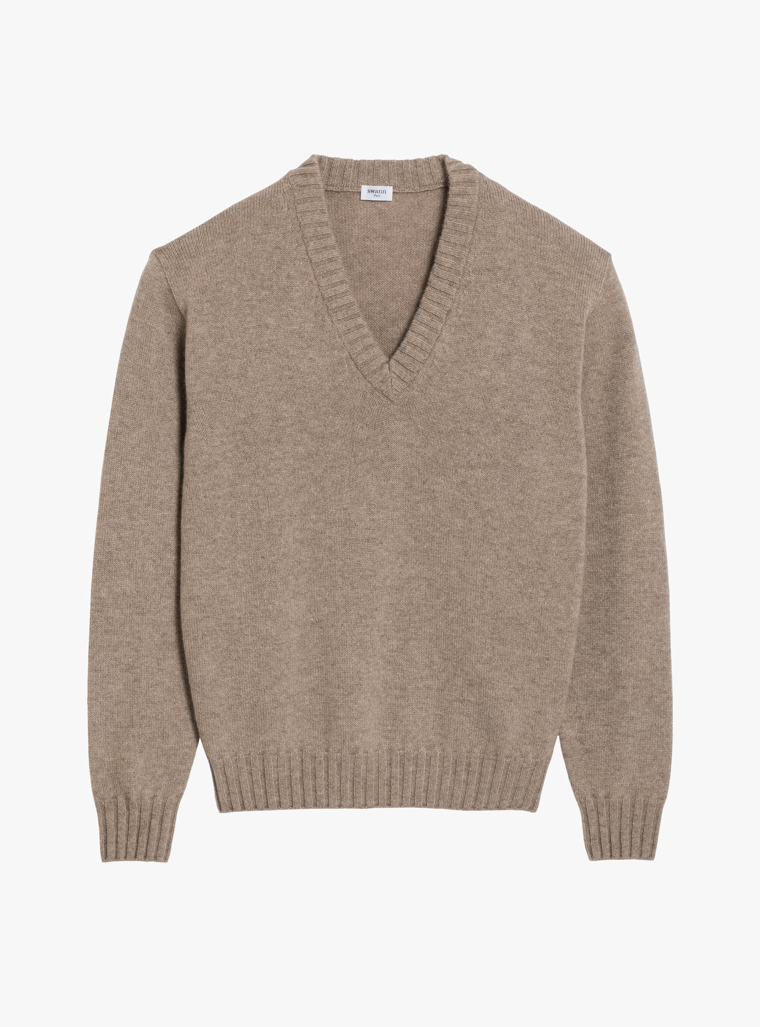 Pull col V en cachemire beige, encolure profonde, manches longues, bords cotes 1x2.