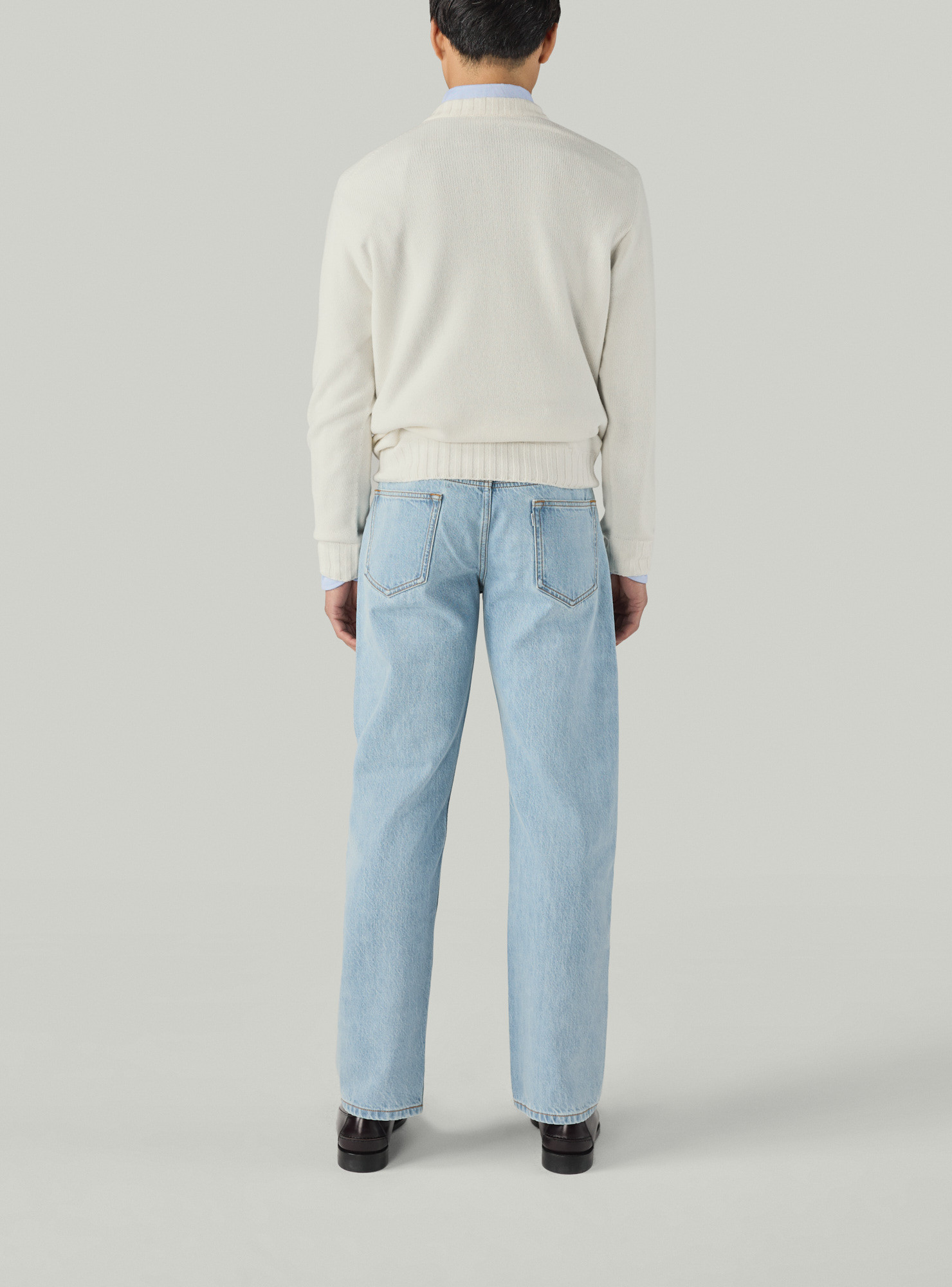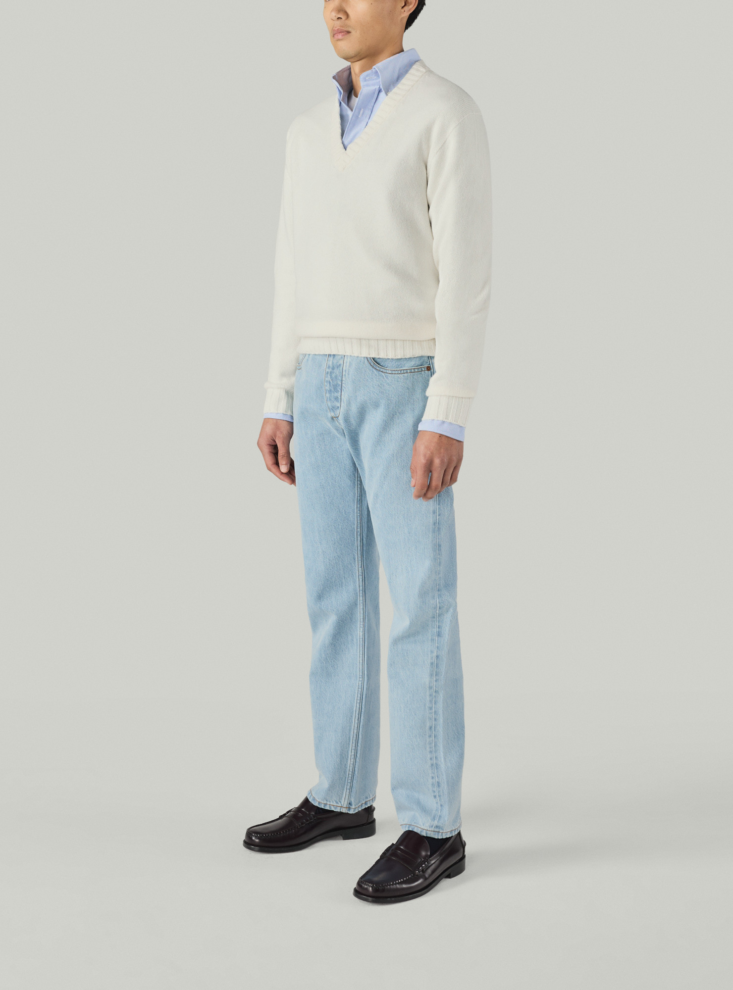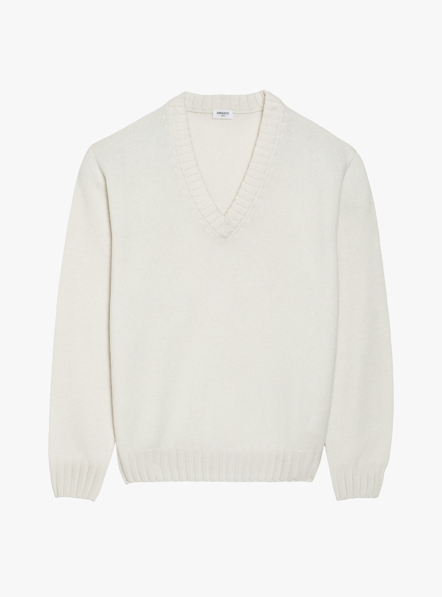 Pull col V en cachemire écru, encolure profonde, manches longues, bords cotes 1x2.