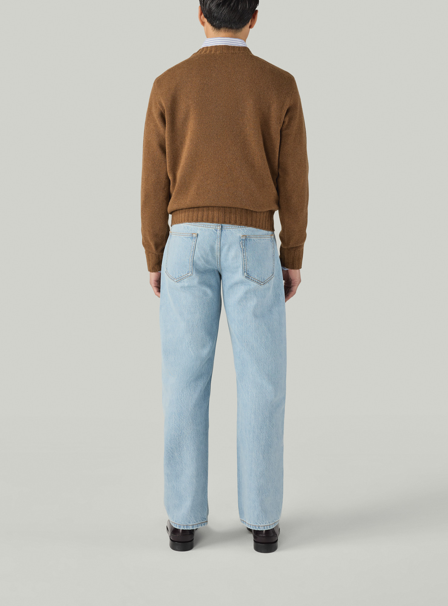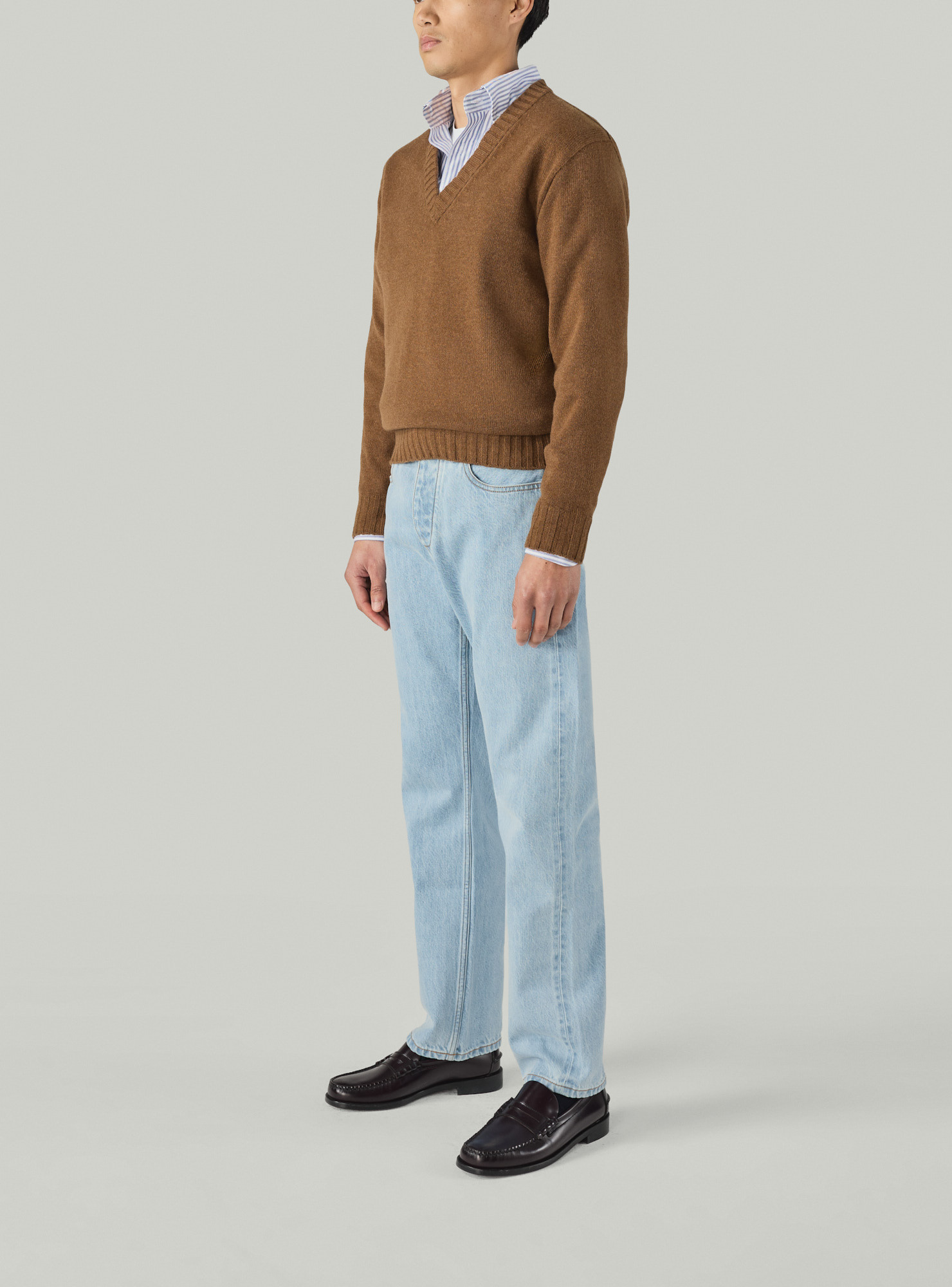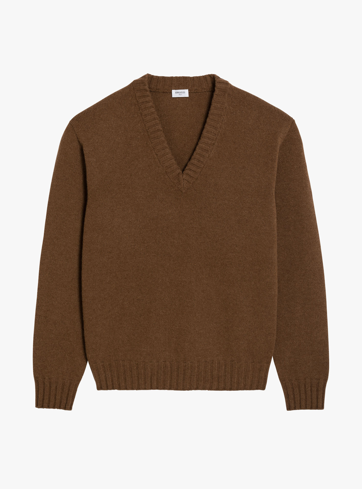 Pull col V en cachemire marron, encolure profonde, manches longues, bords cotes 1x2.