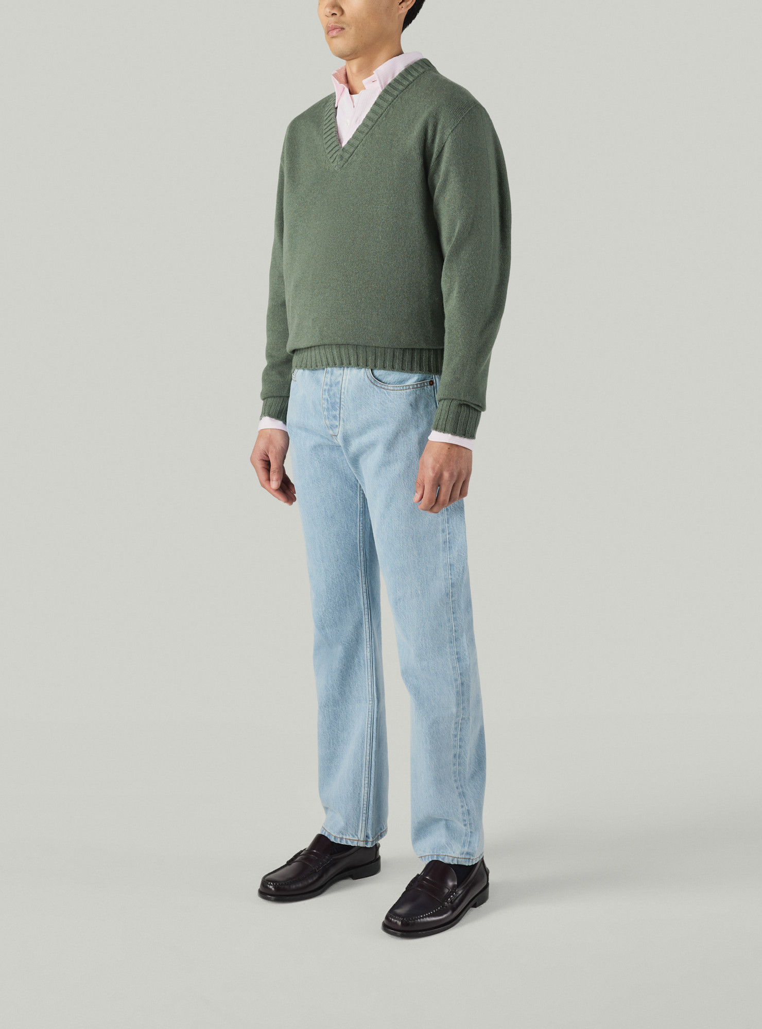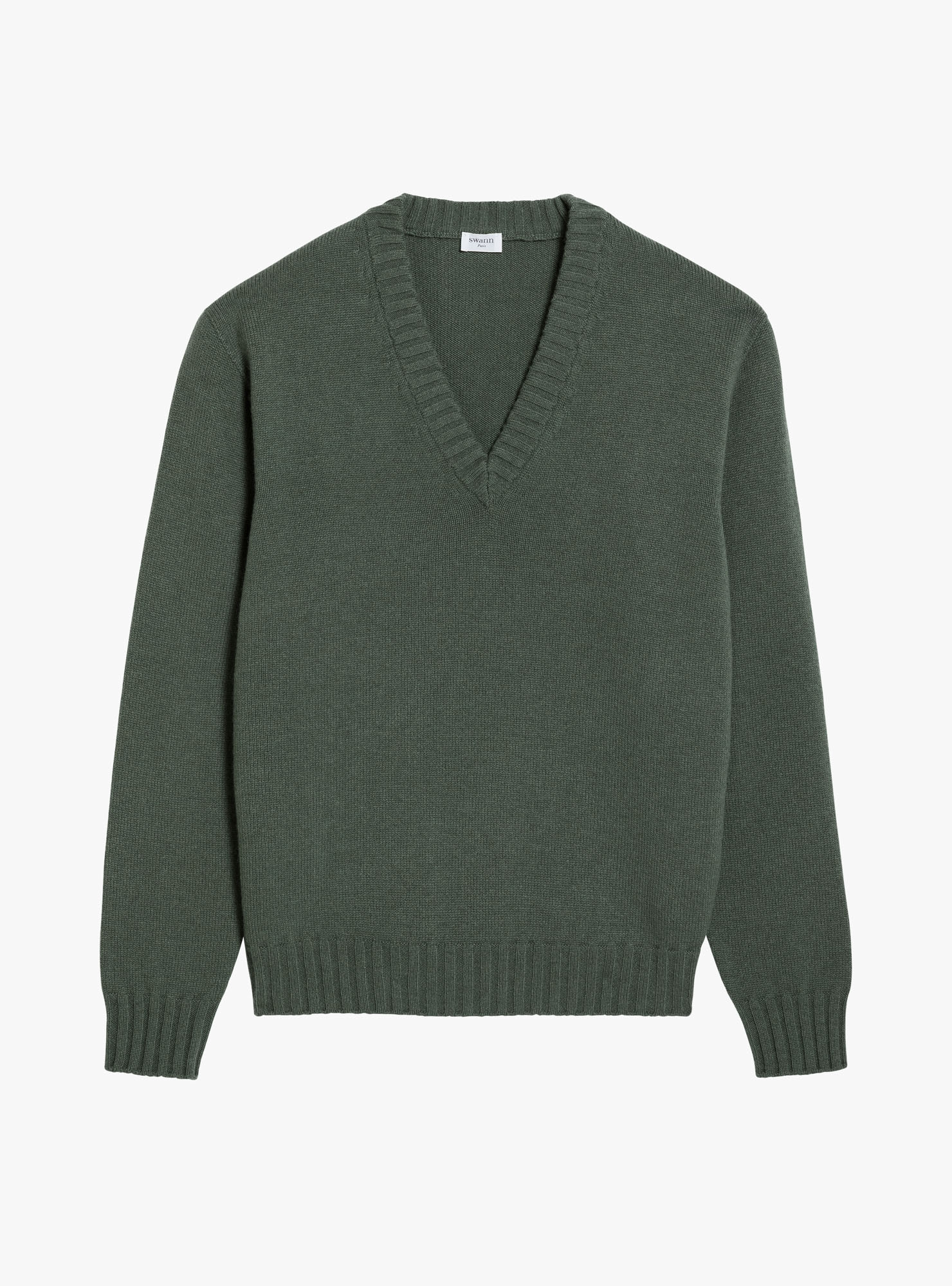 Pull col V en cachemire vert, encolure profonde, manches longues, bords cotes 1x2.