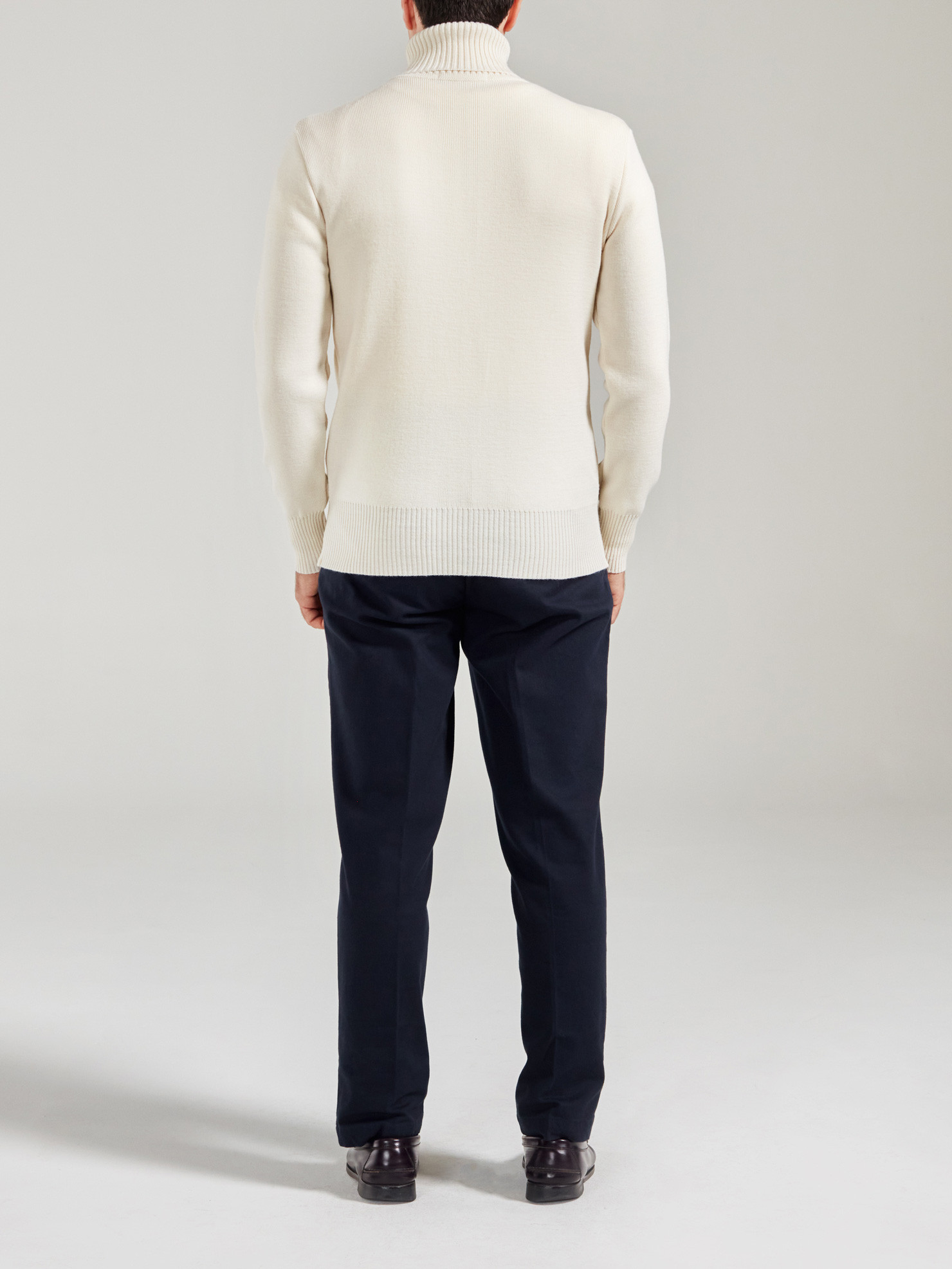 Ce pull est confectionné en laine vierge et tricoté à Rohan en Bretagne dans un atelier artisanal spécialiste de la maille. Le col est ajouté maille par maille, et cousu en point de chainette afin de le rendre plus résistant, mais aussi plus souple. 800 grammes de laine sont utilisés pour chaque pull, ce qui représente 23 km de fil... de quoi vous tenir chaud pour l'hiver.