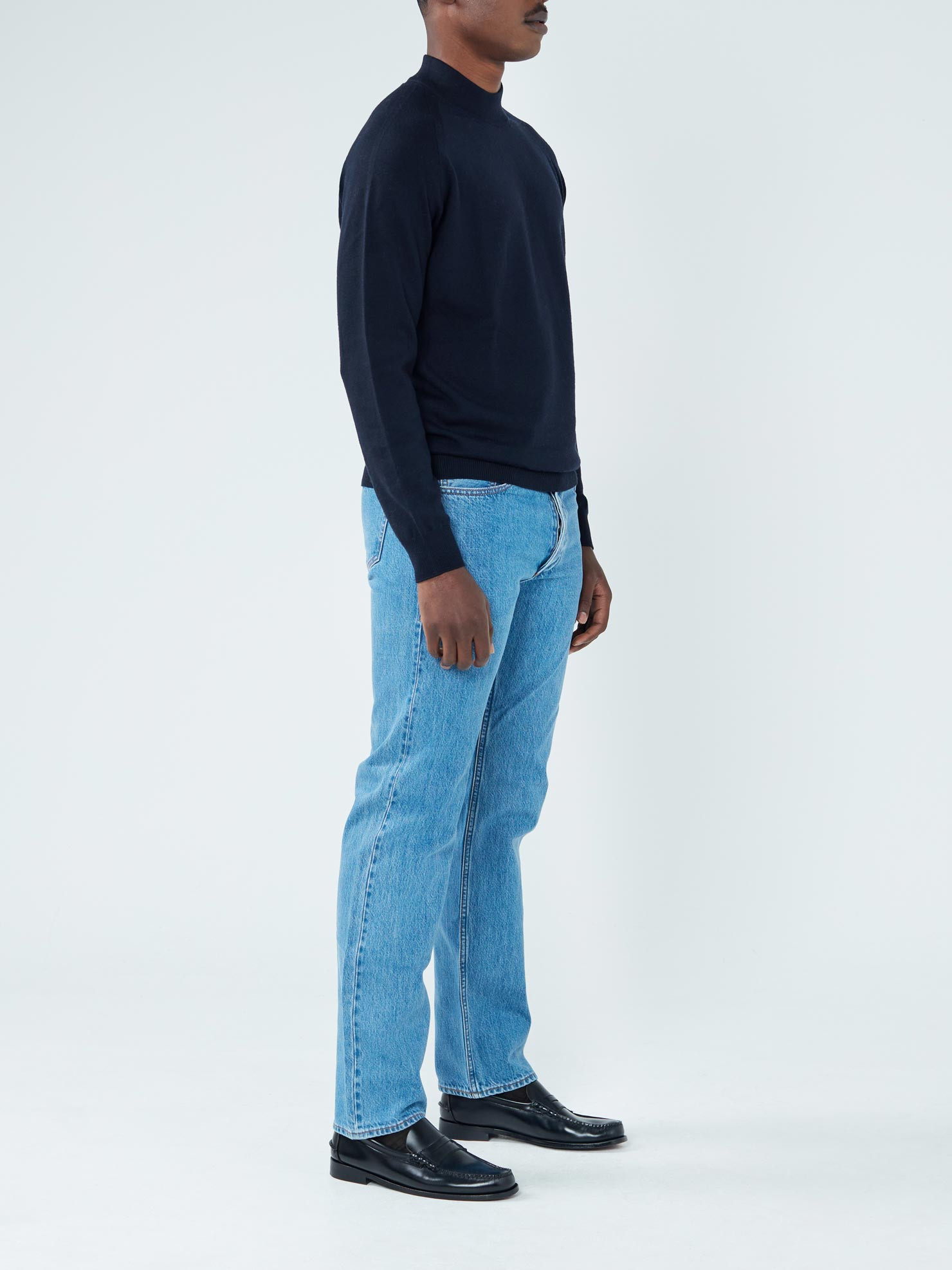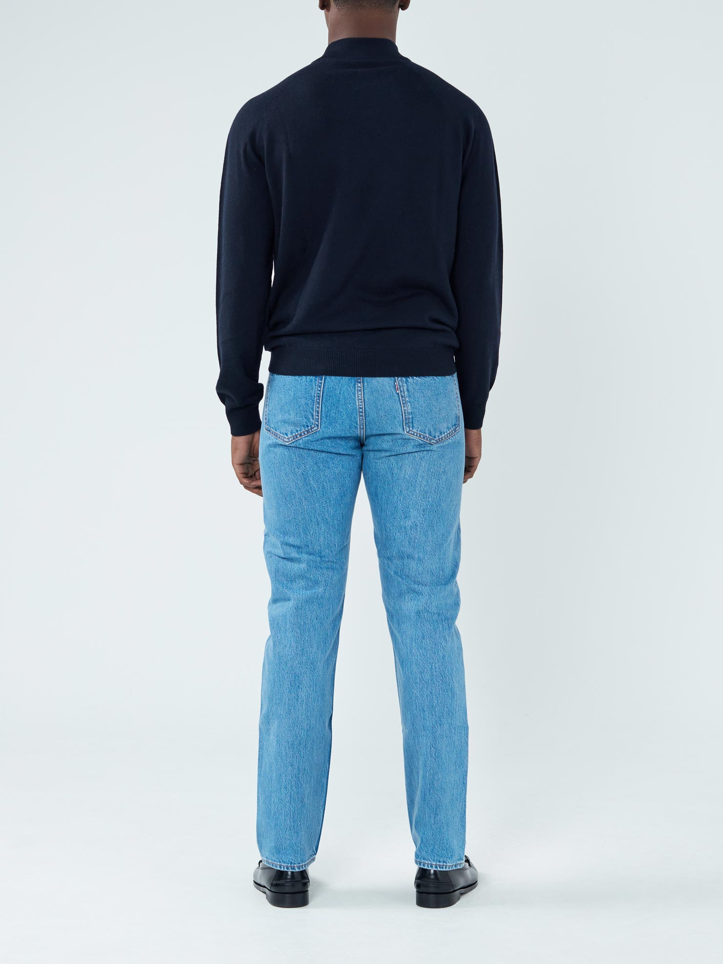 Pull à col montant et manches raglan bleu marine. Laine mérinos fabriqués dans un atelier spécialiste de la maille dans le nord de l’Italie. Les fils sont tissés et peignés sur place à partir de laine mérinos australienne extrafine. Un pull doux, confortable et chaud. Chaque pull est fabriqué à l’unité, à votre taille.