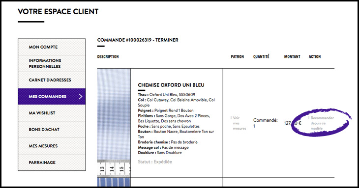 Après avoir cliqué sur ce lien, à droite de chaque chemise, vous verrez alors un lien intitulé « Recommander depuis ce modèle ». En cliquant sur ce lien le site ajoutera automatique la même chemise dans votre panier.