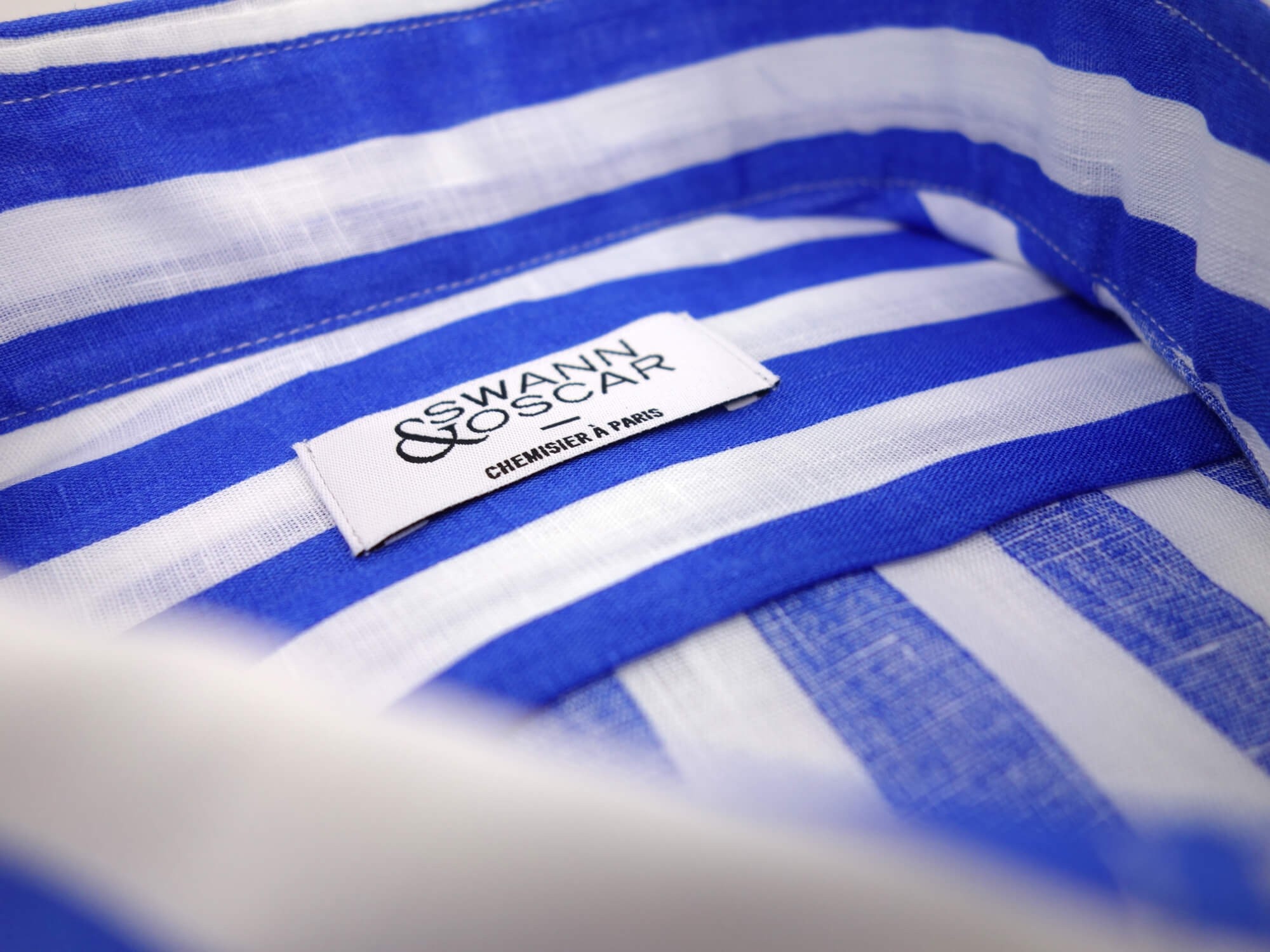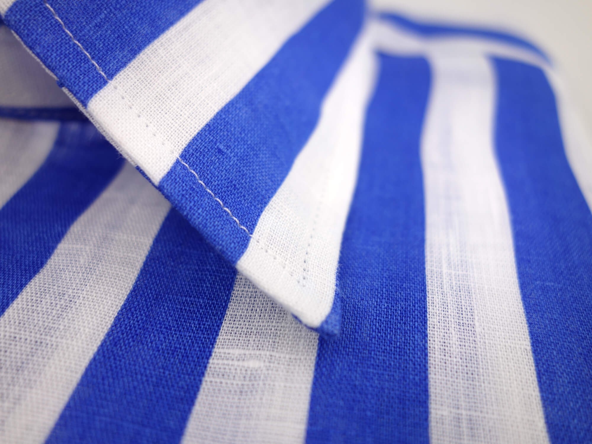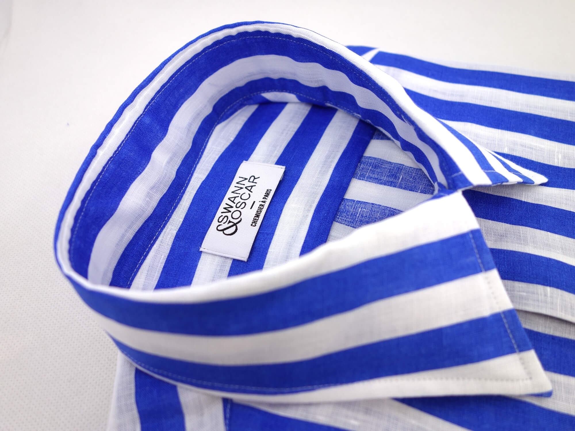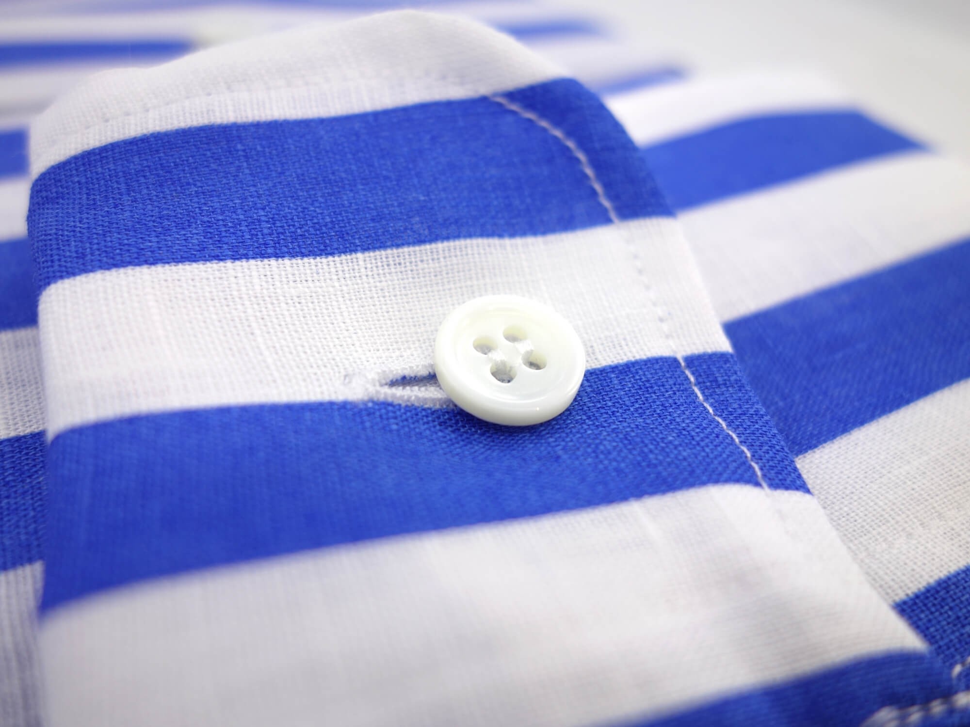 Une des plus belles qualités de Lin de chez Thomas Mason. Larges rayures bleues très sport, très belles. Une chemise plein été avec une couleur forte.