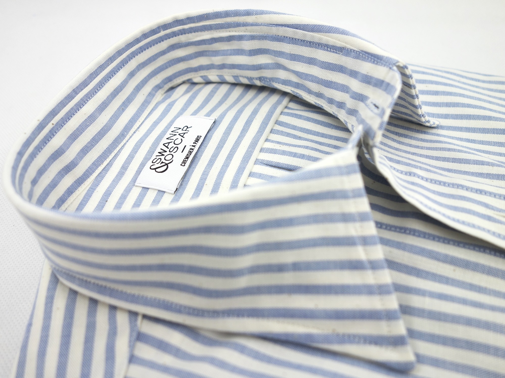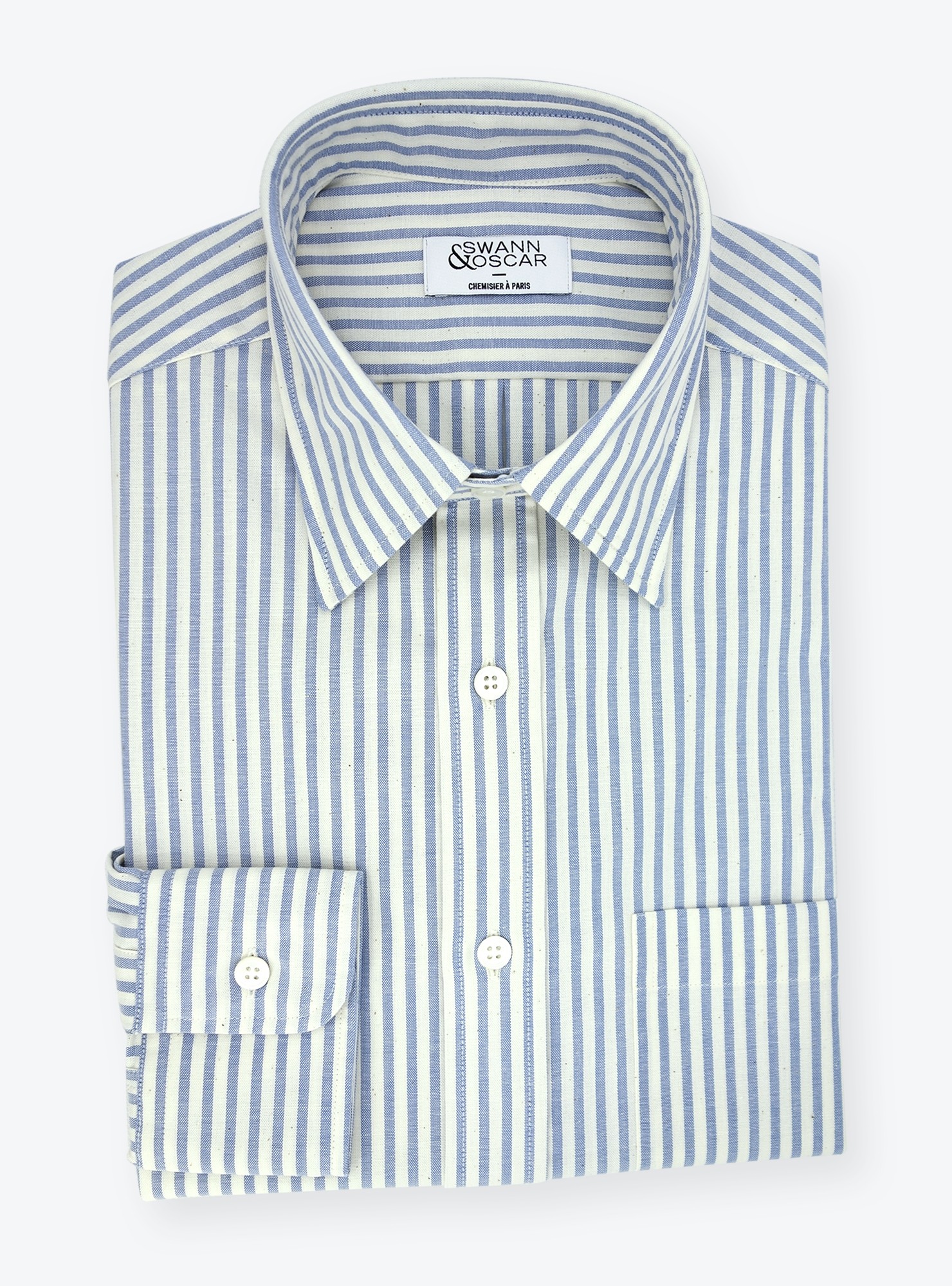Oxford rayé bleu de chez Albini. Rayures classiques mais avec une finition "raw" pour donner un aspect brut, très casual à ce tissu. Nous vous recommandons d'opter pour un col souple ou ultra souple.