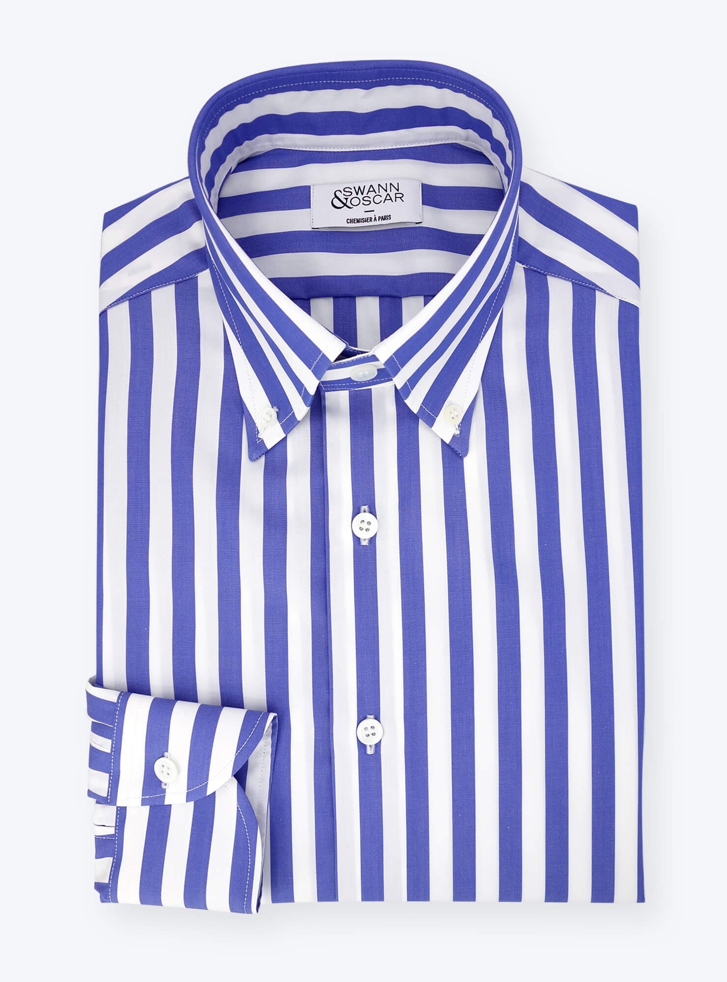 Popeline rayée bleu 120's double retors. Larges rayures, idéal pour une chemise d'été élégantes sous un blazer ou très décontractées avec un col button down très souple.