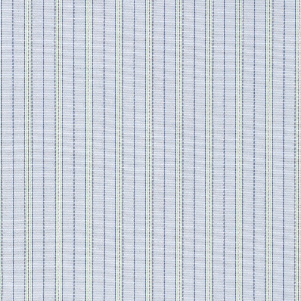 Popeline 120/2 Thomas Mason bleu à rayures bleu et vert. Tissé en Italie, le tissu est ensuite lavé pour lui donner un rendu mat, doux et souple.