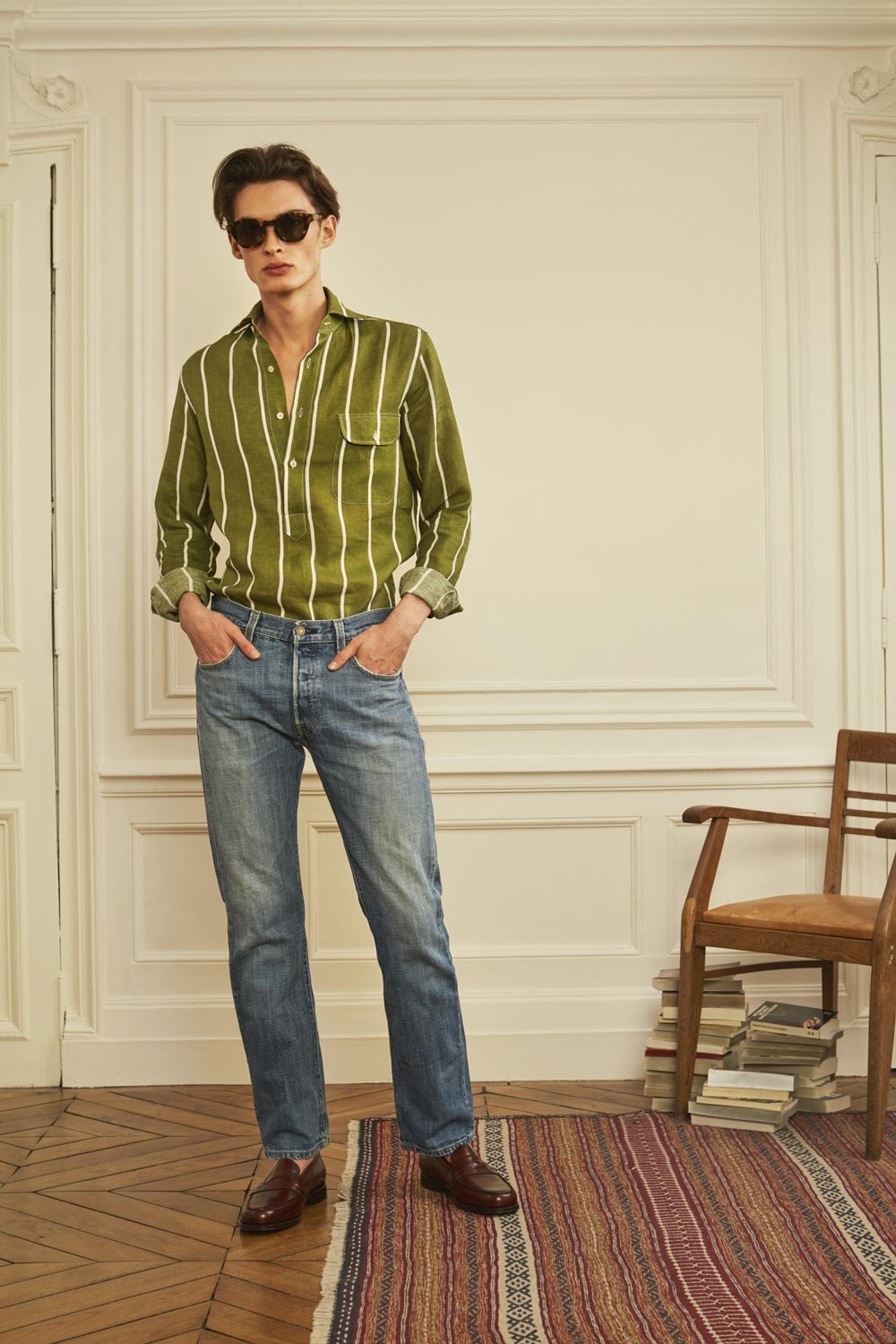 Lin rayé Albini, vert sublime et intense. Une chemise de plage, de bar, de diner d'été. Camp collar ou col classique ultra souple, il fait chaud, vous êtes beau.