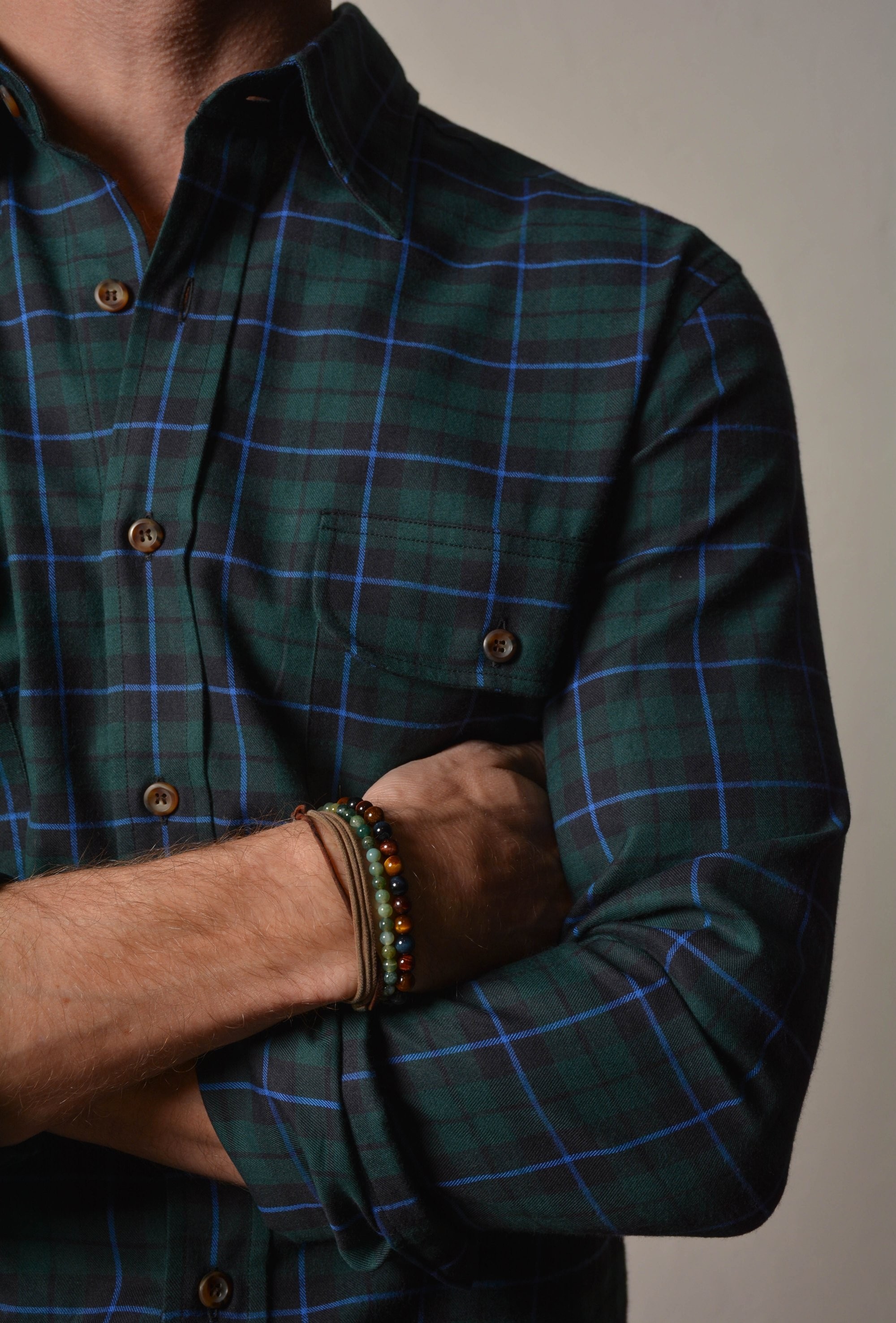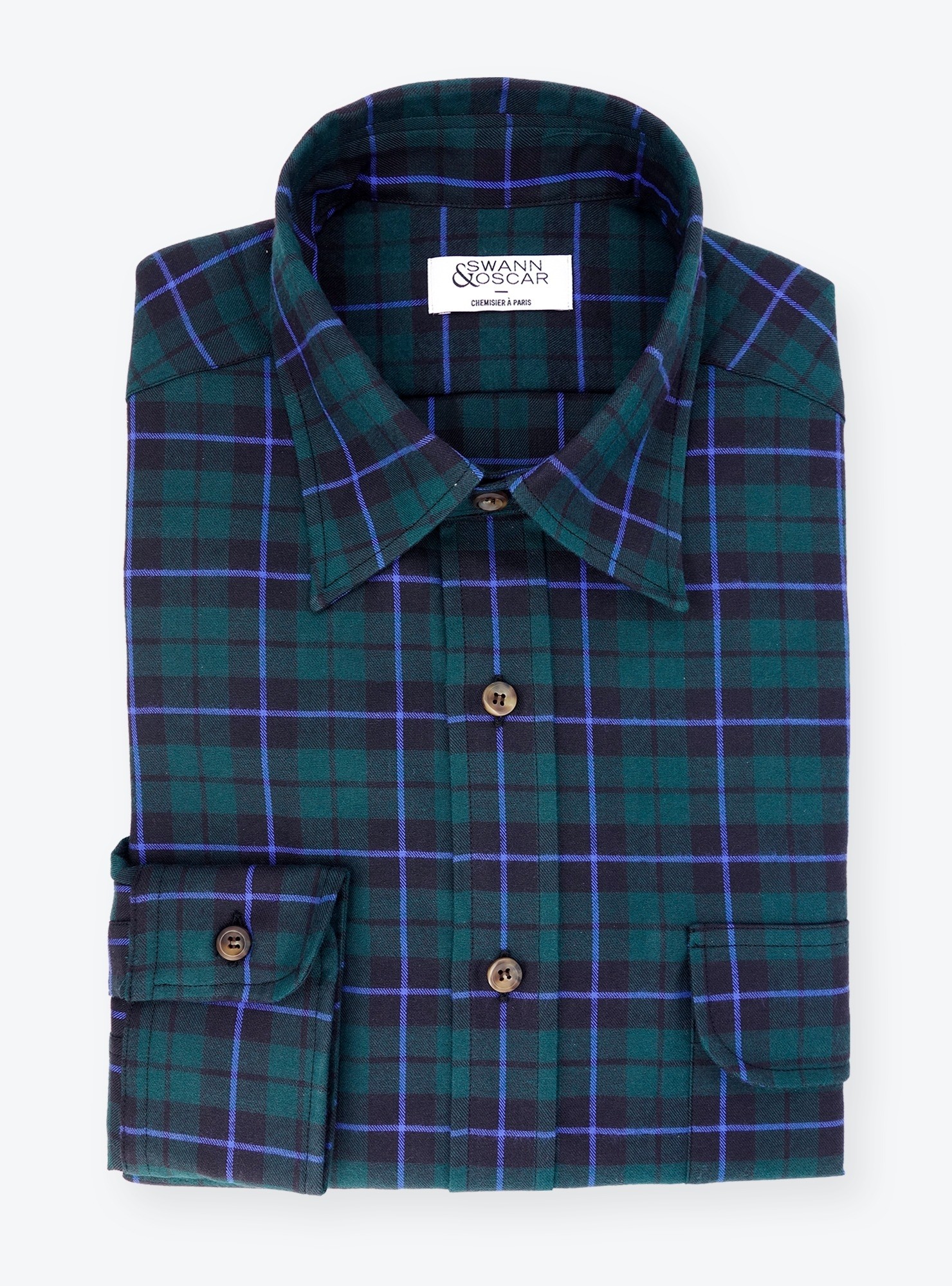 Flanelle de coton de chez Thomas Mason bleu et vert. Motif tartan, très chic et sobre, tout a fait adapté pour une partie de chasse dans les highland ou un brunch à Paris entre amis ! Tissu doux sur la peau et très confortable pour l'hiver.