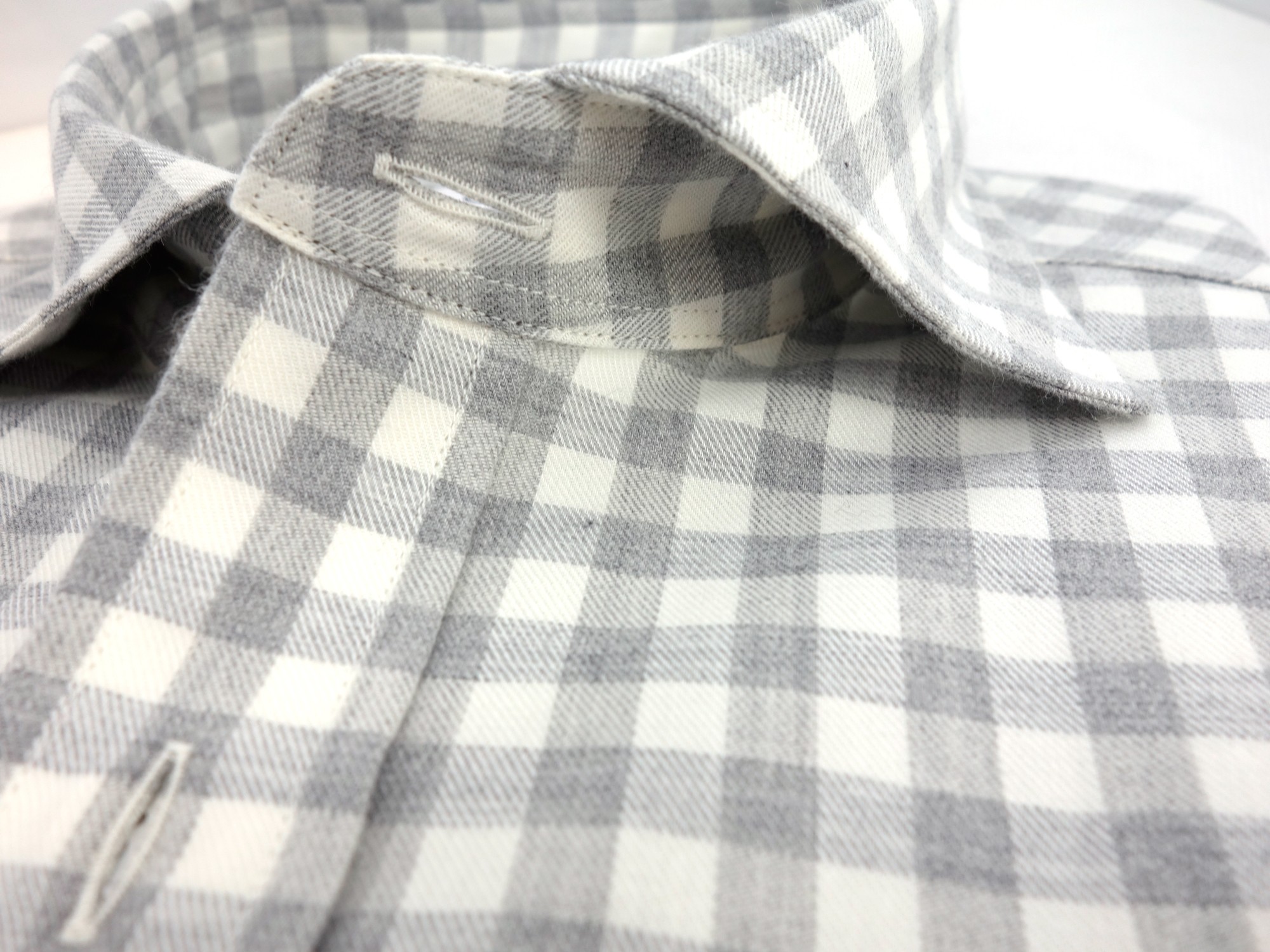 Tissu épais en coton gratté blanc à carreaux gris clair. Nous avons spécialement séléctionné ce tissu épais pour les clients qui recherche des chemises sports et confortables.