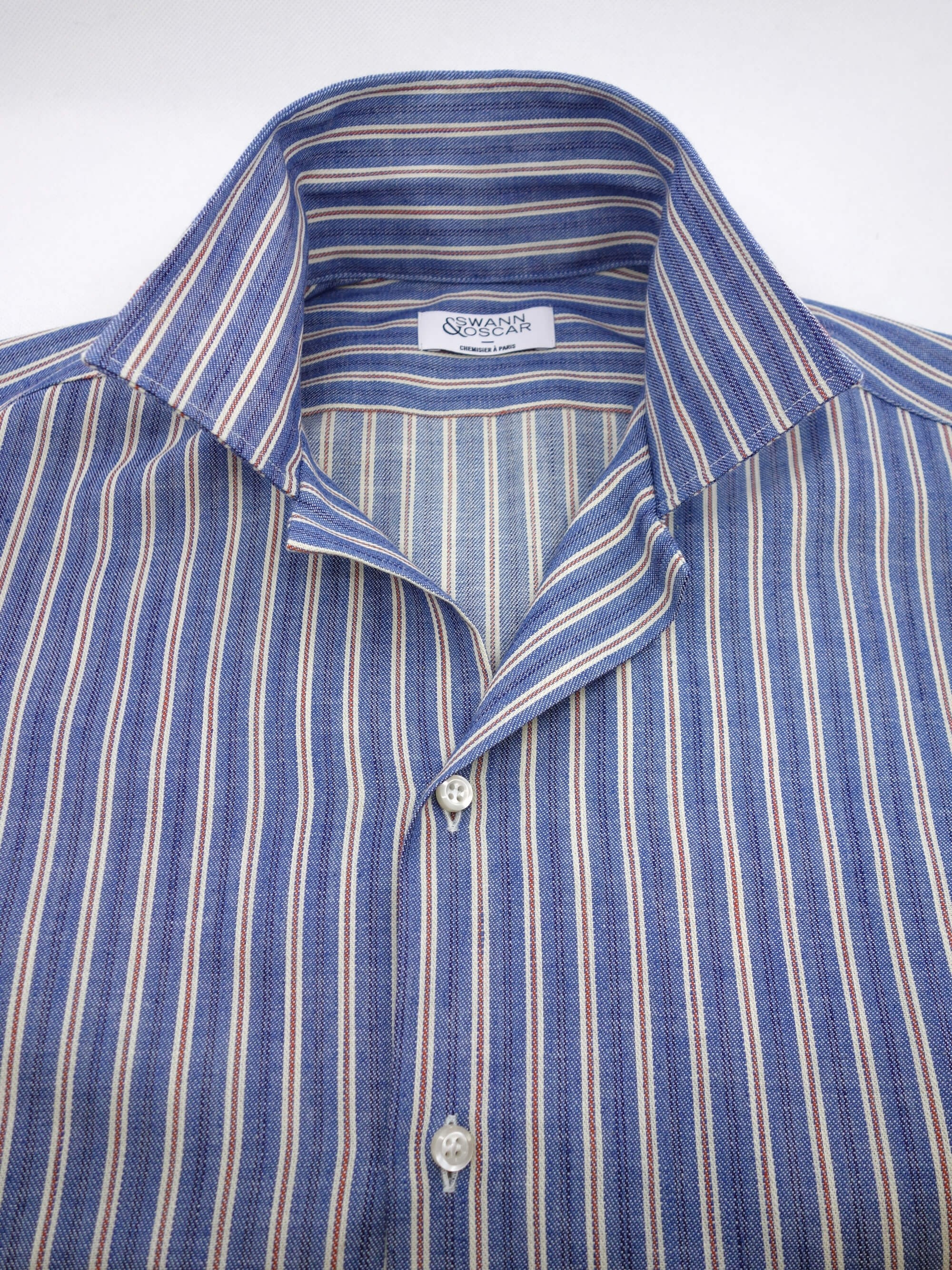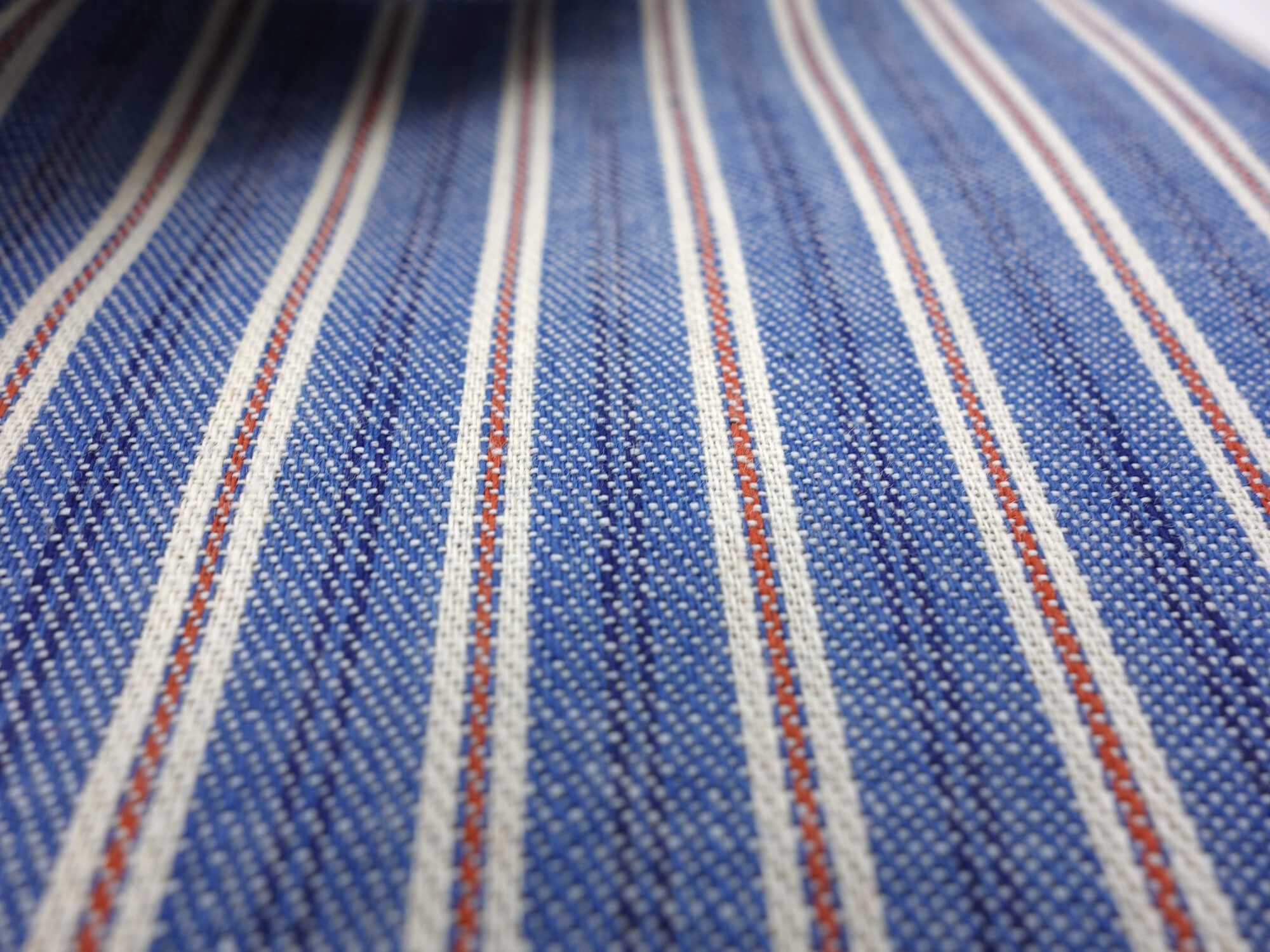 Denim de chez Abiate à rayures bleu et rouge. Ce tissu sport s'inspire des tissus casual produits au japon et des vêtements workwear. Le rendu rustique donnera un aspect vieilli, vintage à votre chemise. C'est une toile increvable idéale pour une chemise de weekend.