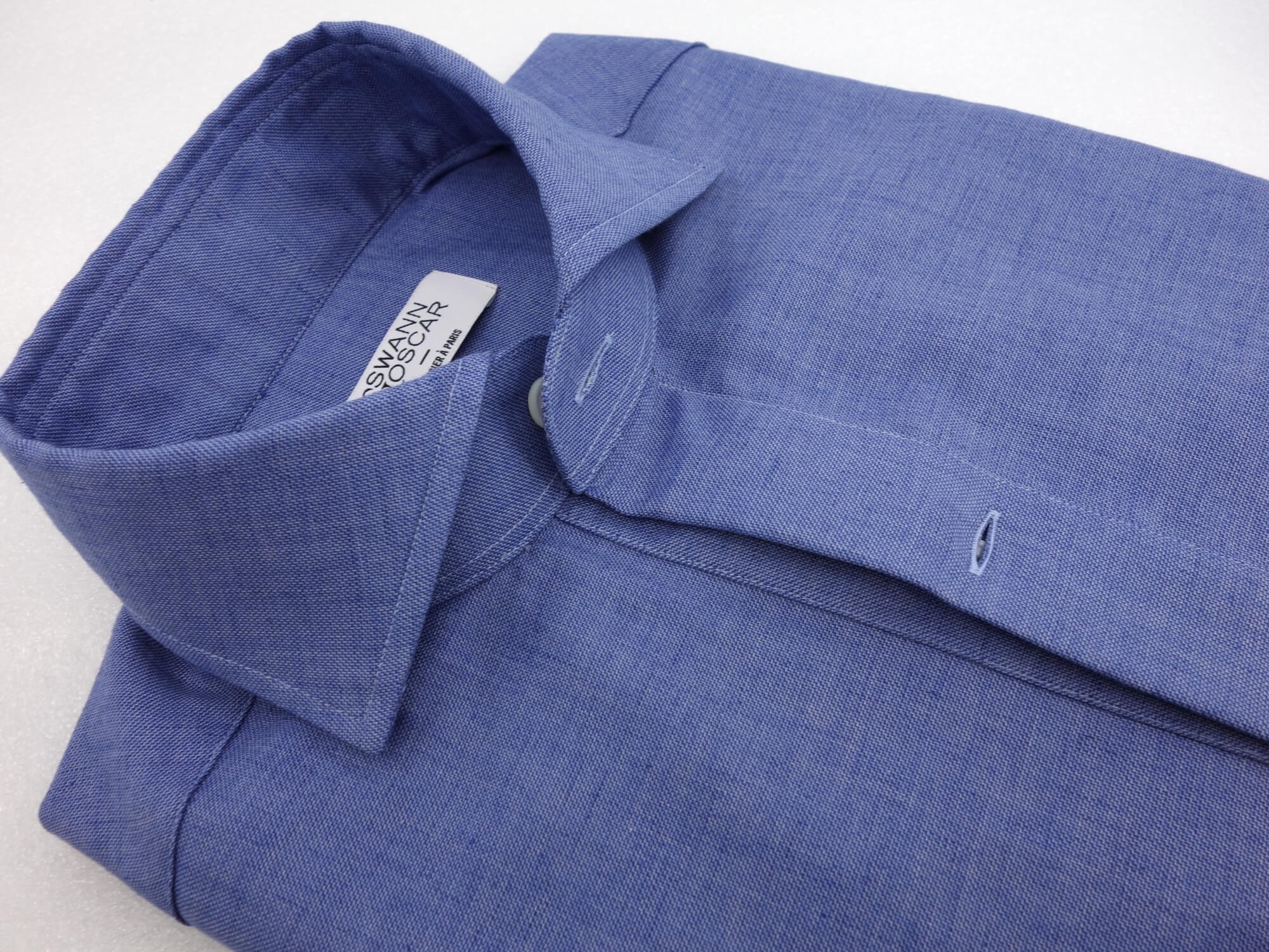 Twill coton et lin de chez Albini, double retors. Le tissu idéal pour l'été : une proportion de coton importante pour une belle tenue et un aspect soigné, 15% de lin pour une chemise fraiches et très agréable à porter par fortes chaleurs. Le tissu a un aspect proche du Jersey ce qui donne un côté très sport à la chemise.