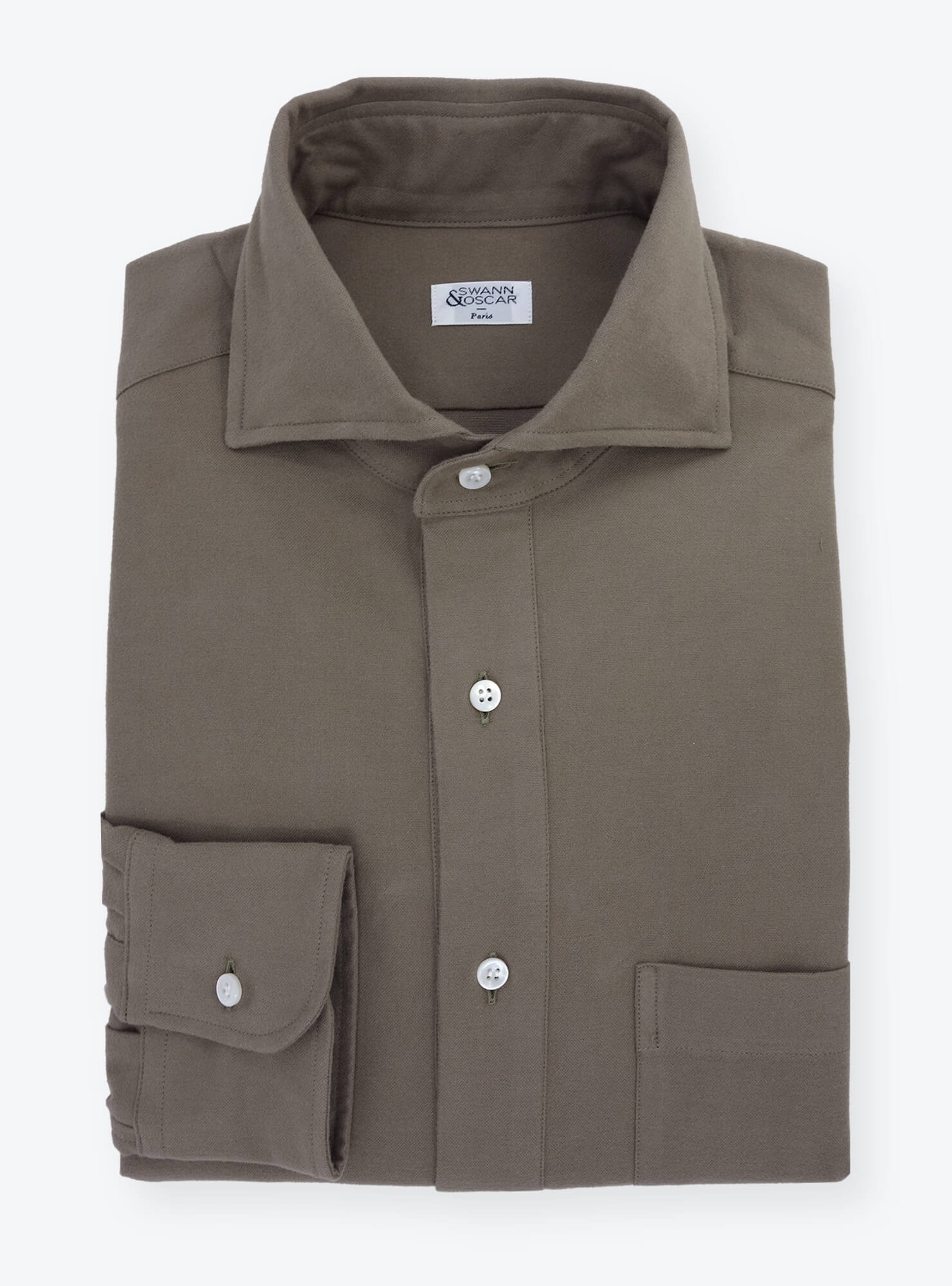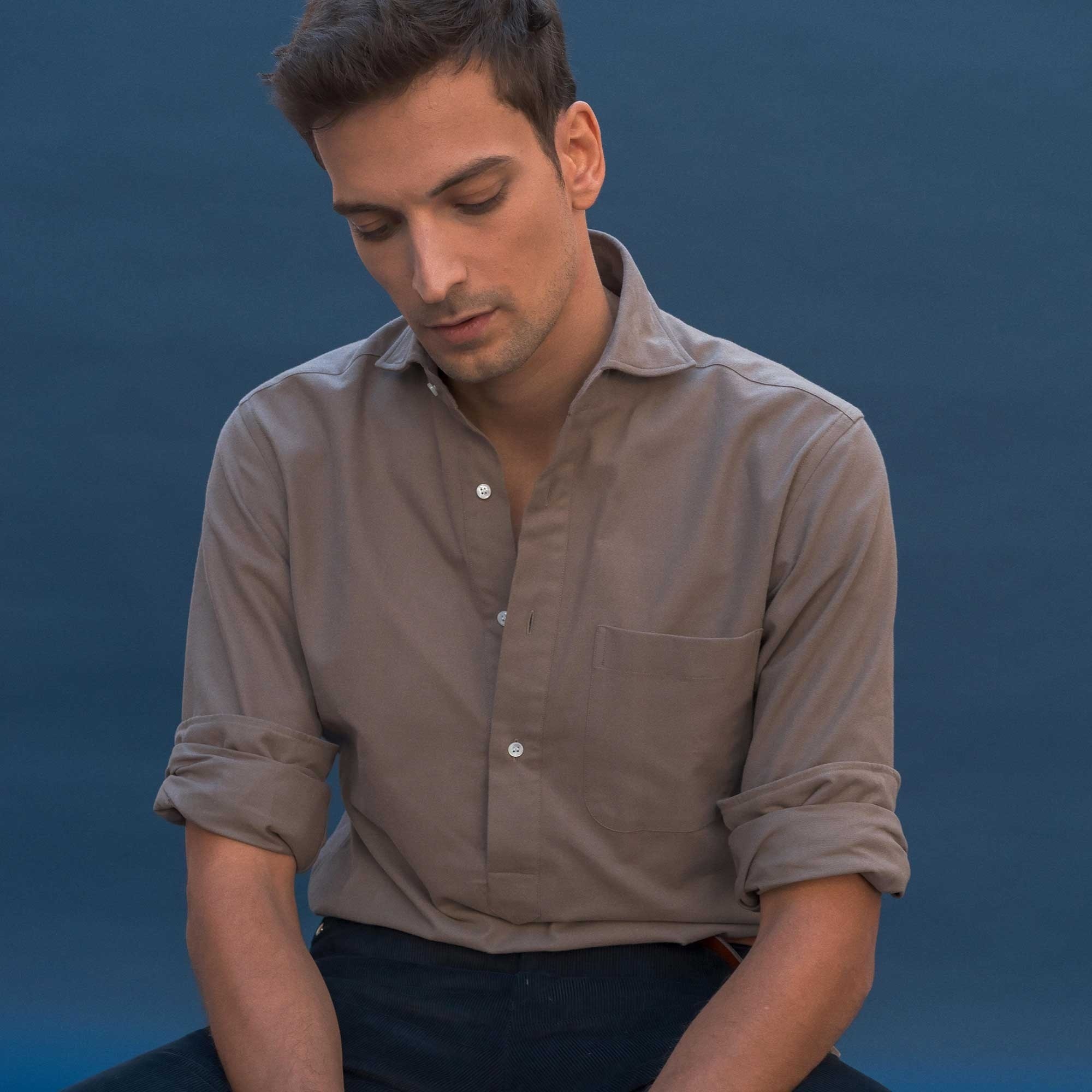 Flanelle de coton beige de chez Thomas Mason. Un tissu épais et doux, sport et élégant. Un excellent choix pour cet hiver. Si vous souhaitez renforcer l'effet sport, optez pour un col ultra souple. Compte tenu de l'épaisseur et de la densité du tissu, nous recommandons de laver ces chemises à froid pour éviter un rétrécissement excessif.