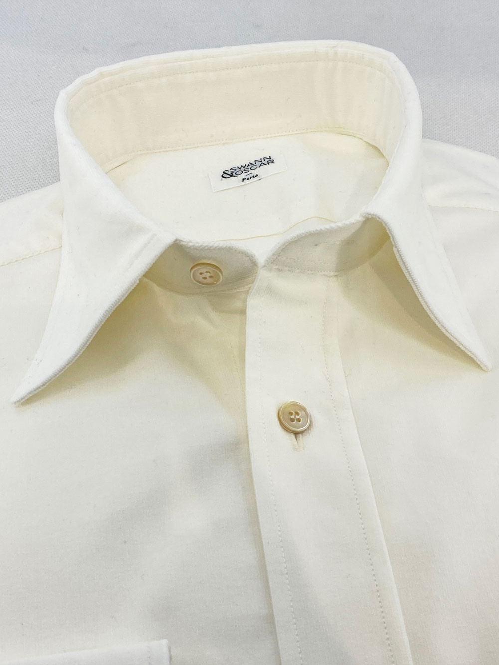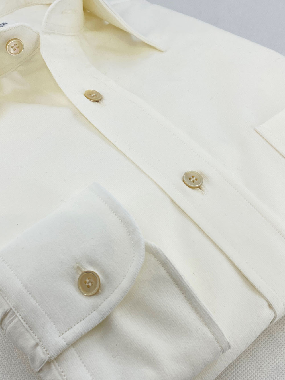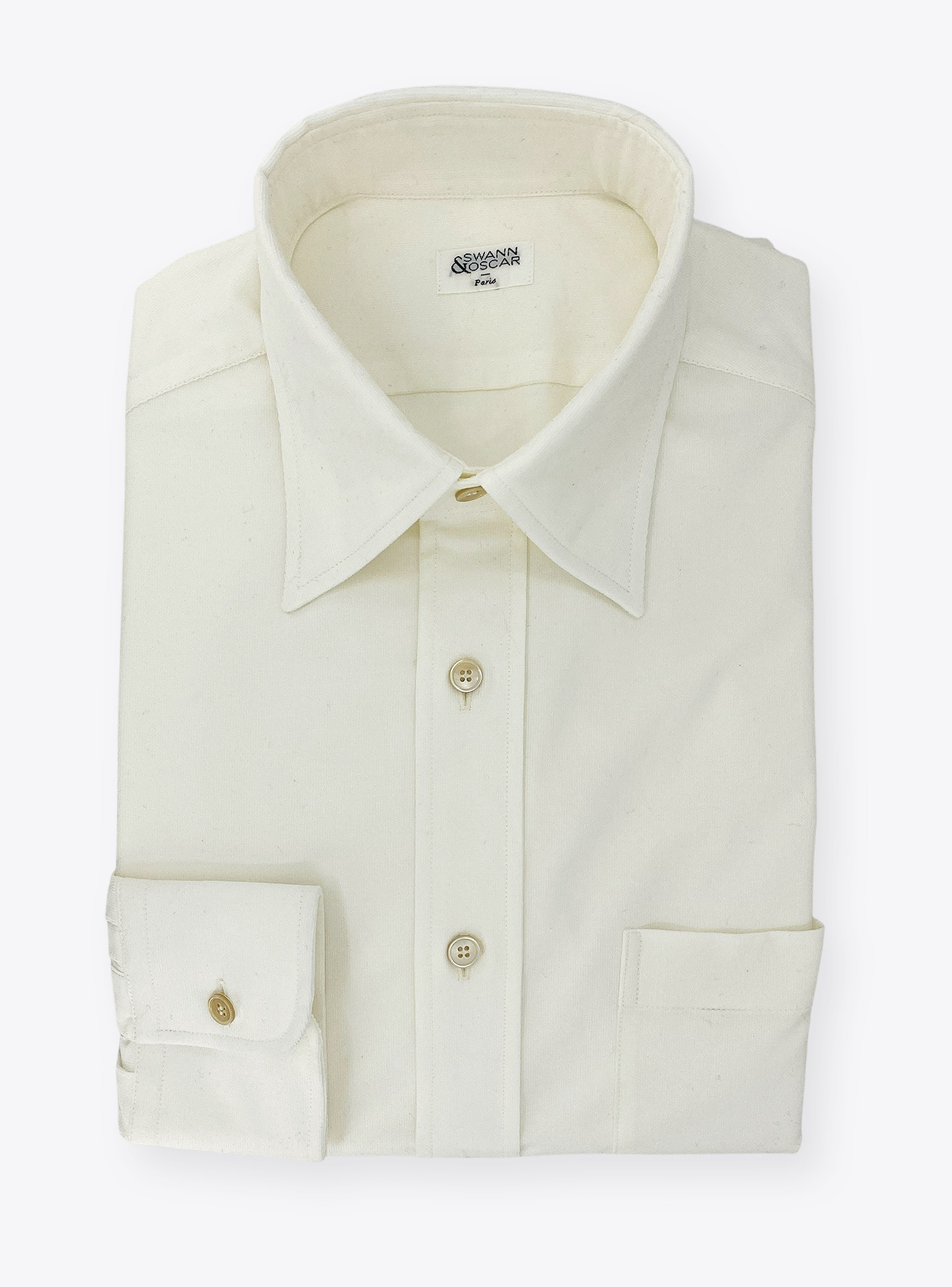 Velours blanc cassé de chez Albini. Le velours est une excellente alternative à la flanelle pour l'hiver. Chaud, confortable, la couleur crème lui donne un côté sport chic.