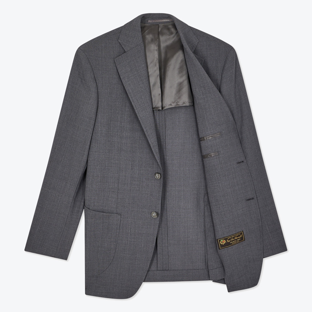 Veste classique non doublée en laine gris - Veste droite deux boutons, revers classique cran parisien, epaules souples padding léger, poches poitrine barchetta, deux poches plaquées arrondiés, deux fentes dos, surpirqures AMF 6mm, entièrement non doublée