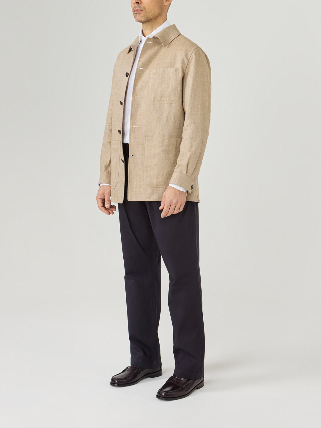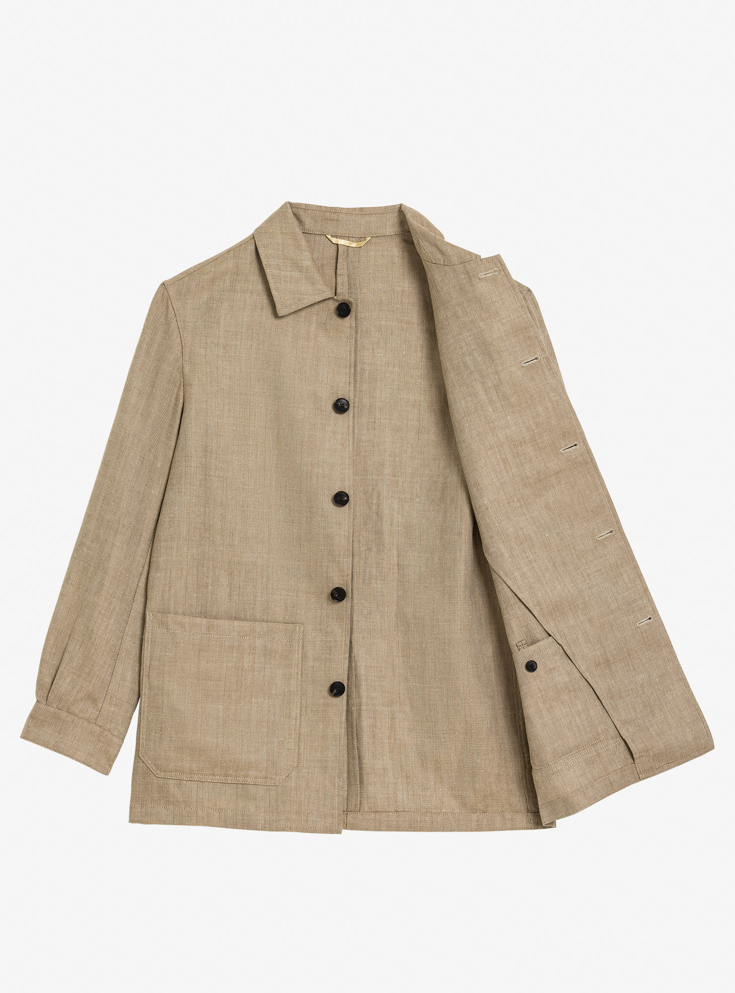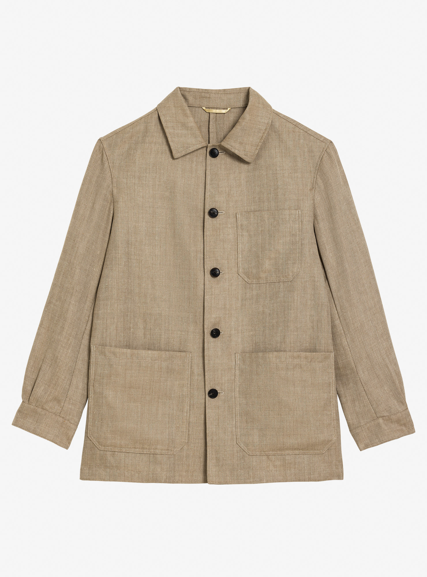 Veste de Travail en Laine et Lin à motif chevron beige. Col chemise, fermeture 5 boutons, poche poitrine plaquée, poches latérales plaquées, manches boutonnées et 2 plis.