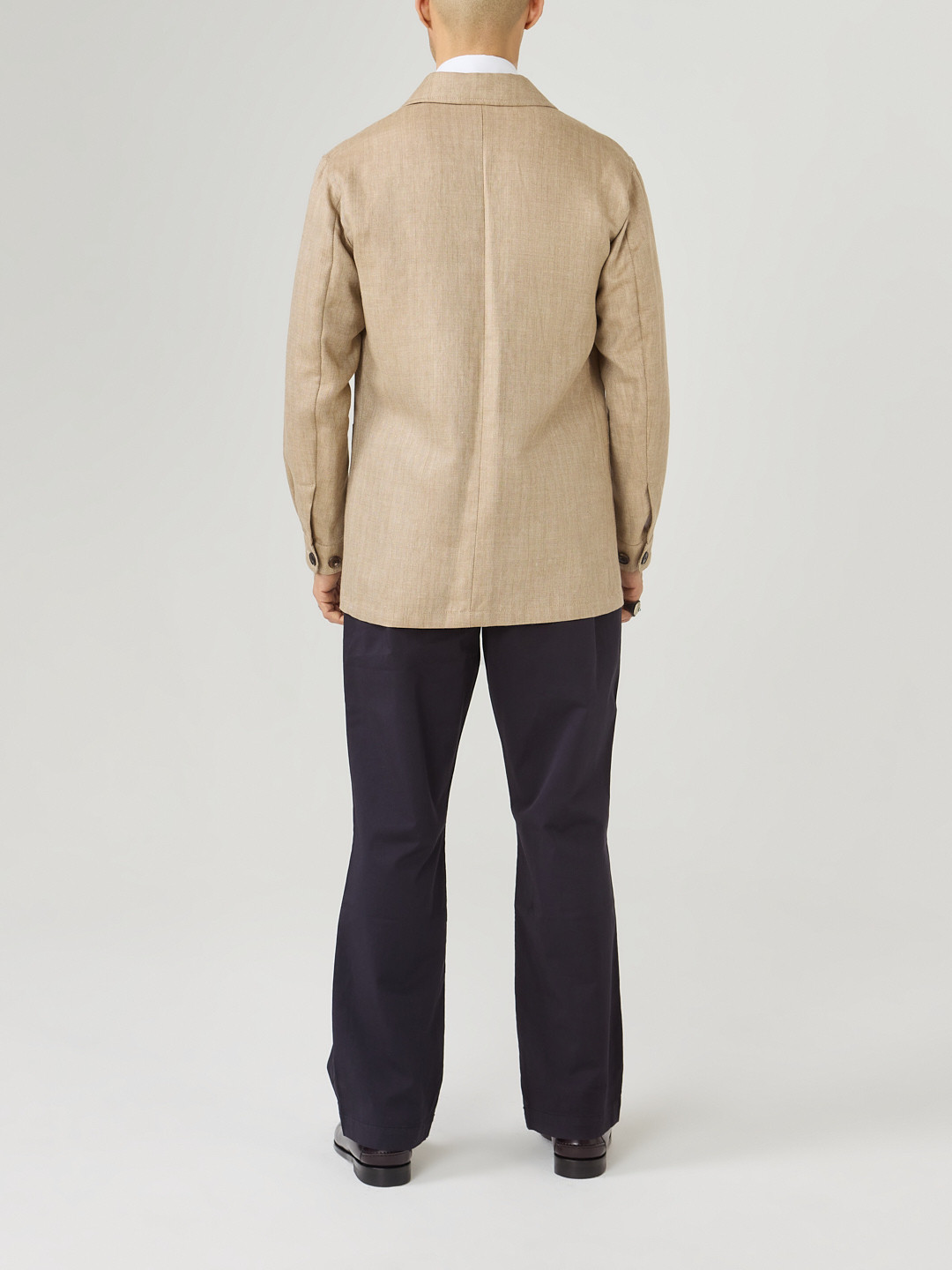 Tissé en Angleterre dans un mélange de laine et de lin, ce tissu aux chevrons discrets, traversé de reflets chauds a des faux airs de solaro. Une matière vivante, qui change selon la lumière, et donne à cette pièce un charme particulier — à mi-chemin entre la simplicité d’une veste d’atelier et l’élégance décontractée d’une veste d’été.