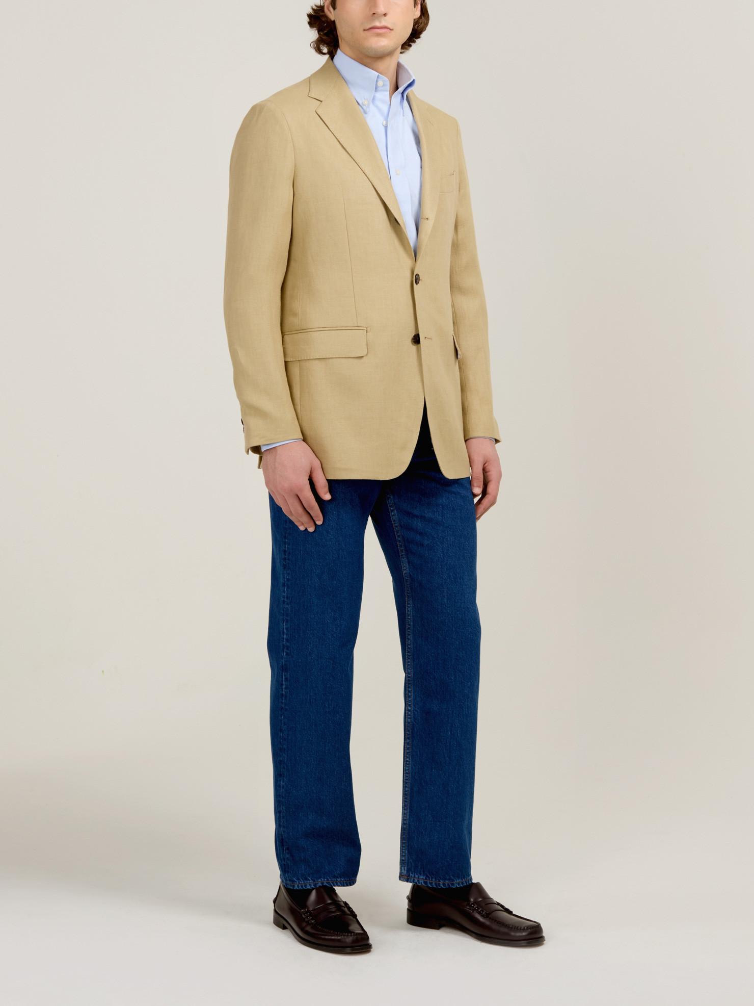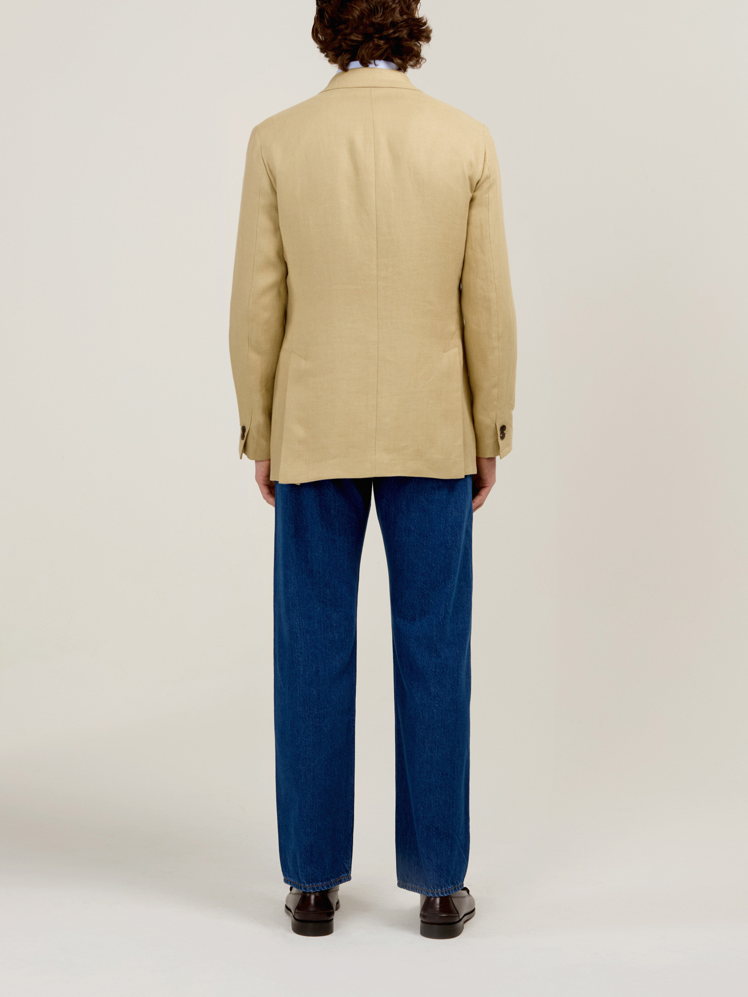 Veste droite 2,5 boutons beige en lin. Montage non construit, épaules sans épaulette, poches latérales à rabat droit, 2 fentes dos, doublure intérieure semi doublée.