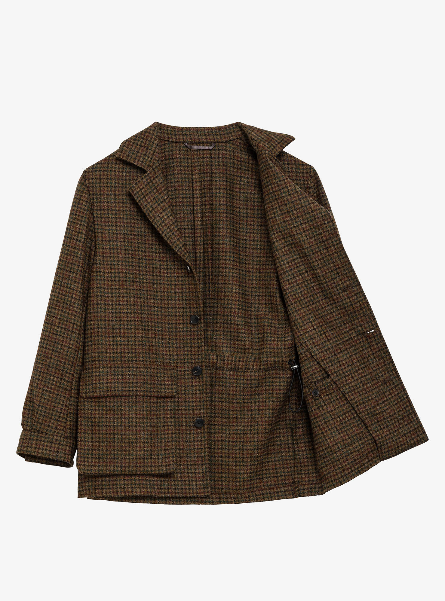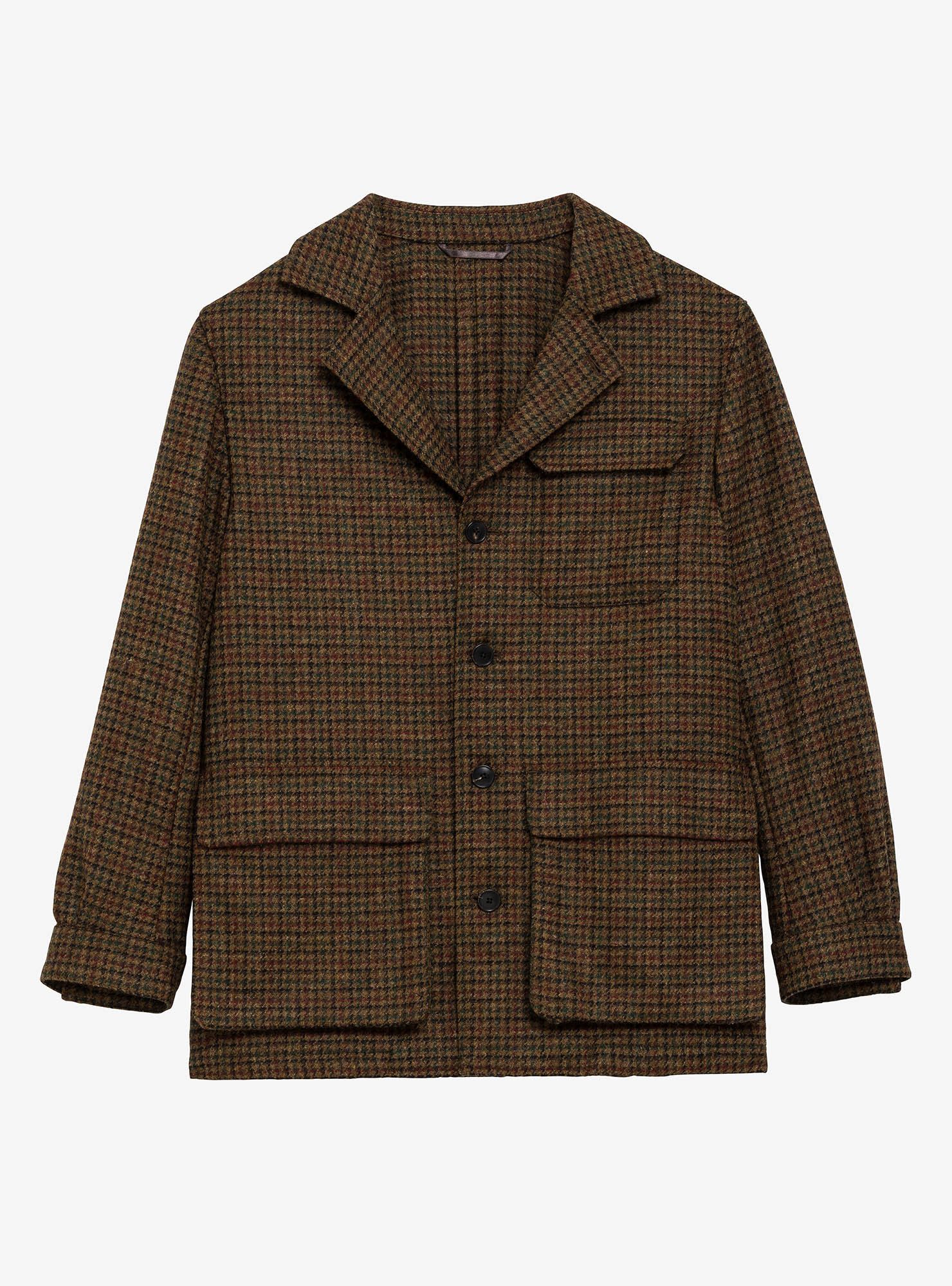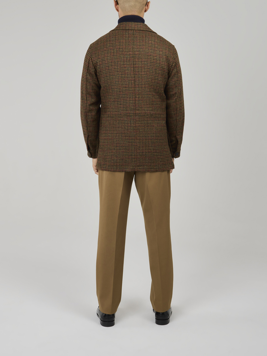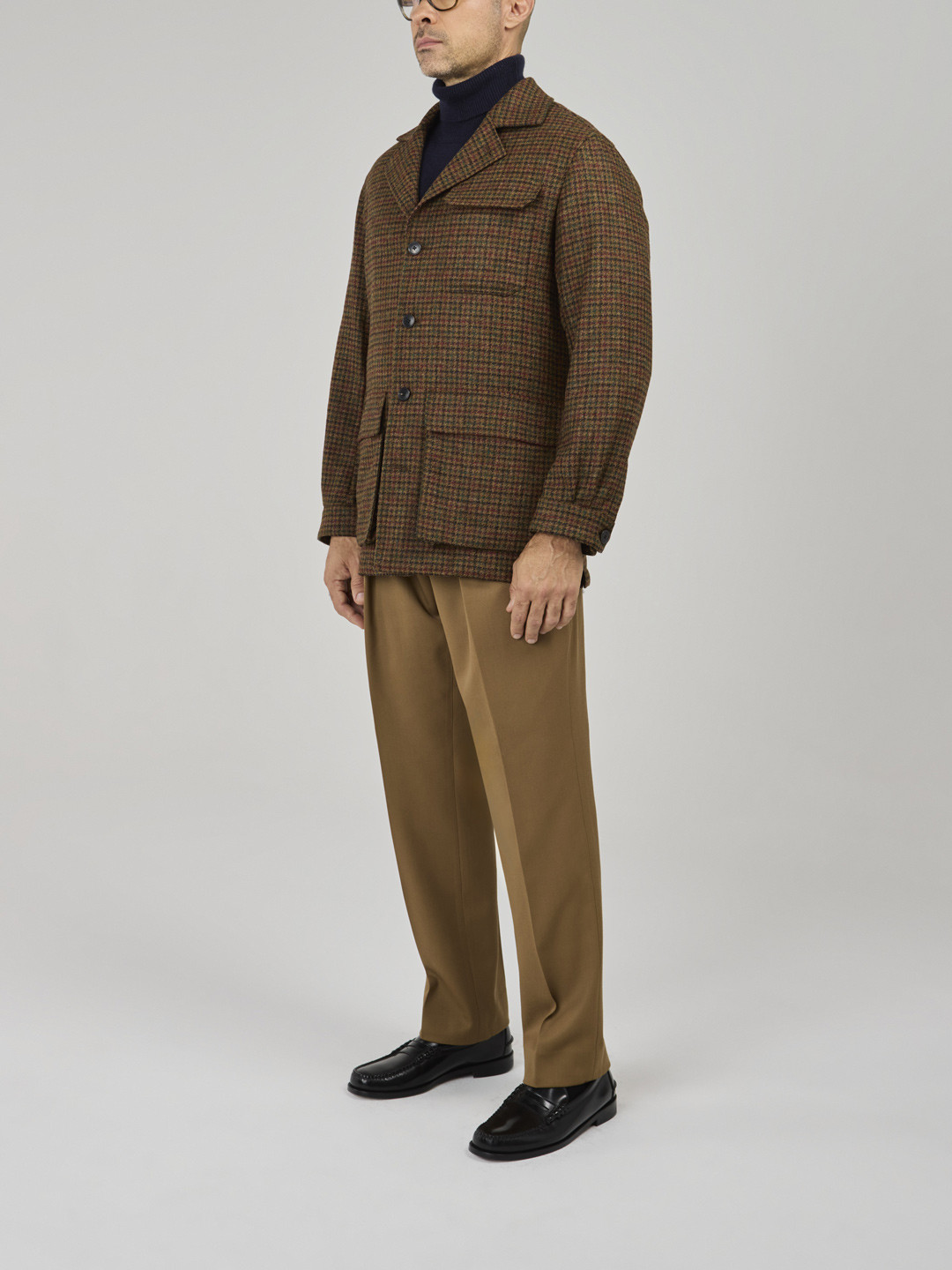 Veste Saharienne Tweed à motif Gun Club Marron et Rouge - Veste sport quatre boutons entièrement non doublée, 1 poche poitrinel à rabat, 2 poches coté à rabat. Manche à pli et poignets boutonnés.