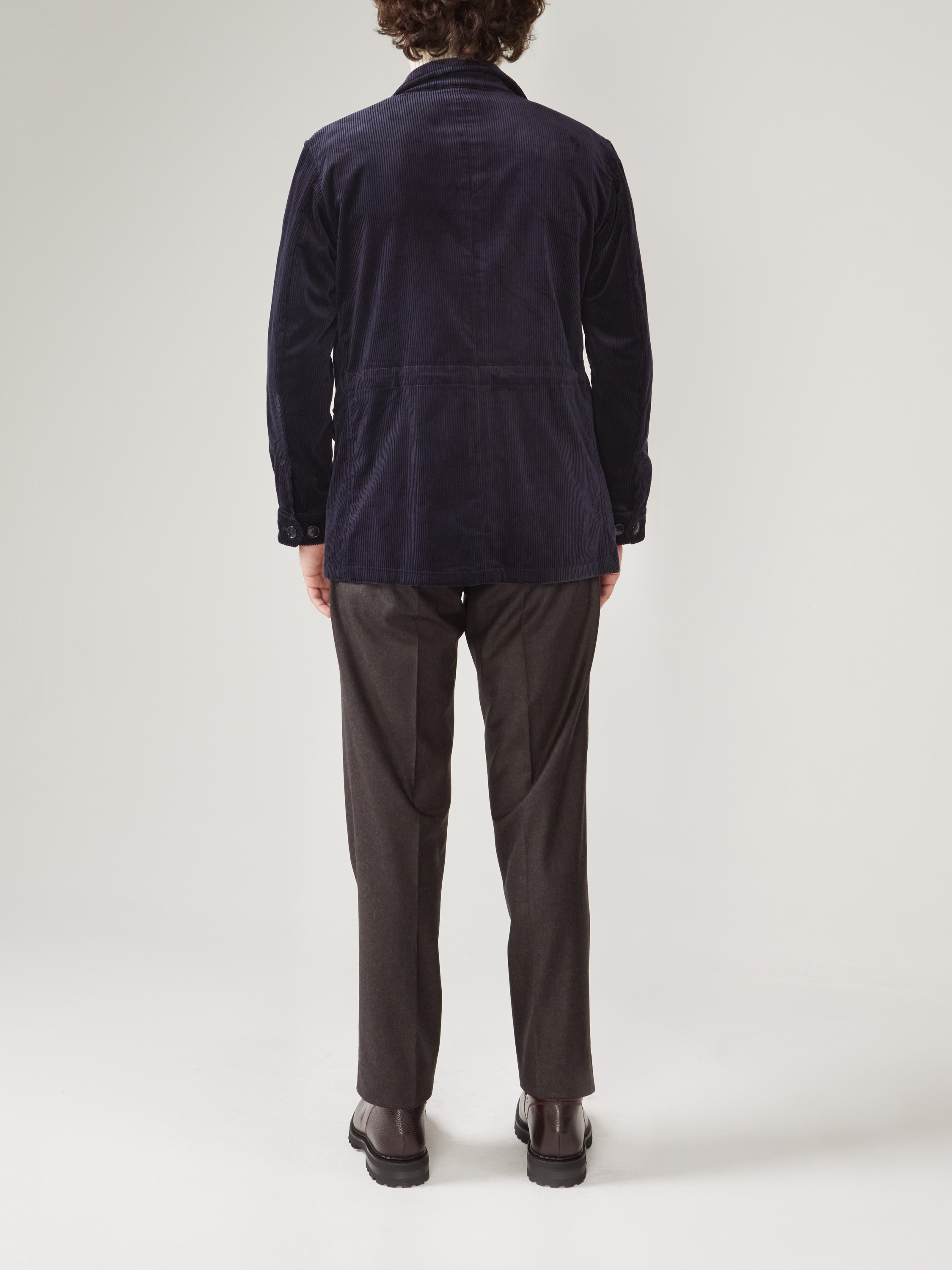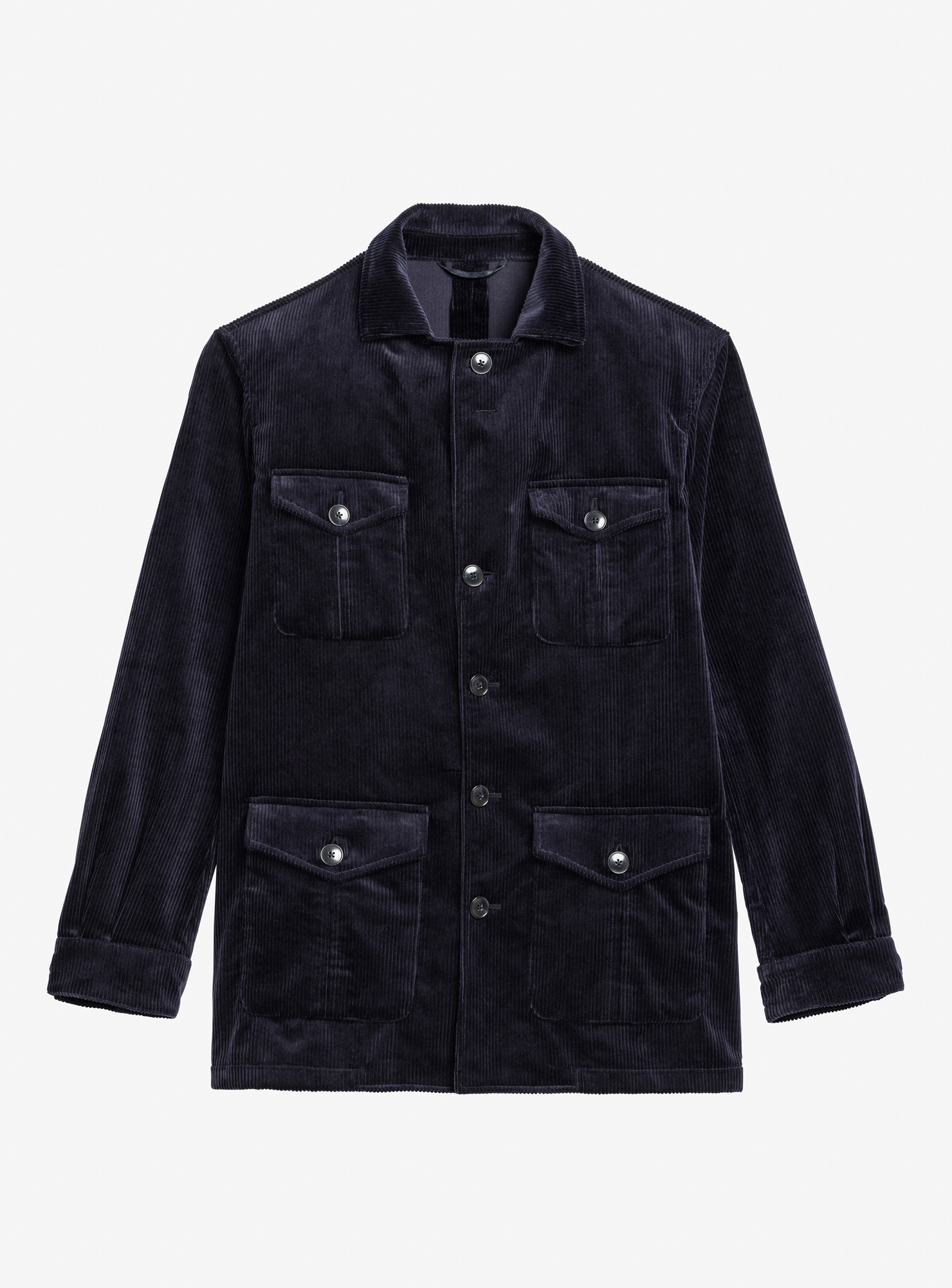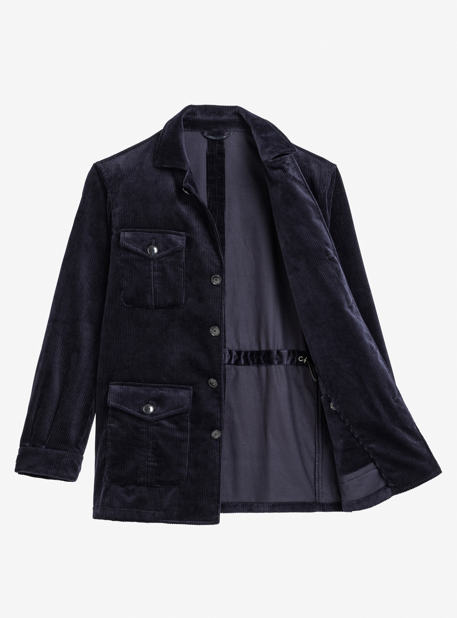 Veste Saharienne Velours Cotelé Marine - Veste sport quatre boutons entièrement non doublée, 2 poches poitrine à soufflet et rabat, 2 poches coté à soufflet et rabat. Manche à pli, cordon de serrage intérieur. La saharienne en velours est la version hivernale de ce classique du vestiaire sport. Confectionnée dans un velours italien, à la fois doux et robuste, elle est l'alliée idéale de vos week-ends. Portez-la avec un pantalon en laine ou un jean, par-dessus un généreux col roulé, pour une allure élégante et décontractée.
