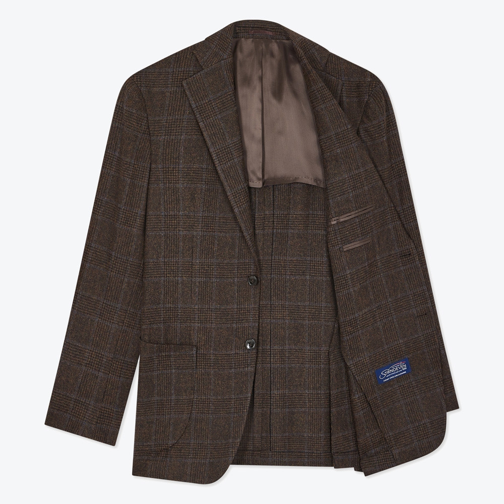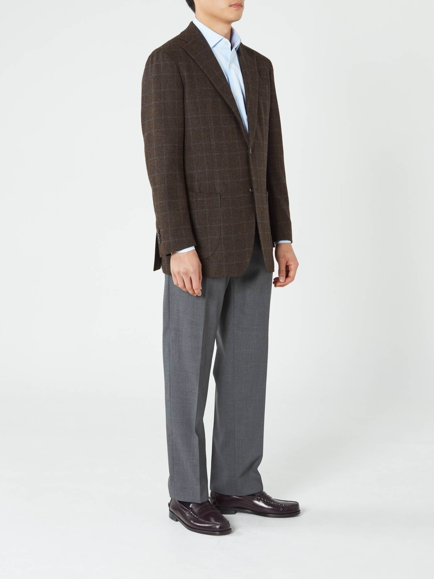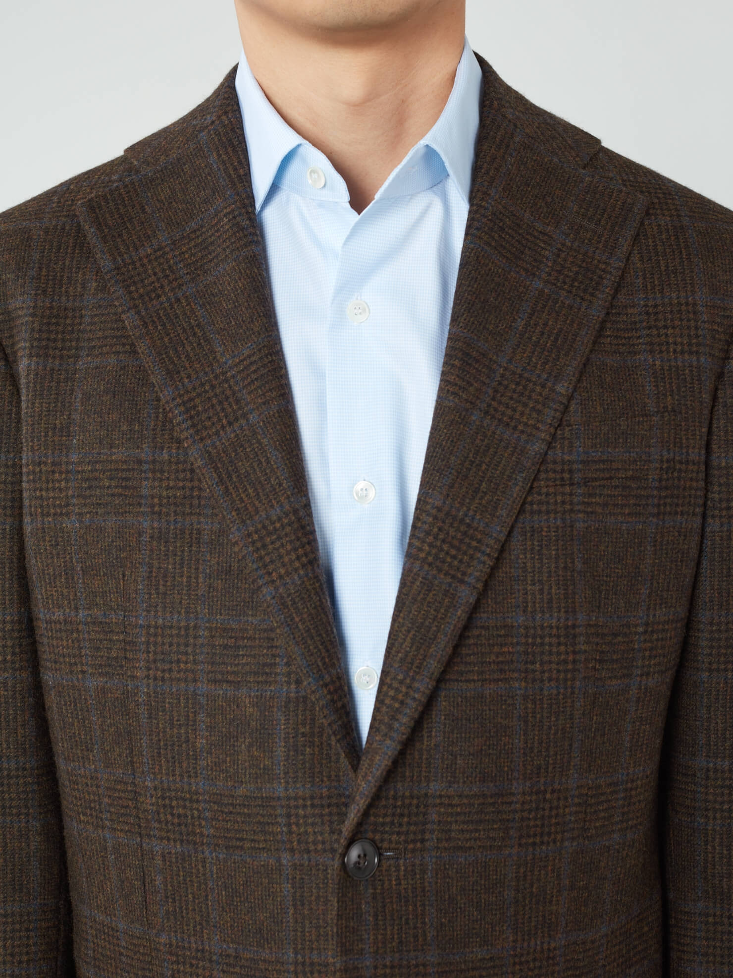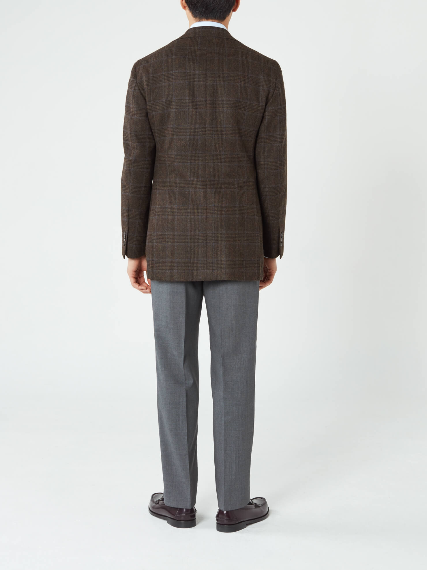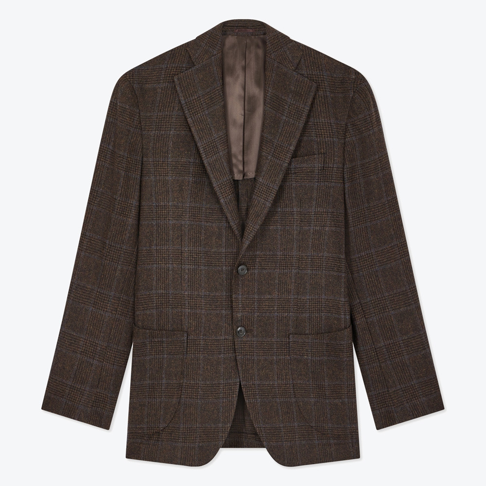 Veste classique non doublée en tweed de laine motif Prince de Galles Marron. Veste droite deux boutons, revers classique cran parisien, épaule souple padding léger, poche poitrine barchetta, deux poches plaquées arrondies, deux fentes dos, surpirqûres AMF 6mm, entièrement non doublée.