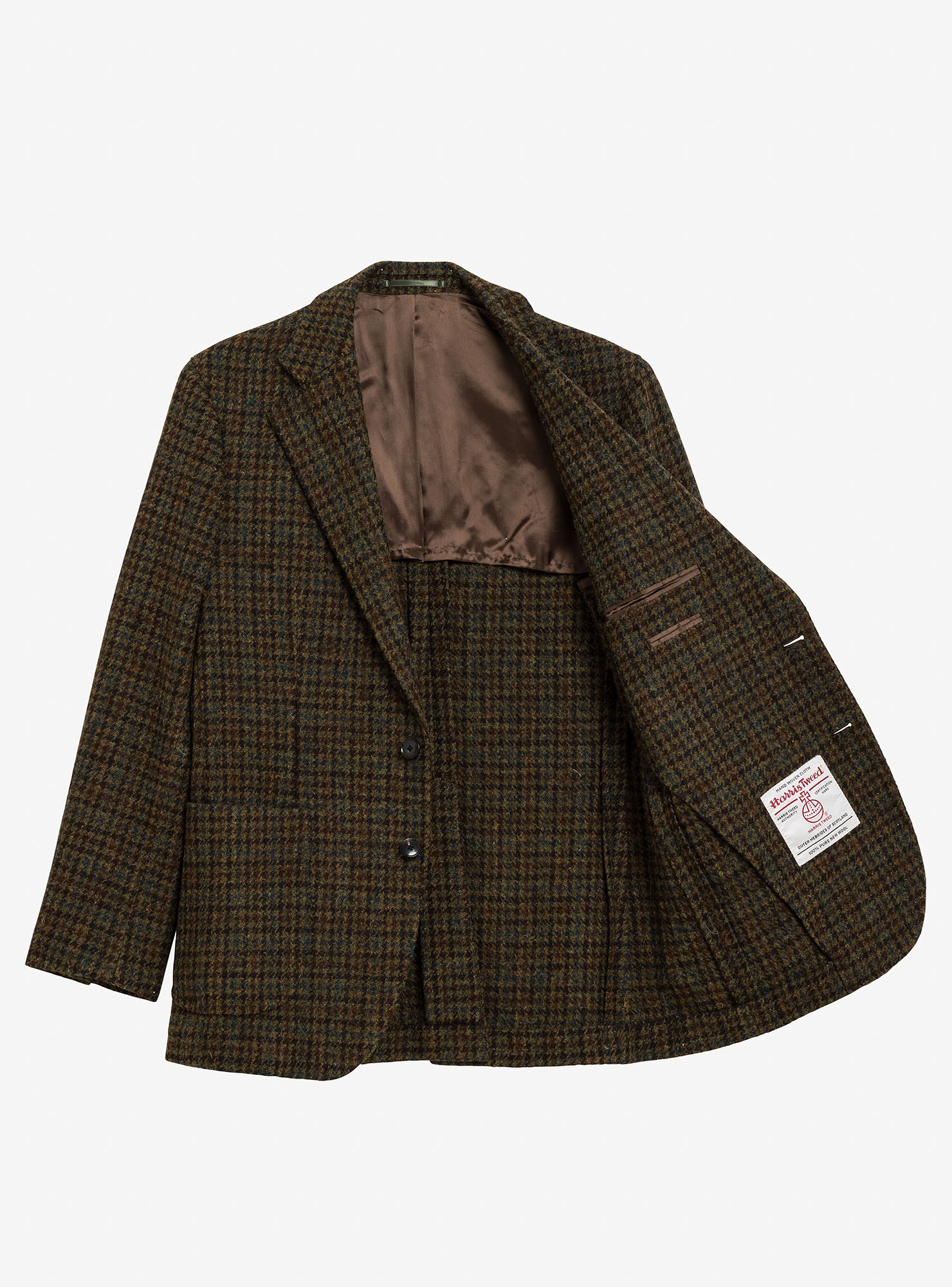 Veste droite 2 boutons beige en tweed à motif Gun Club Harris Tweed. Montage non construit, épaules sans épaulette, poches latérales plaquées, 1 fente dos, doublure intérieure entièrement doublée.