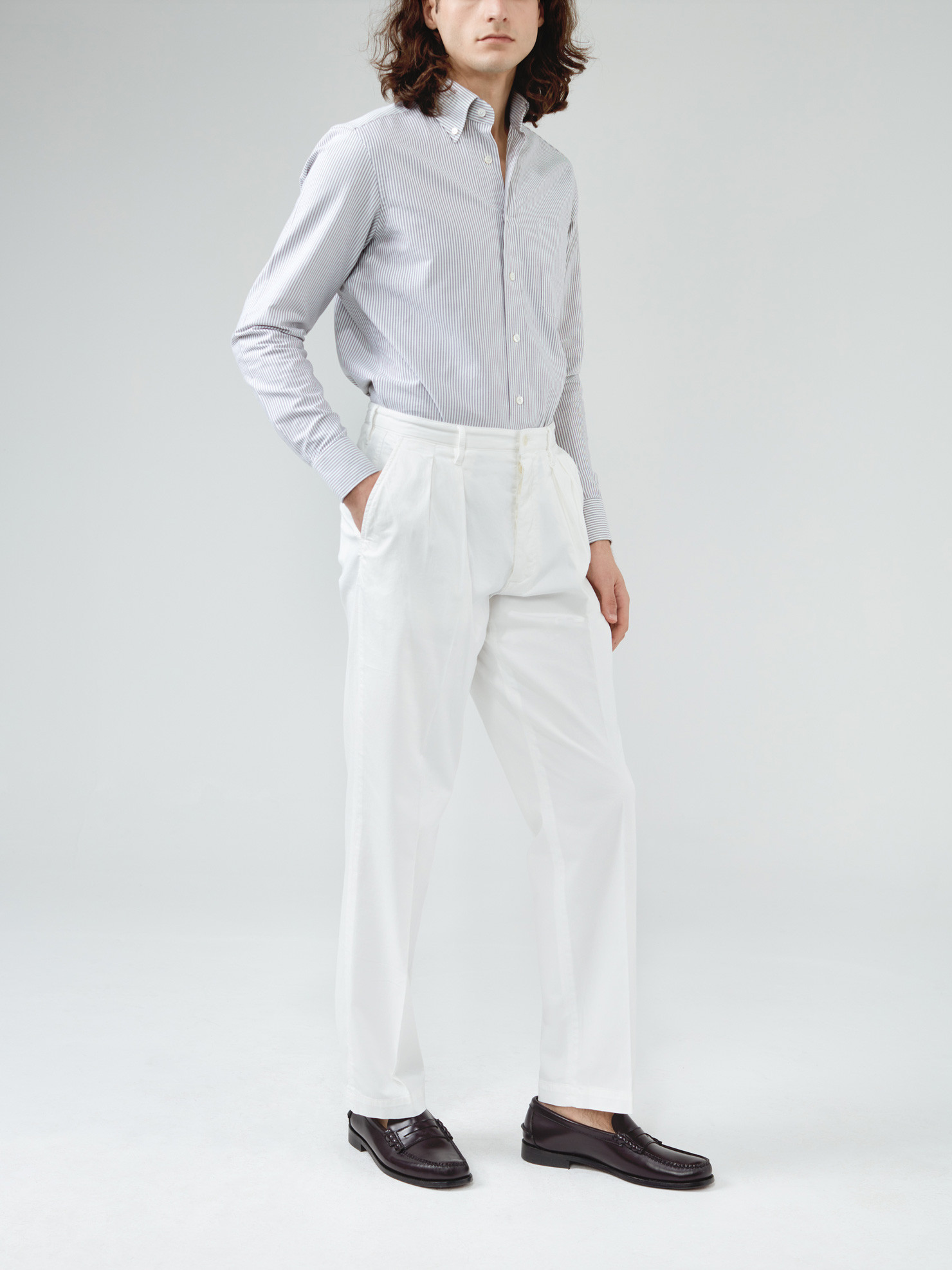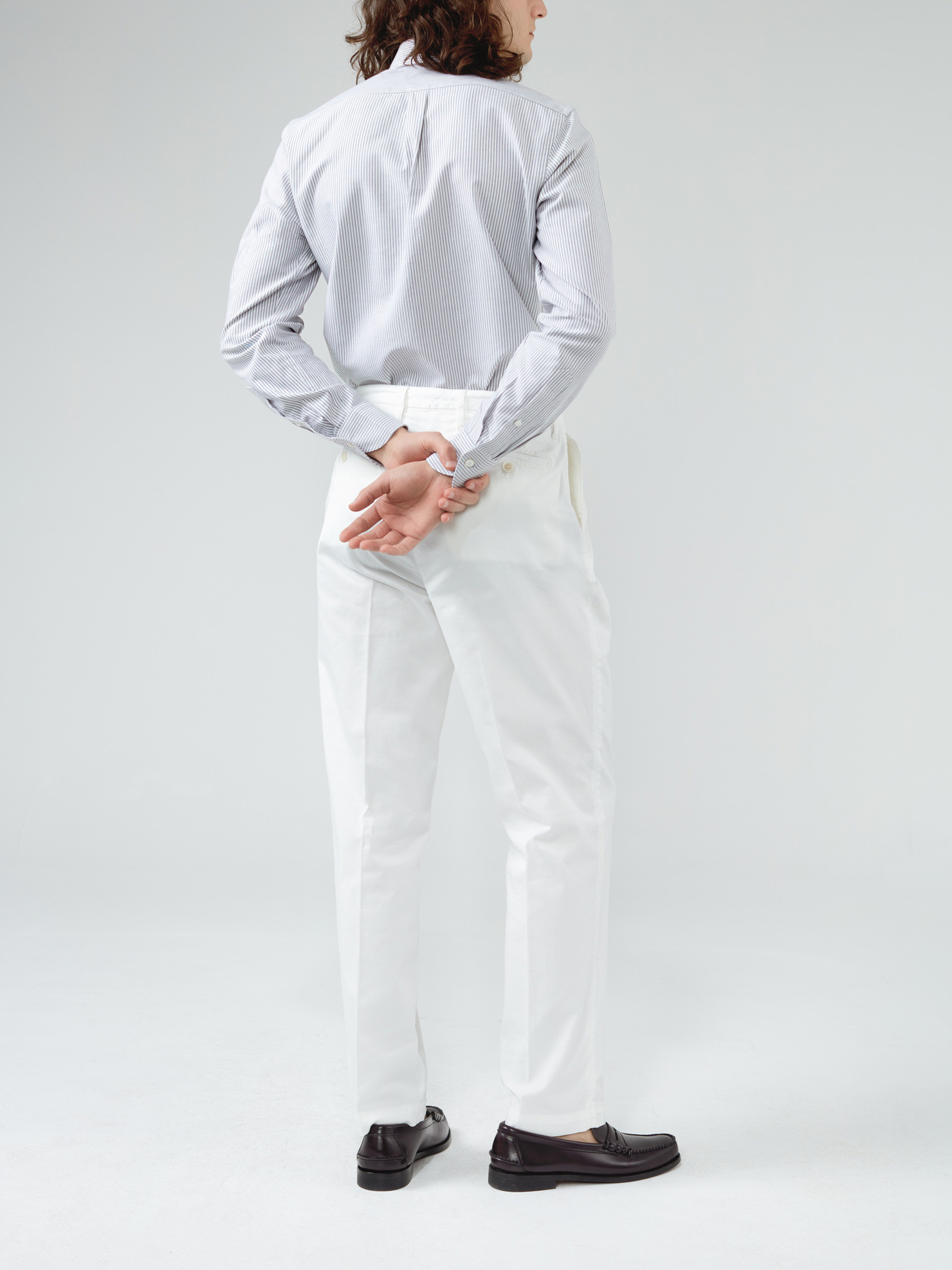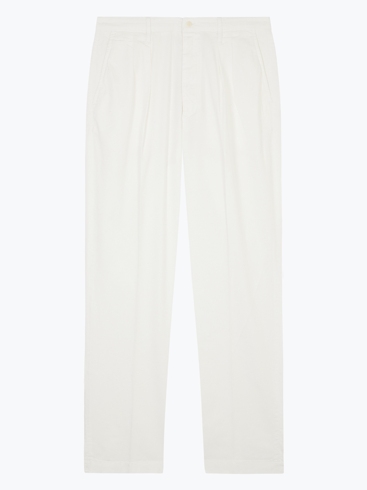 Chino classique, toile d'été, doubles pinces intérieures, poches latérales obliques, poche arrière à passepoils et boutonnées, boutons en corozo, ourlet simple.