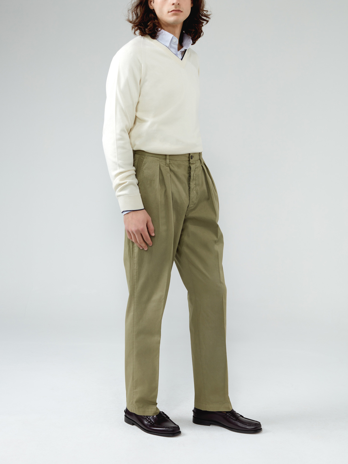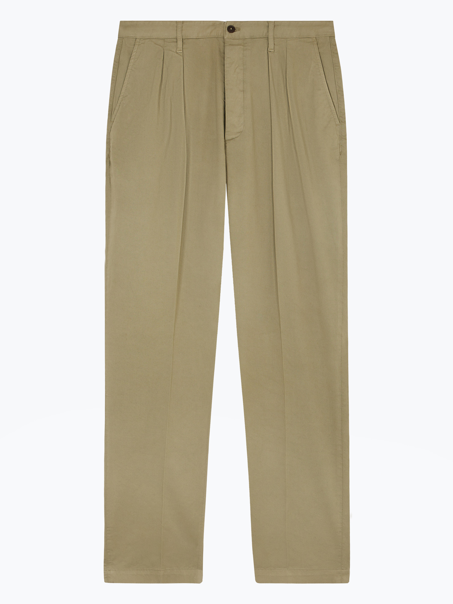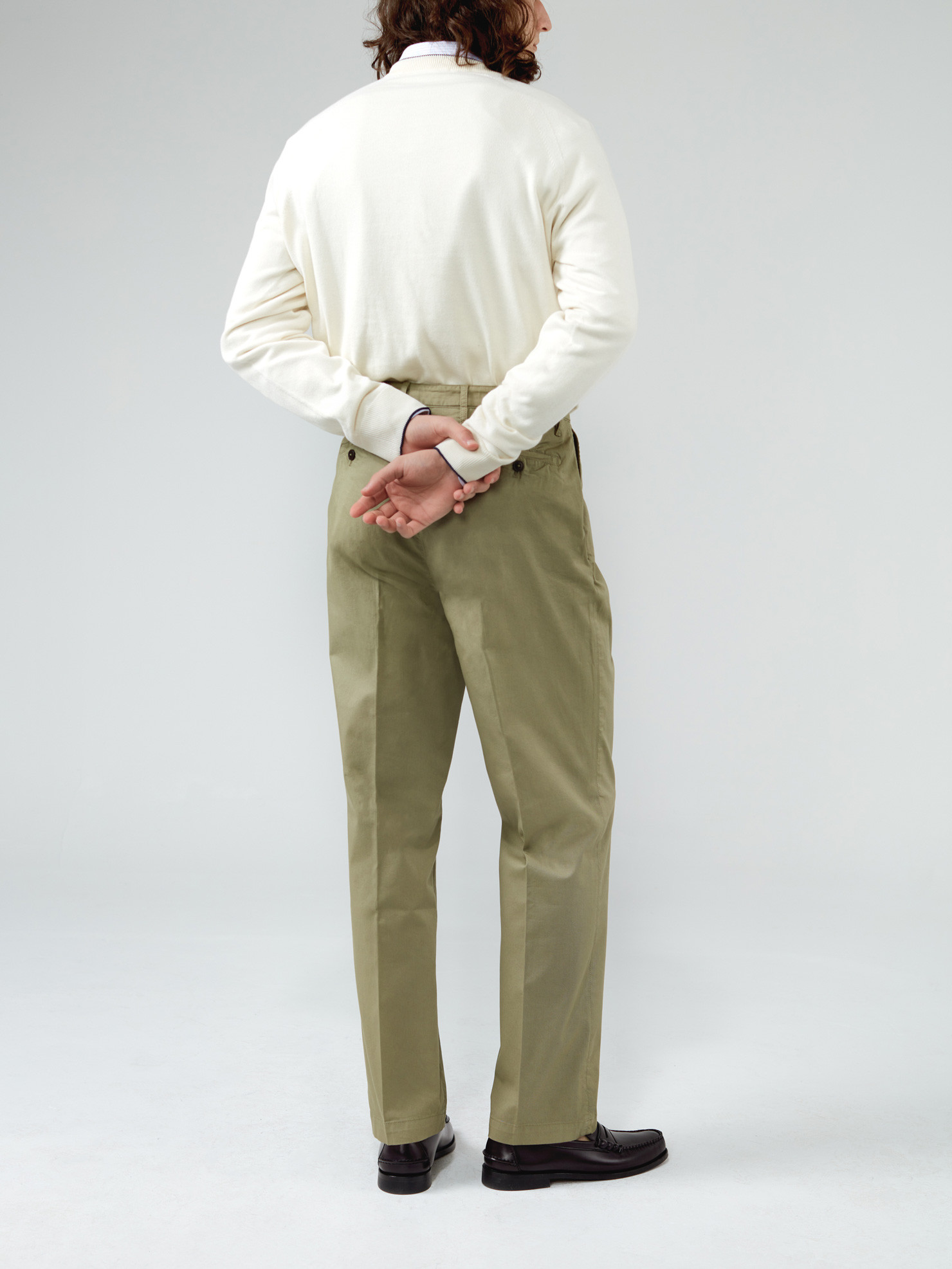 Chino classique, toile d'été, doubles pinces intérieures, poches latérales obliques, poche arrière à passepoils et boutonnées, boutons en corozo, ourlet simple.