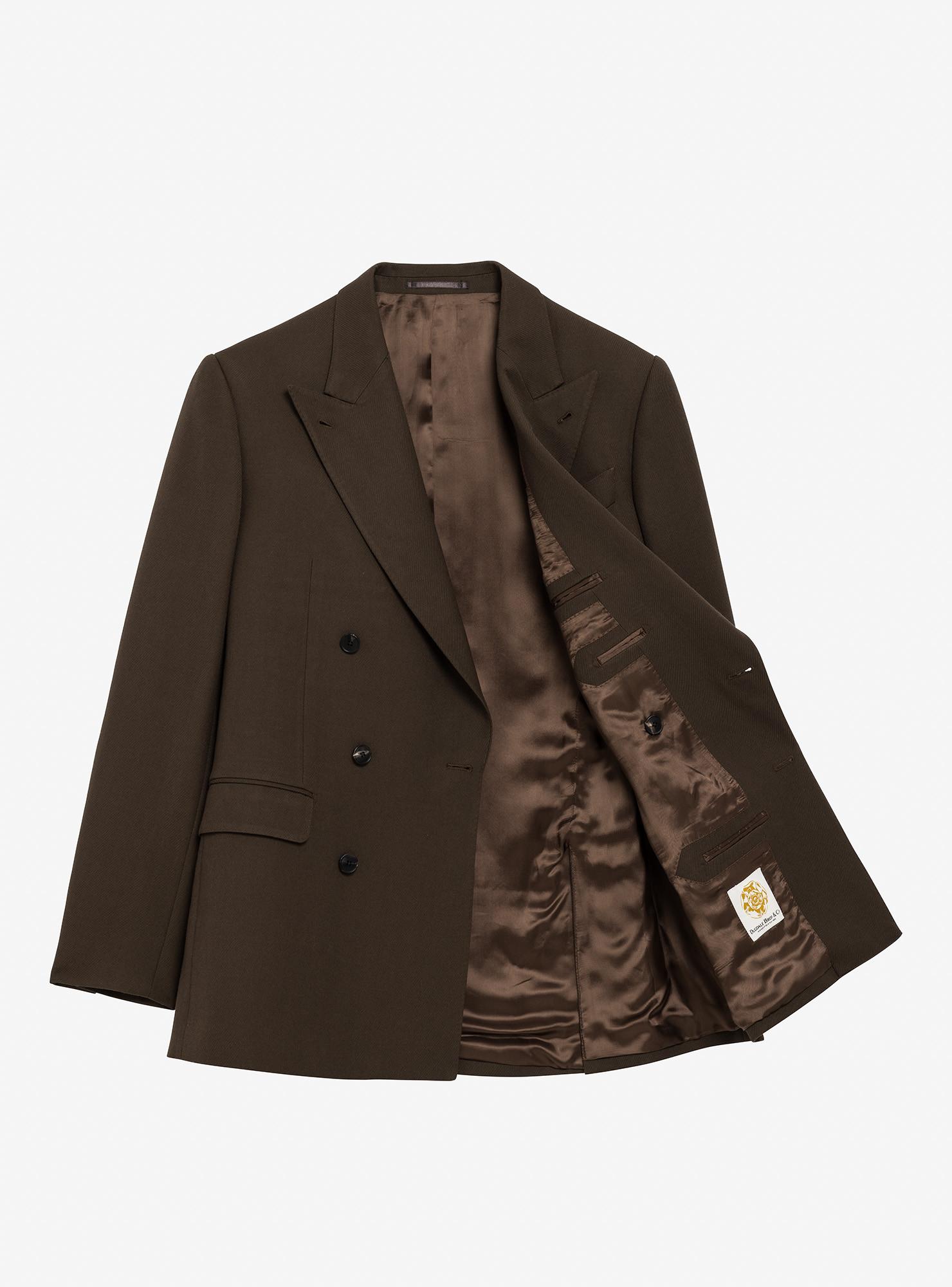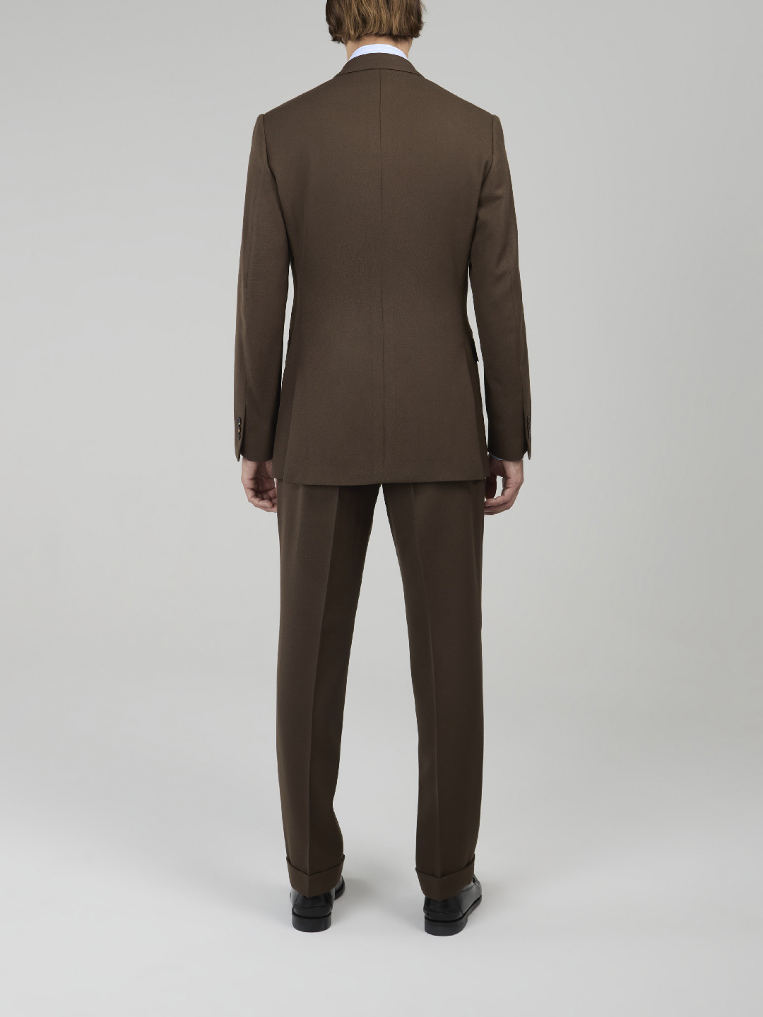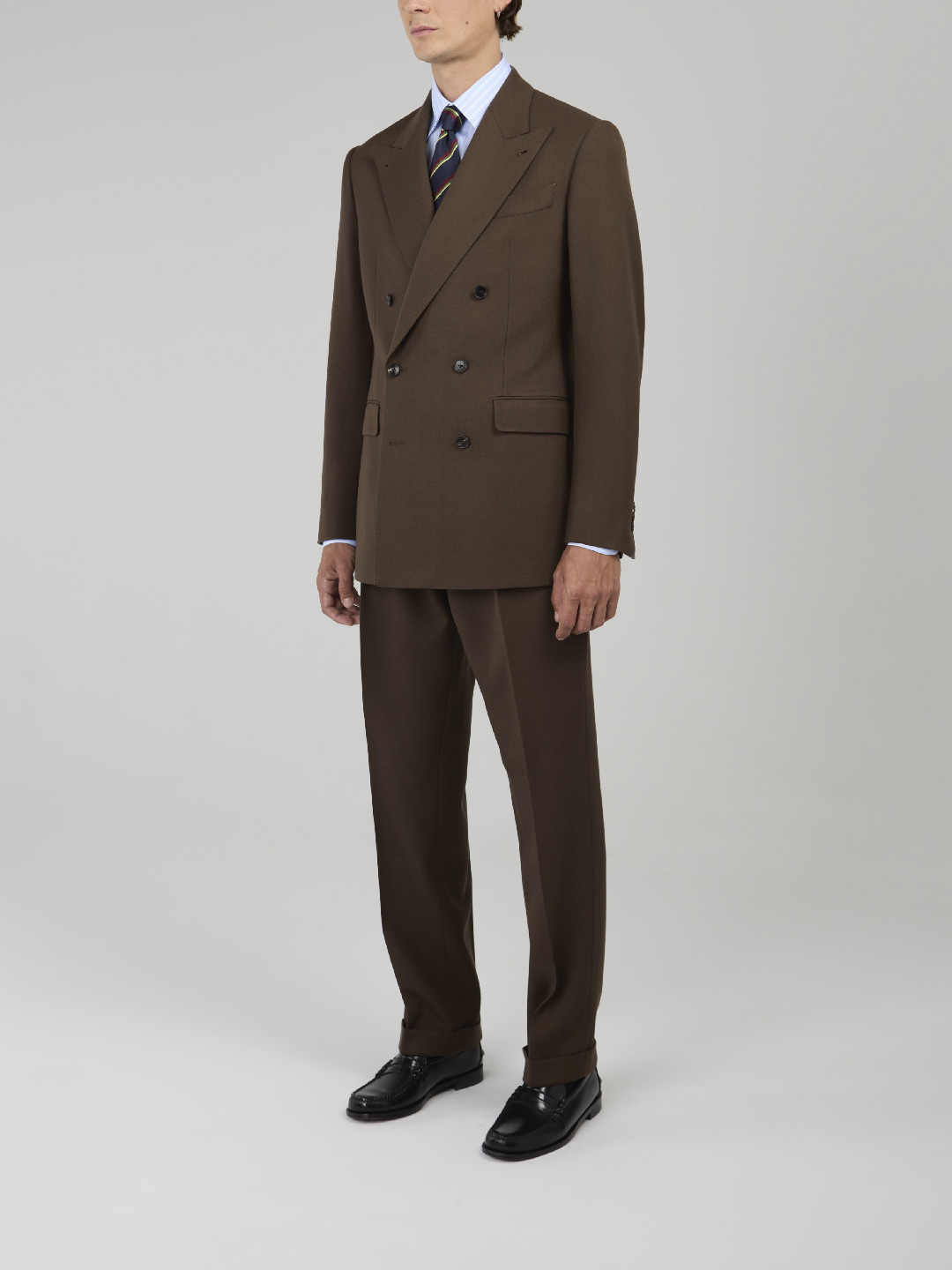 Costume croisé 6 boutons en Cavalry Twill Marron. Montage traditionnel , épaules avec épaulettes formées, poches latérales à rabat droit, deux fentes dos, doublure intérieure entièrement doublée. Pantalon avec passants de ceinture, deux pinces intérieures, bas revers de 4cm.