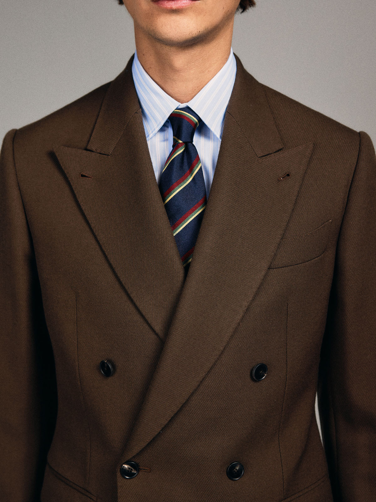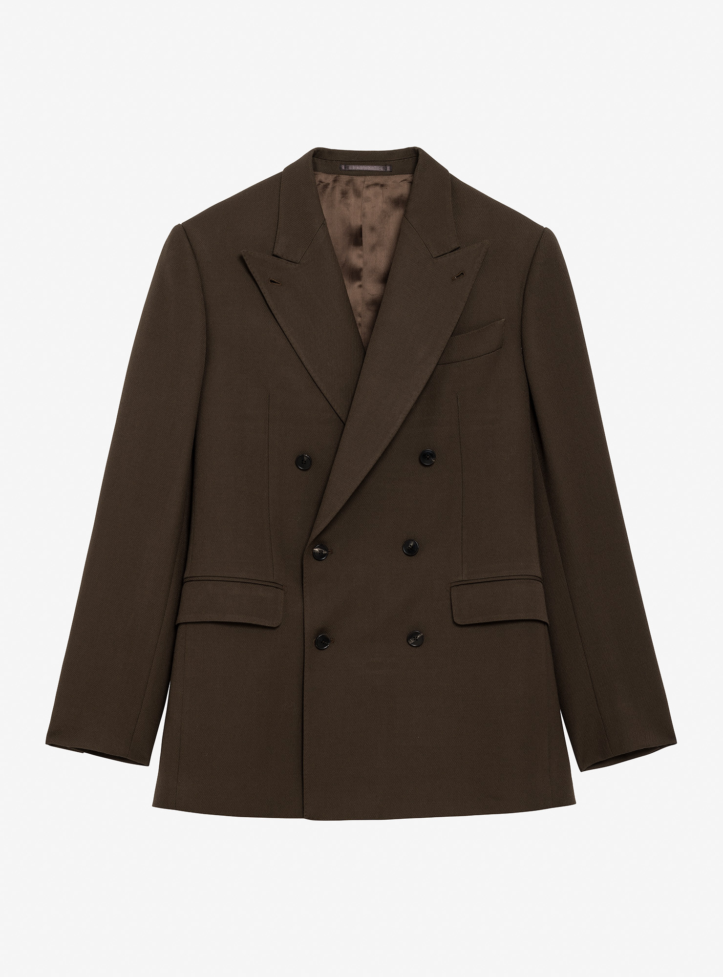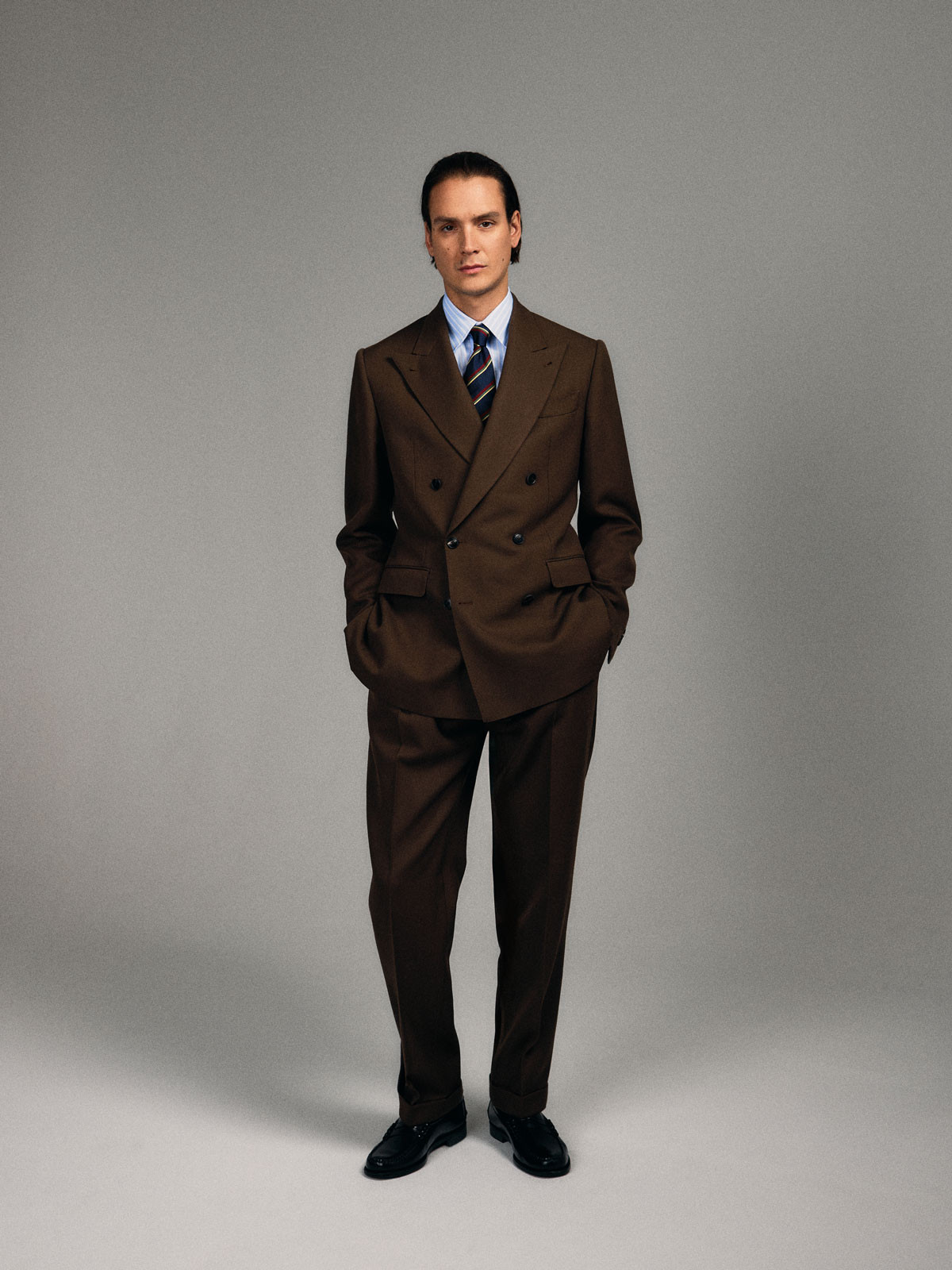 Costume croisé 6 boutons en Cavalry Twill Marron. Montage traditionnel , épaules avec épaulettes formées, poches latérales à rabat droit, deux fentes dos, doublure intérieure entièrement doublée. Pantalon avec passants de ceinture, deux pinces intérieures, bas revers de 4cm.