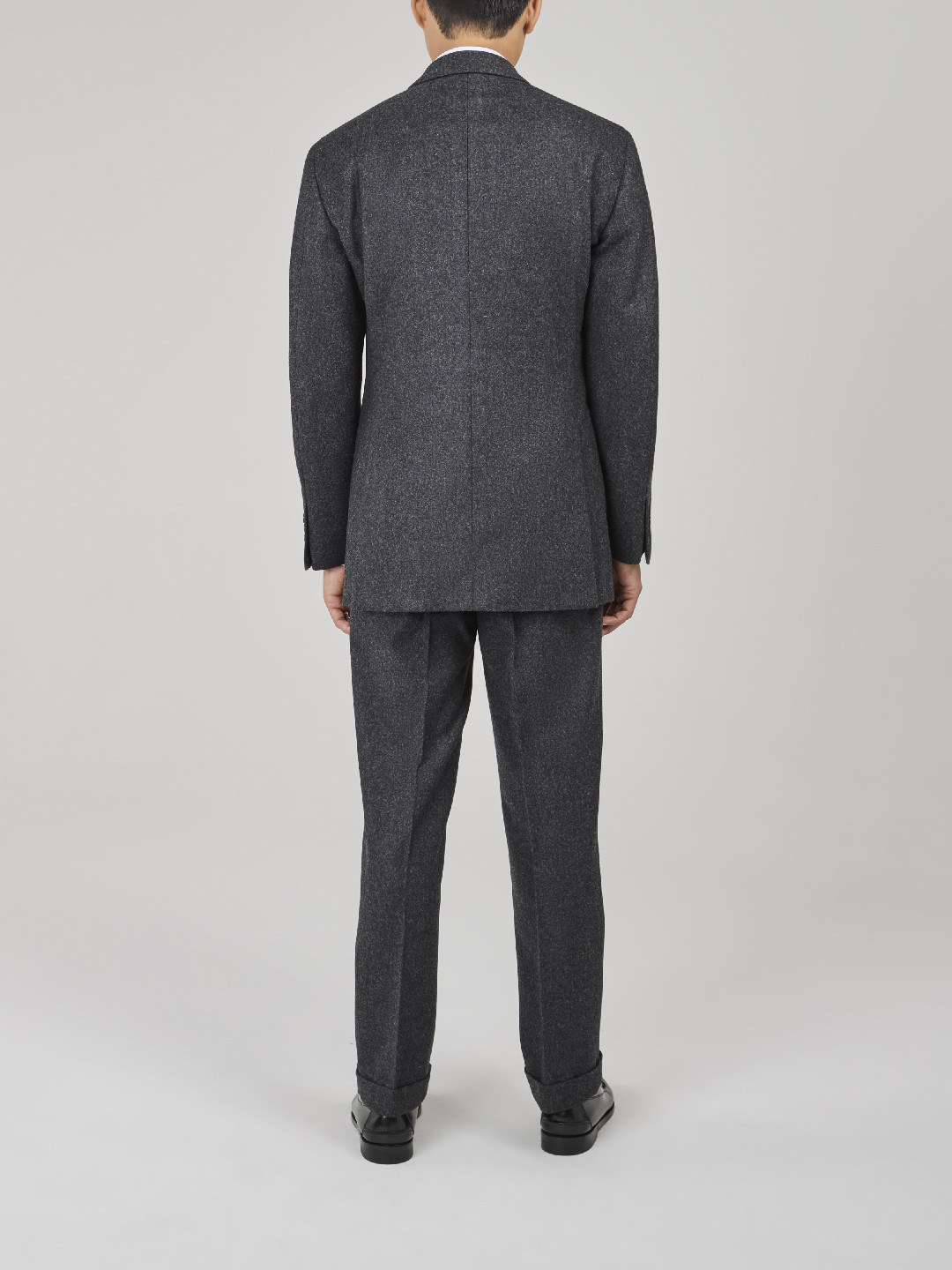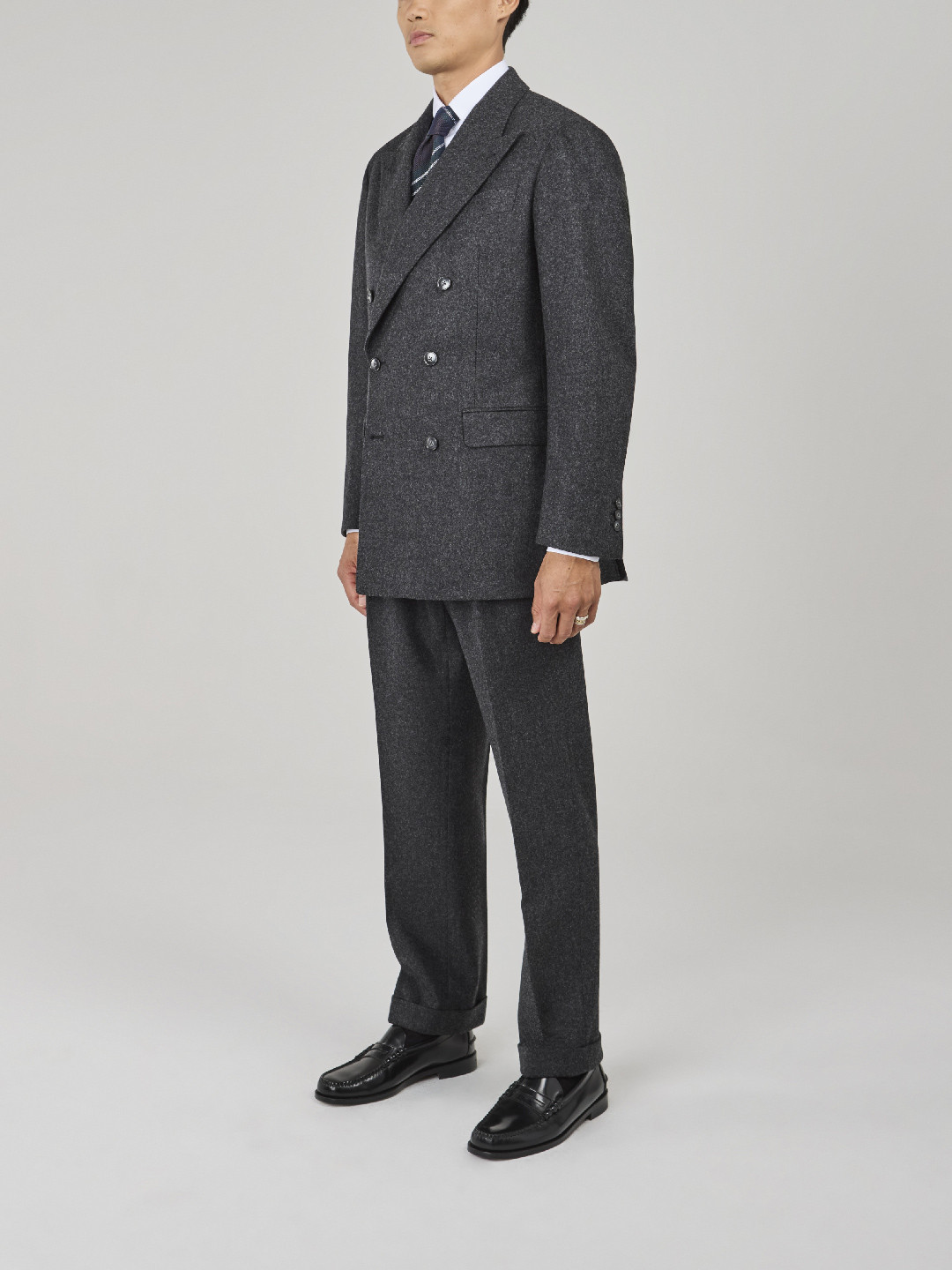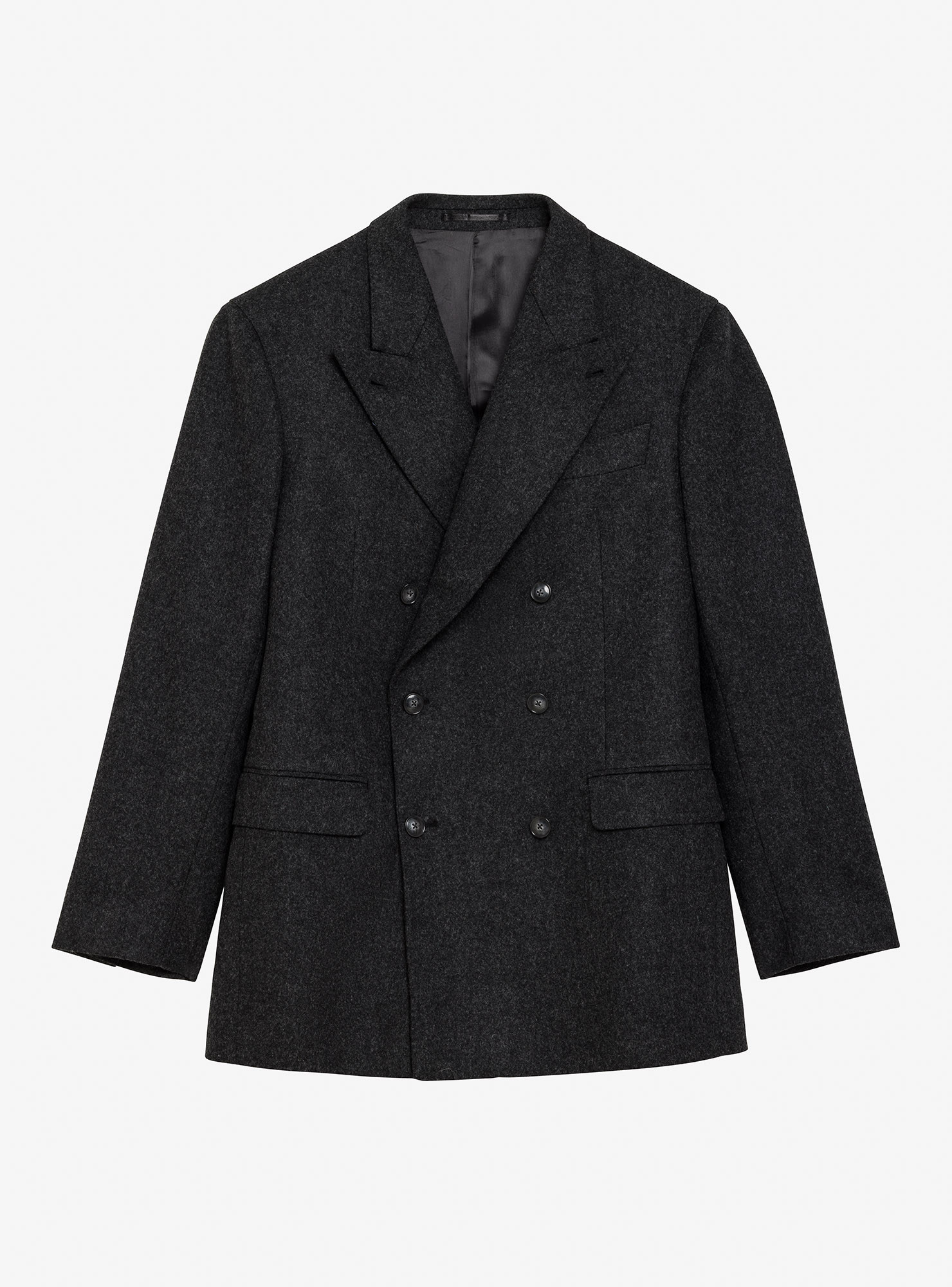 Costume croisé 6 boutons en Flanelle épaisse Gris. Montage traditionnel , épaules soft avec AMF, poches latérales à rabat droit, deux fentes dos, doublure intérieure entièrement doublée. Pantalon avec pattes de serrages, deux pinces intérieures, bas revers de 4cm.