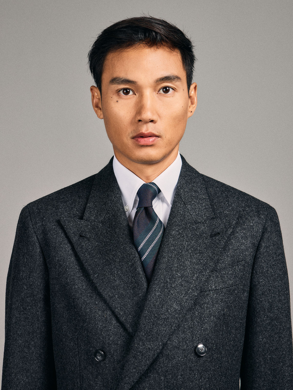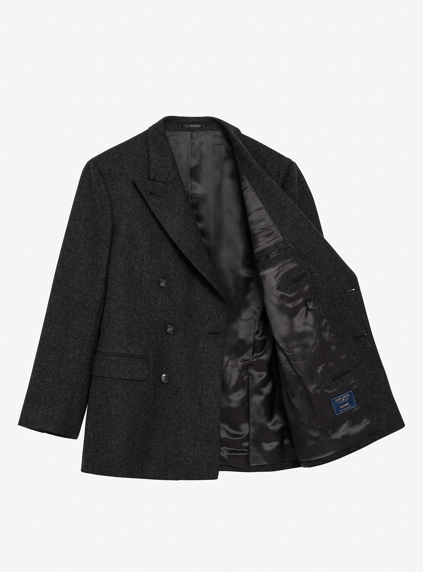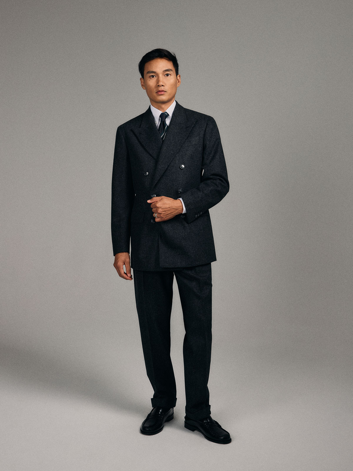 Costume croisé 6 boutons en Flanelle épaisse Gris. Montage traditionnel , épaules soft avec AMF, poches latérales à rabat droit, deux fentes dos, doublure intérieure entièrement doublée. Pantalon avec pattes de serrages, deux pinces intérieures, bas revers de 4cm.