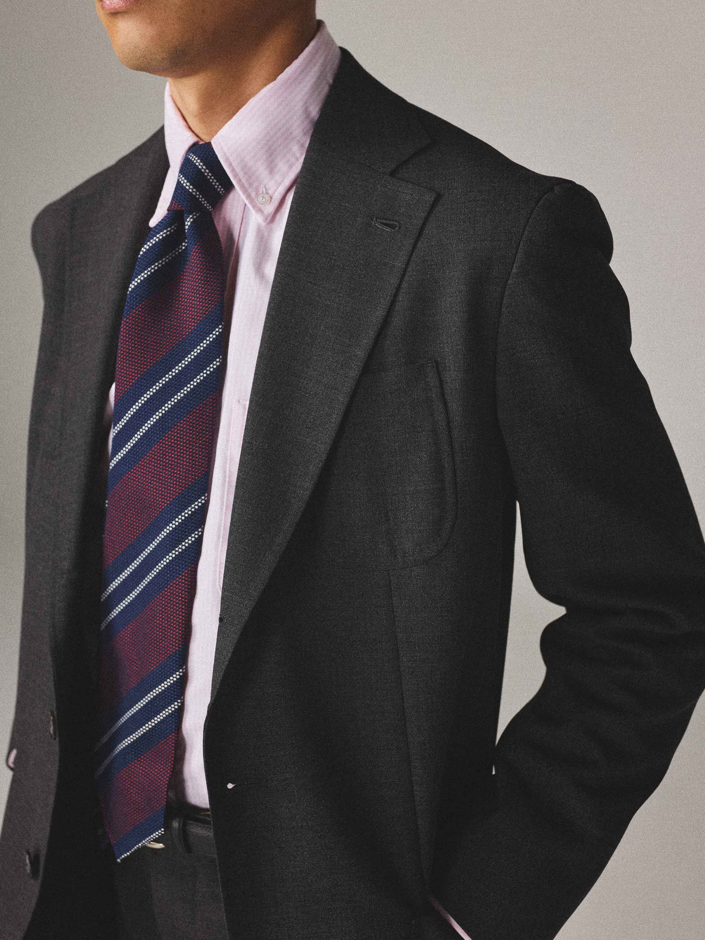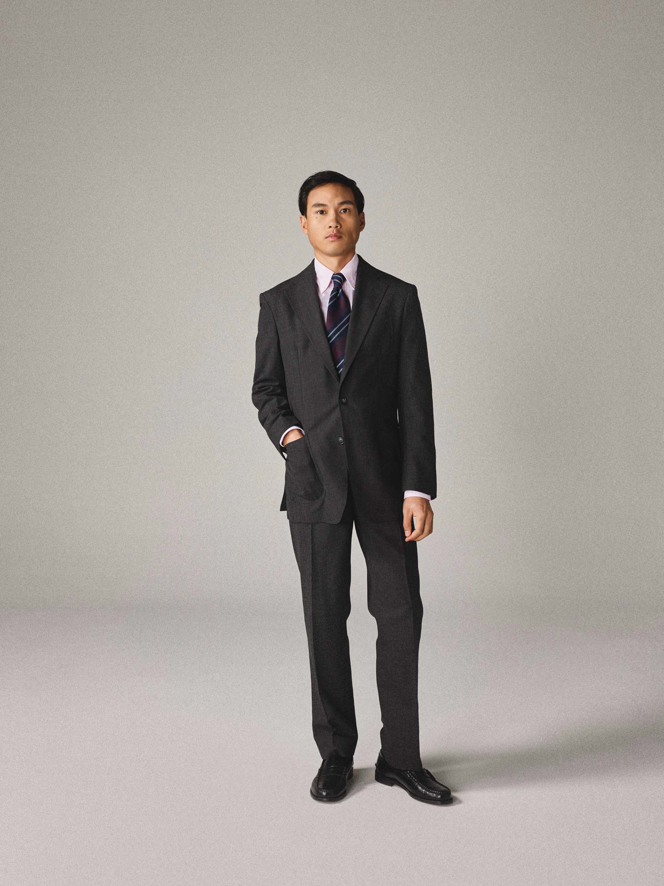 Costume droit 2,5 boutons en Fresco gris moyen. Montage non construit, épaules sans épaulettes , poche poitrine plaquée droite, poches latérales plaquées droites, 2 fentes dos, doublure intérieure non doublée. Pantalon à passants de ceintures, 1sans pinces, bas simple sans revers.